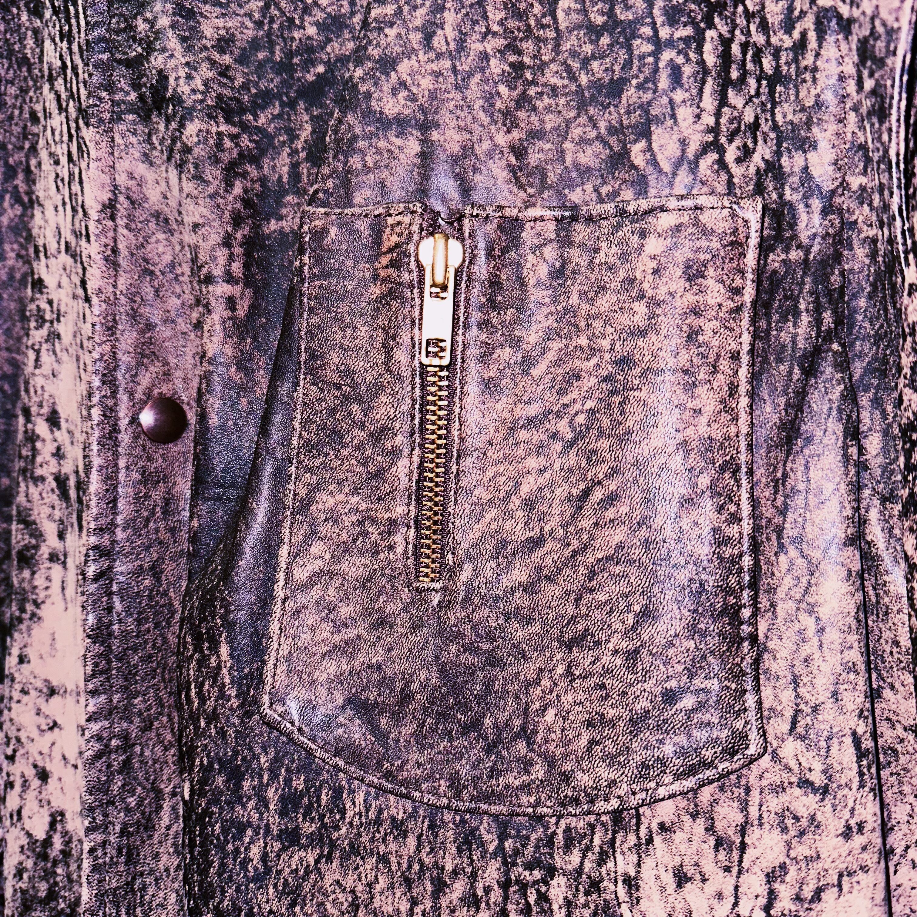 エレファントパターンで独特な光沢感、少し荒々しさを感じるレザー本来の野生味溢れるが柄から表現されているレザージャケット。