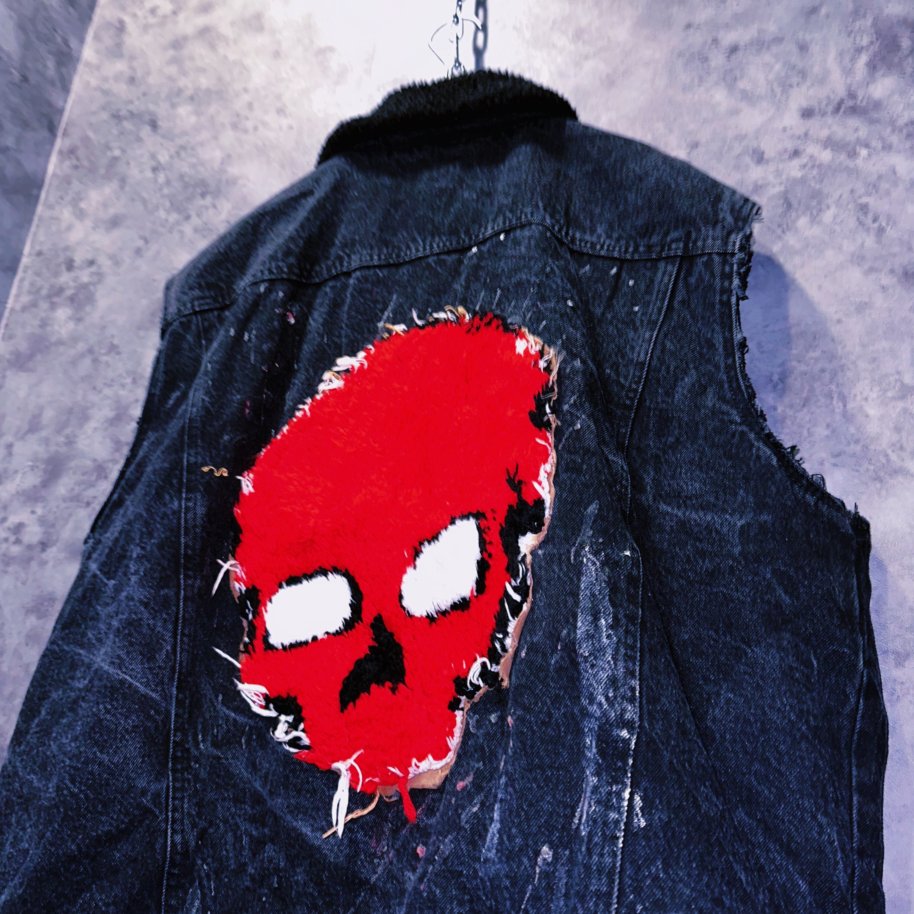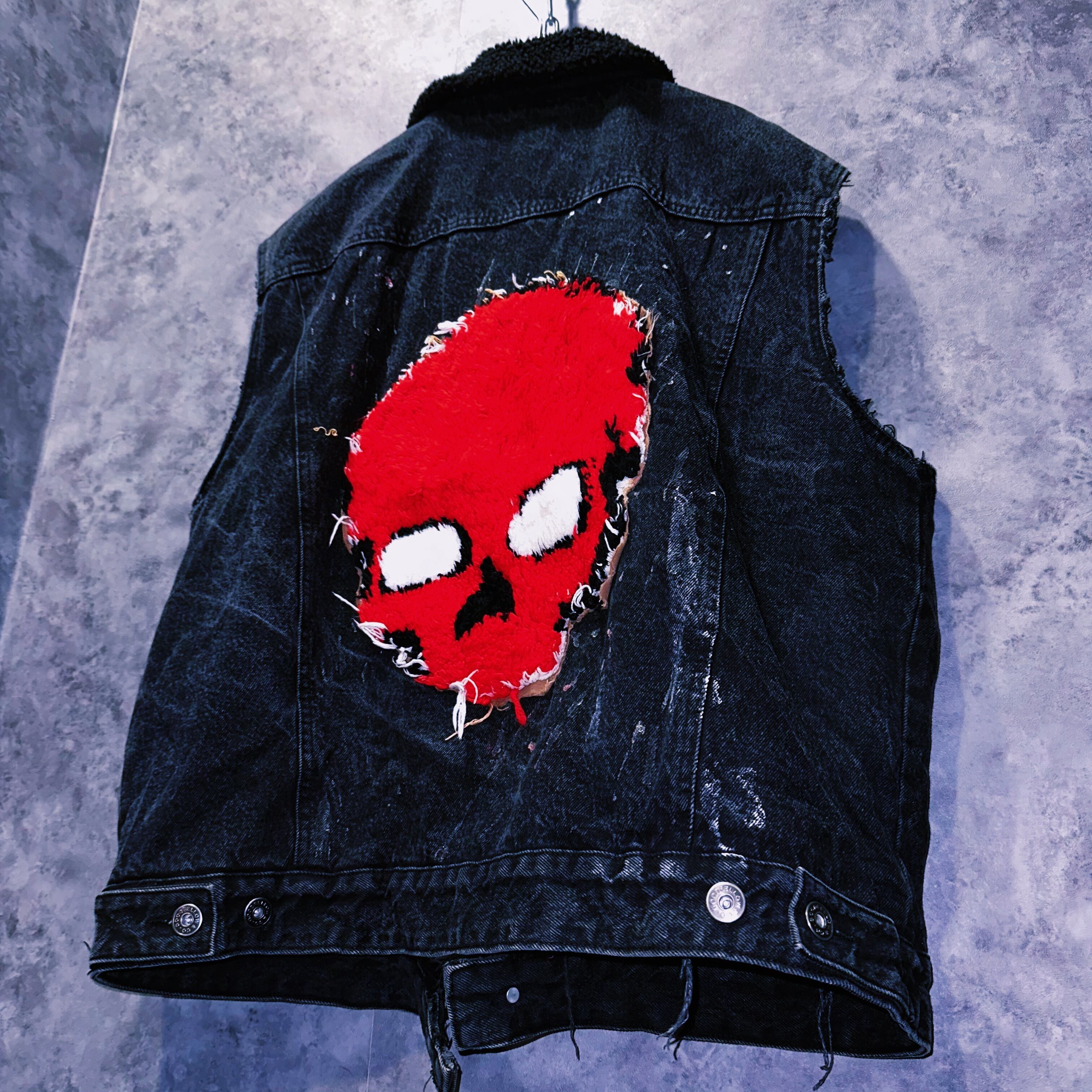 ブラックデニムベストにパイル素材のレッドスカルのワッペンがバックに施されて圧巻の存在感を放つ1着。所々にダメージデザインが施されておりY2K感もある極上の逸品。
