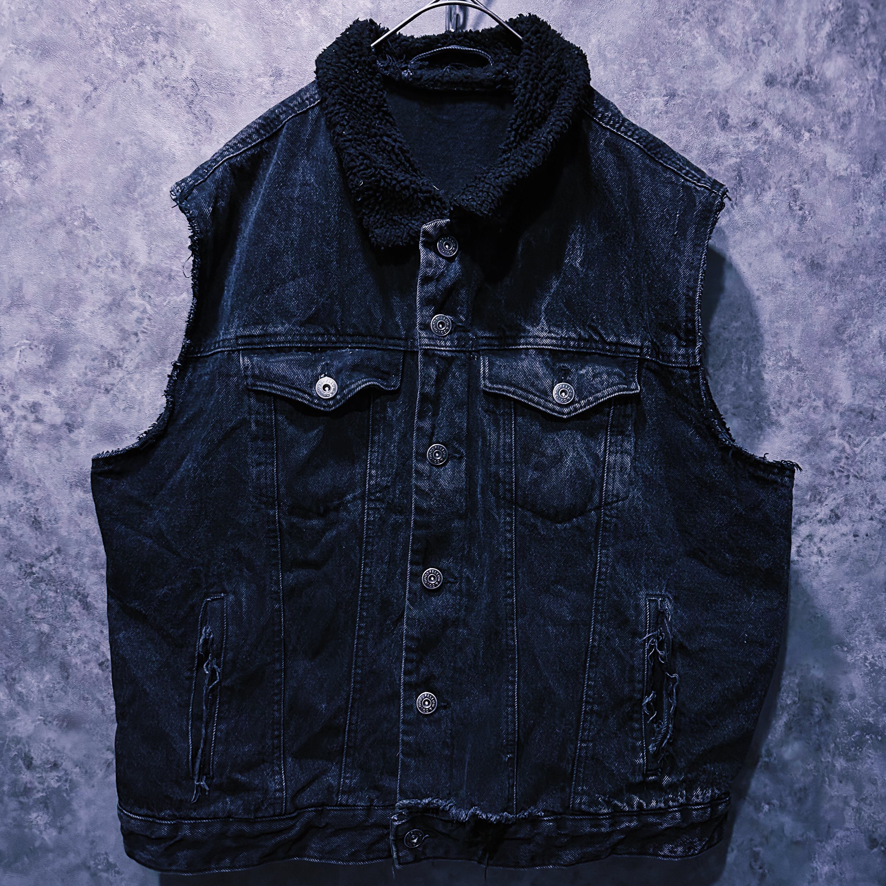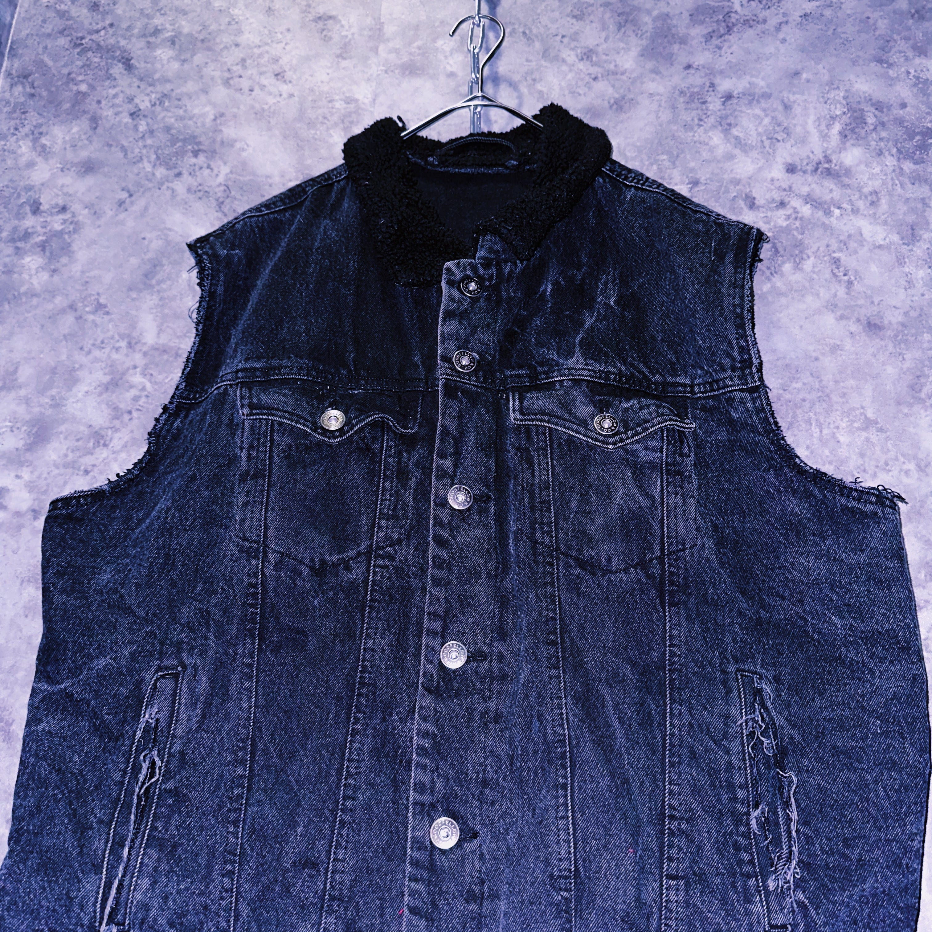ヴィンテージパイルスカルワッペンデザインボア×ダメージブラックデニムベスト