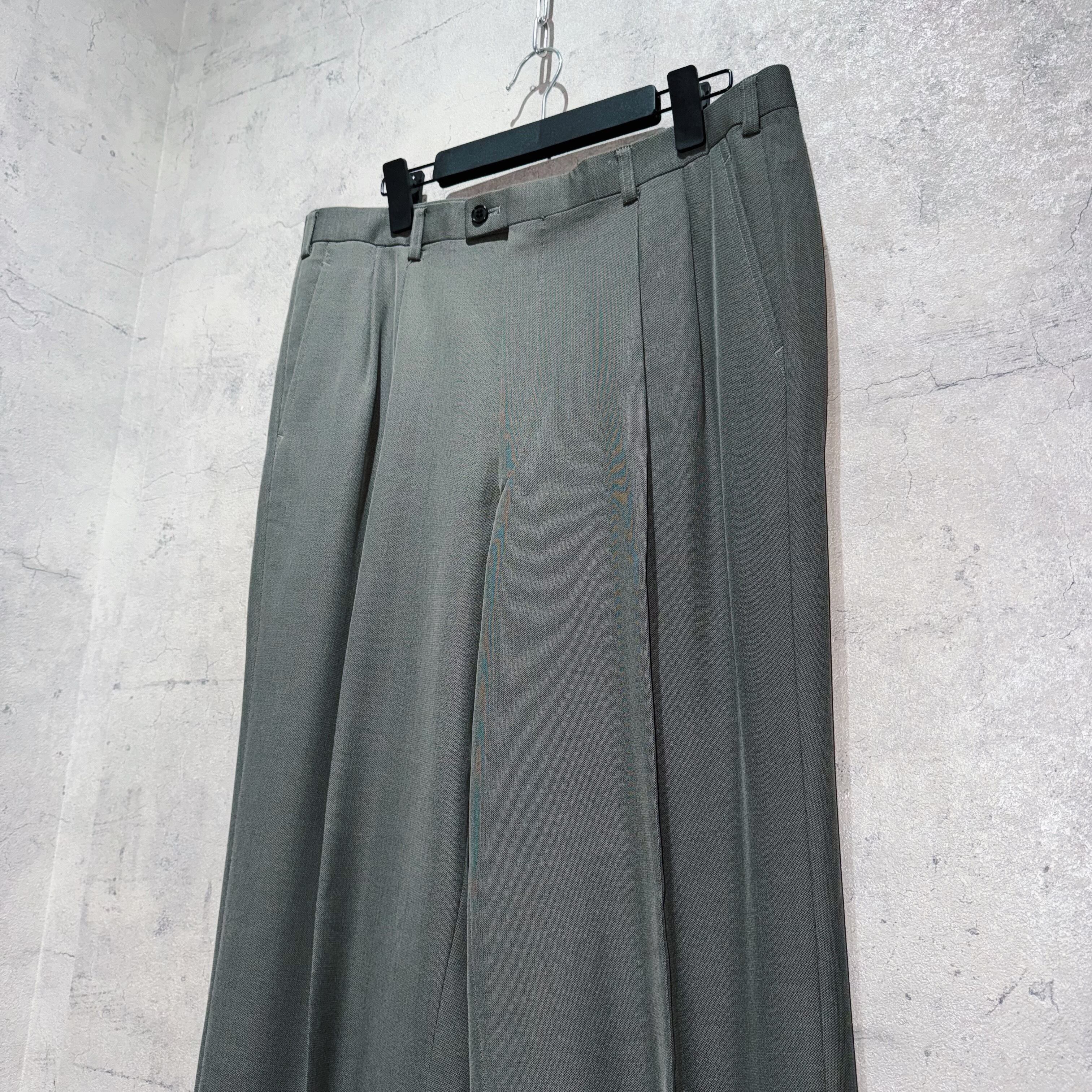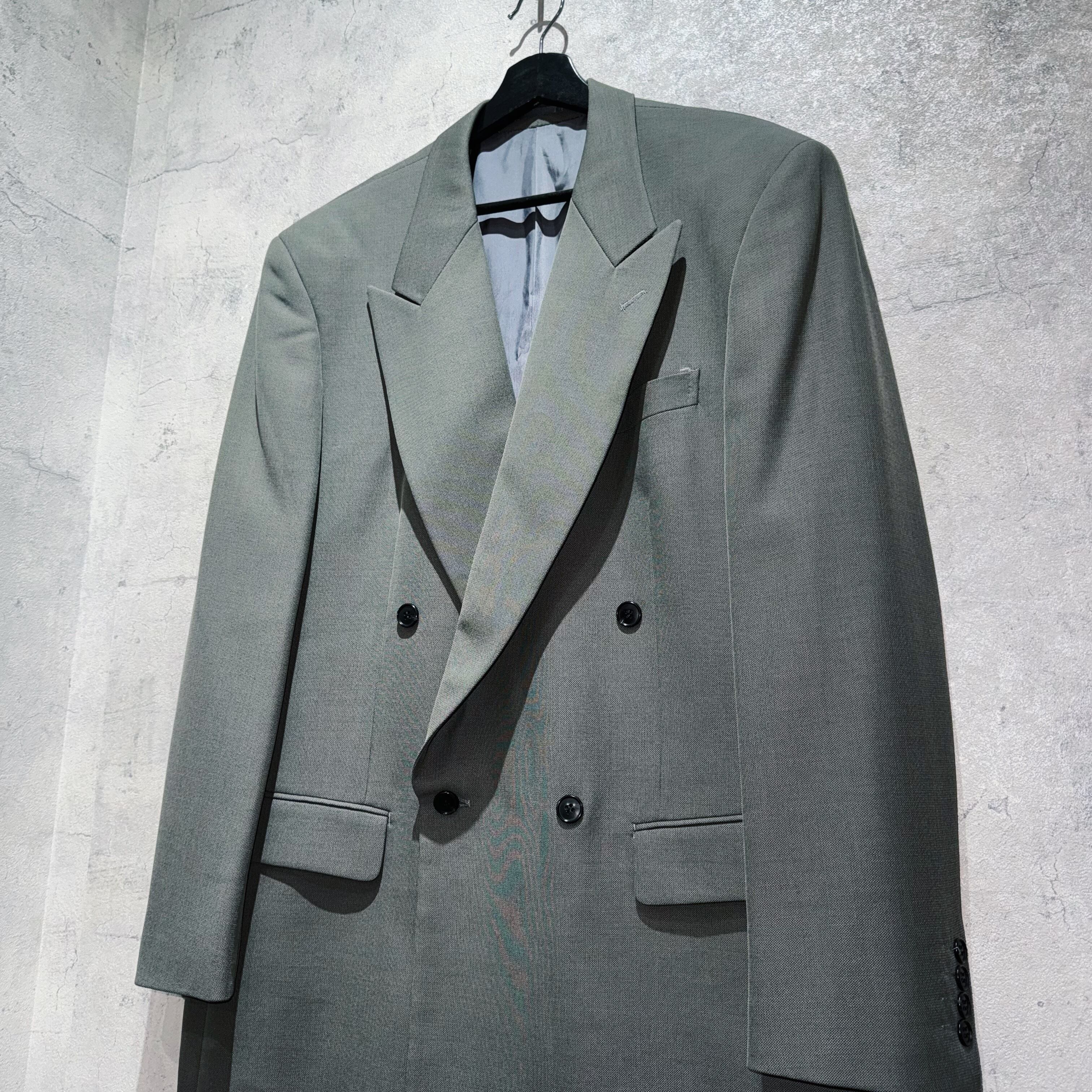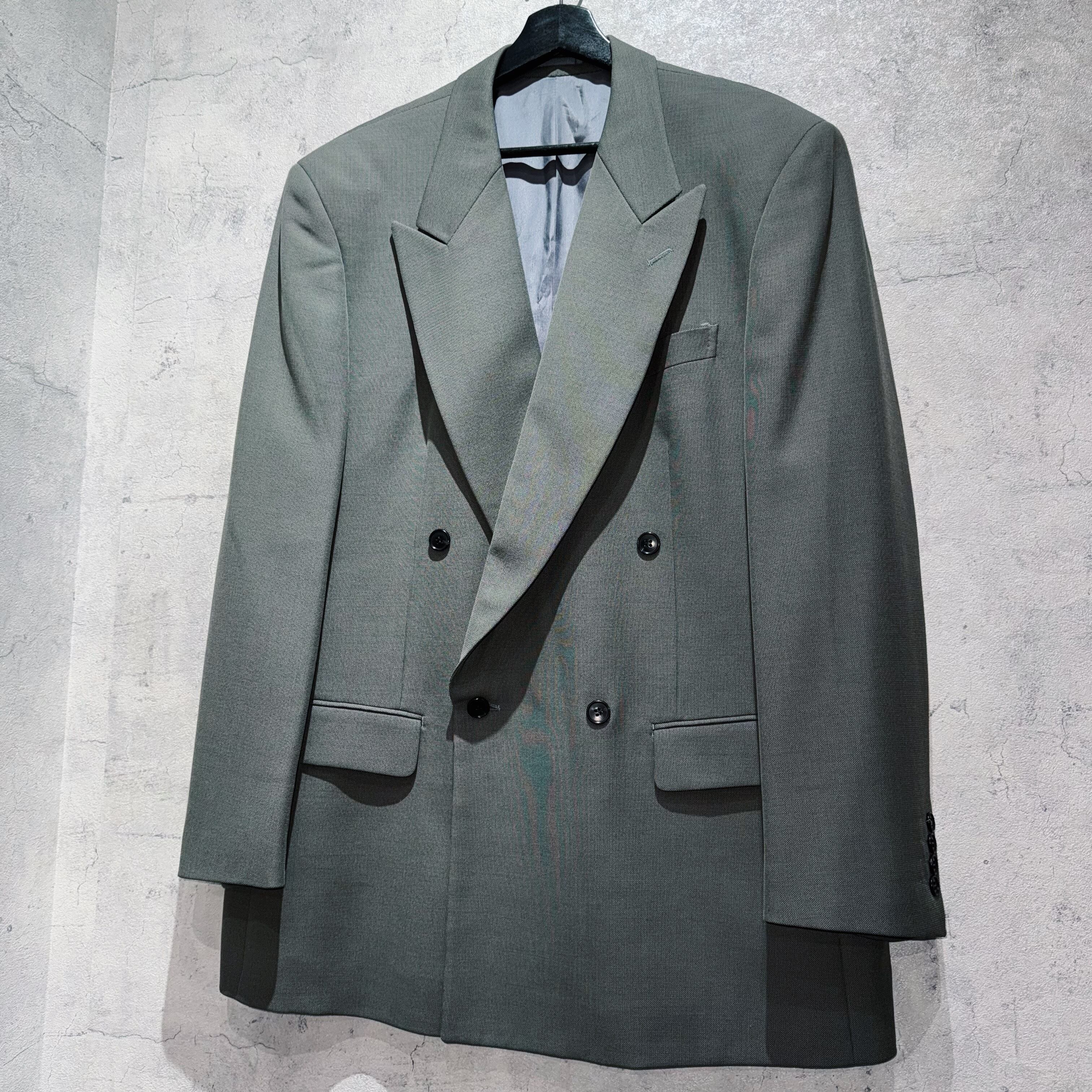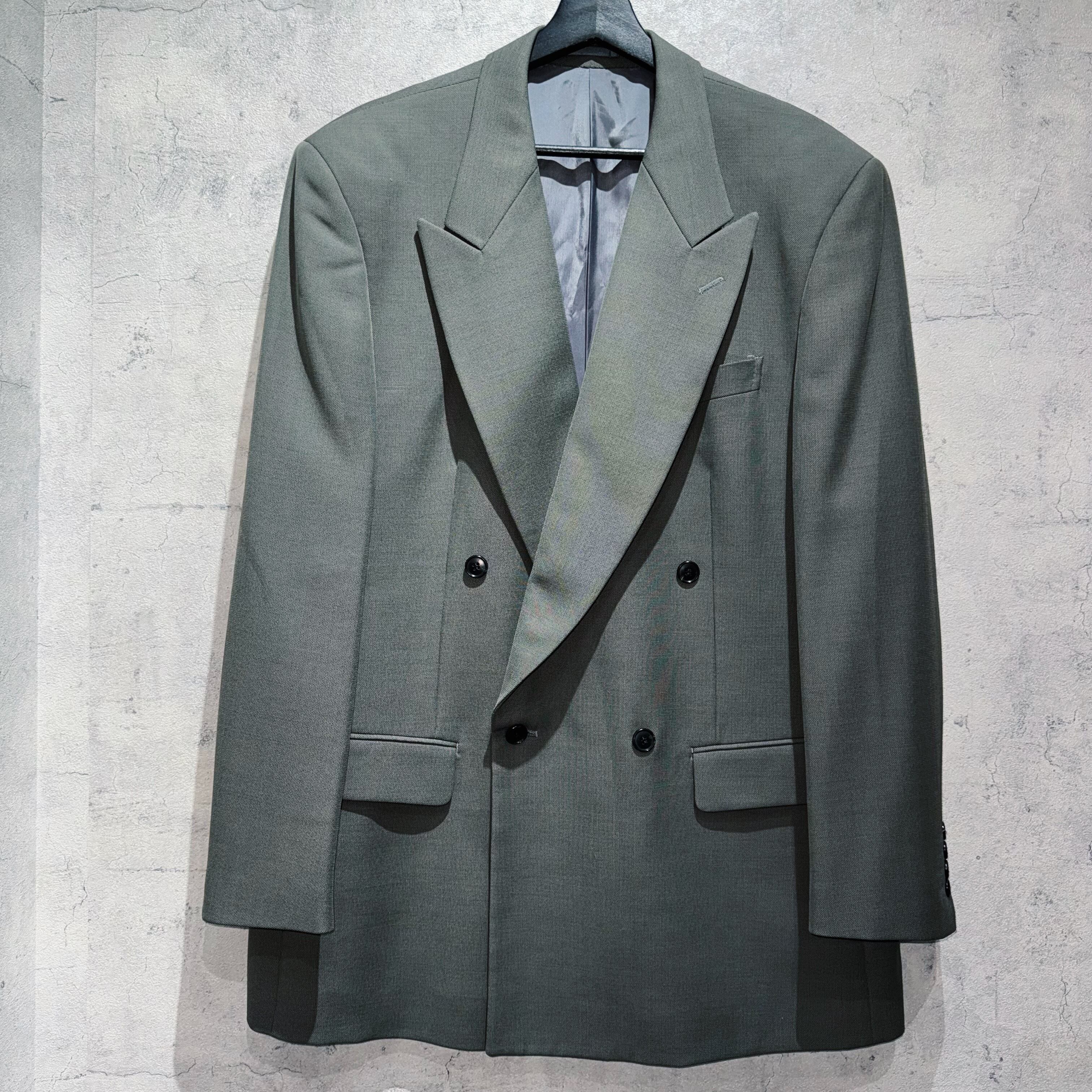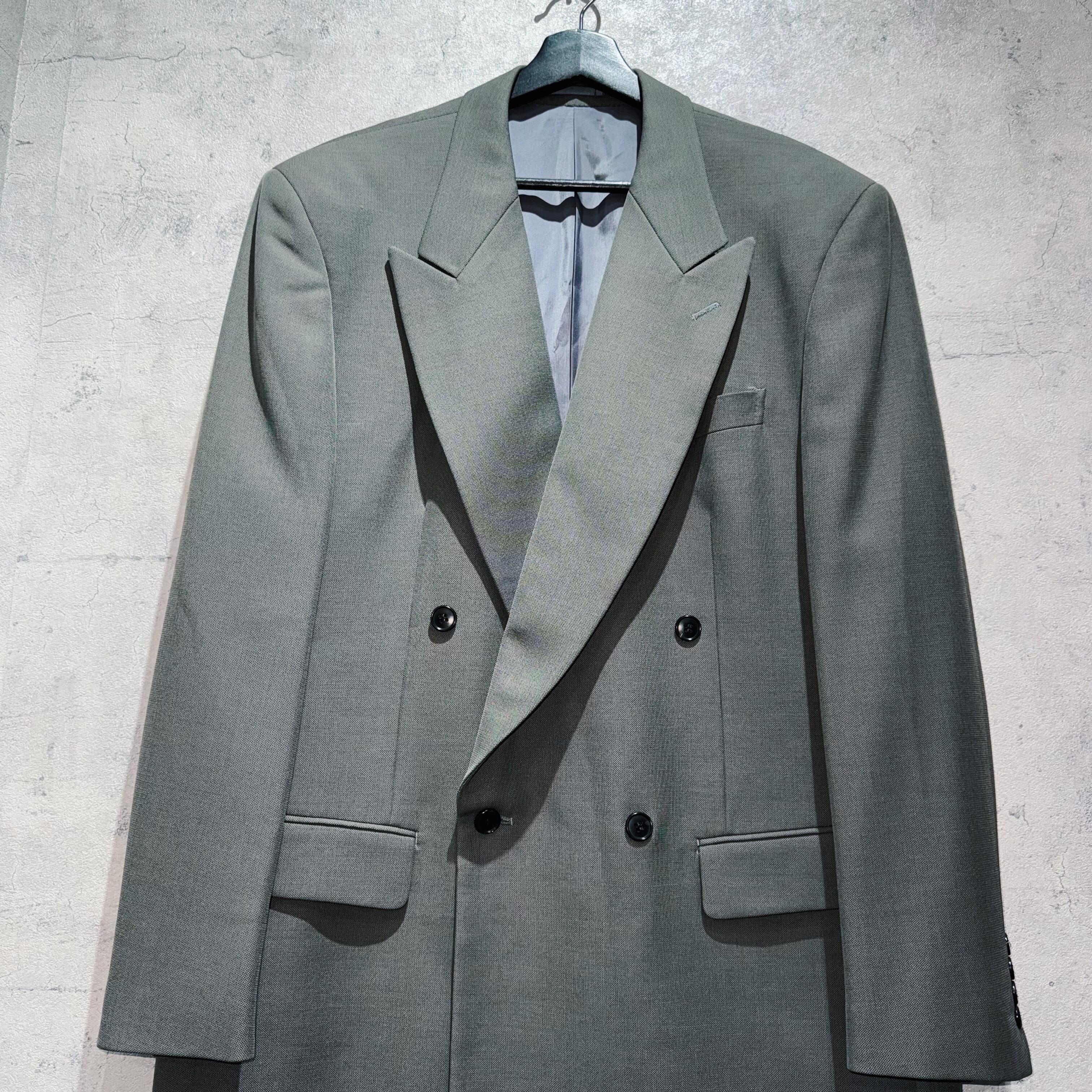 4Bのダブルブレストに加え美しいカーブを描いたピークドラペル、無骨な存在感を放つジャケットは圧巻の佇まい。テーパードの効いた太めのトラウザーズは単体としても活躍してくれるかと。