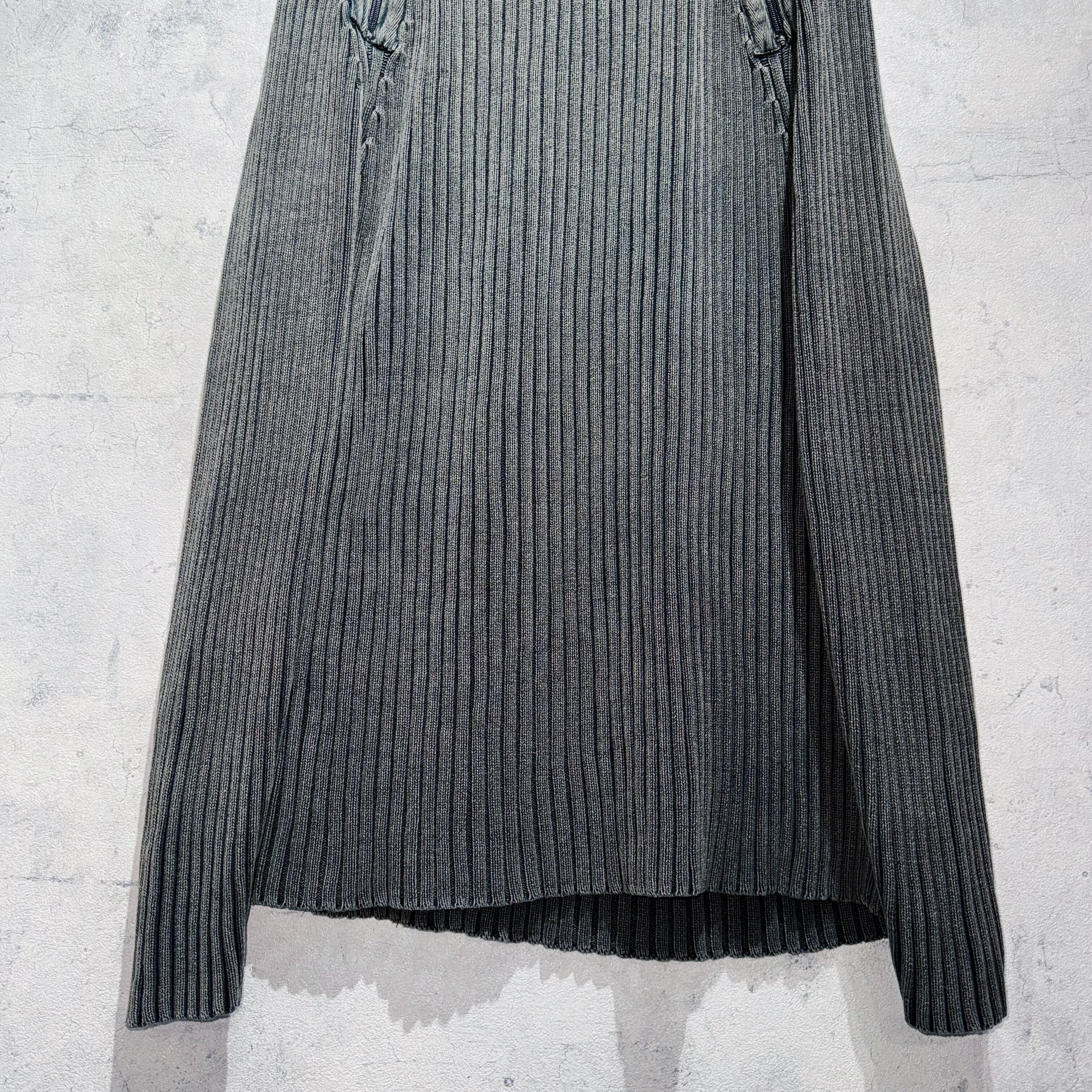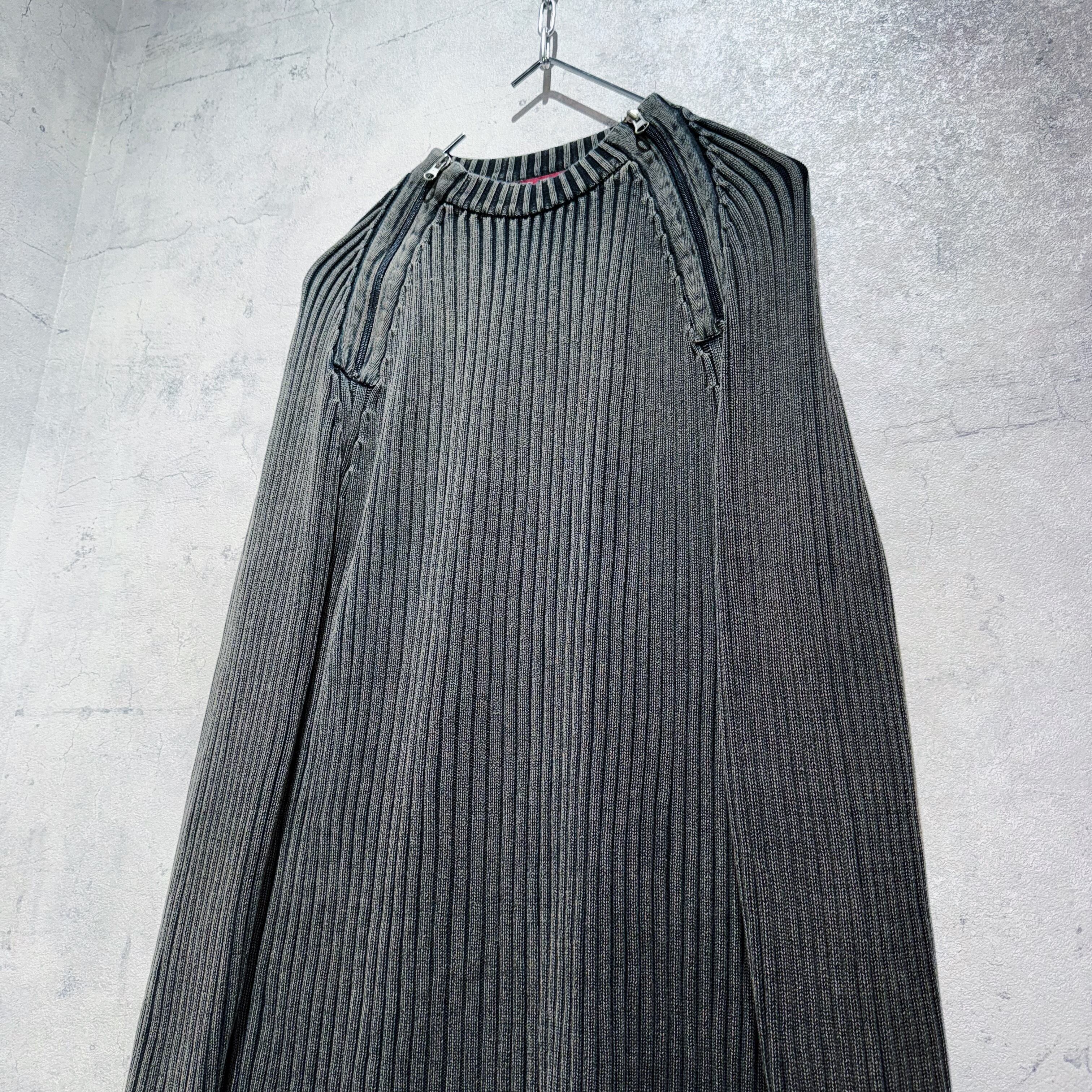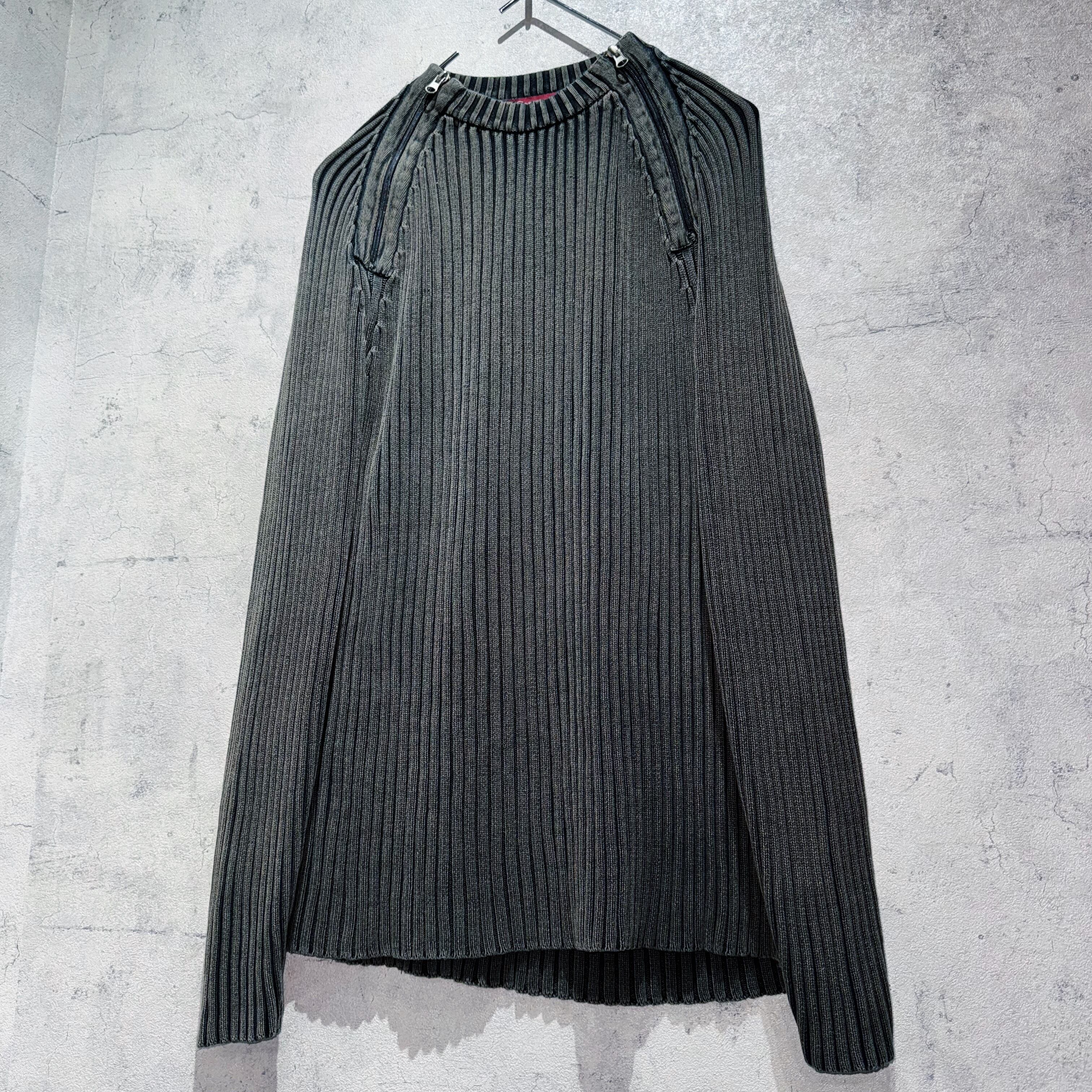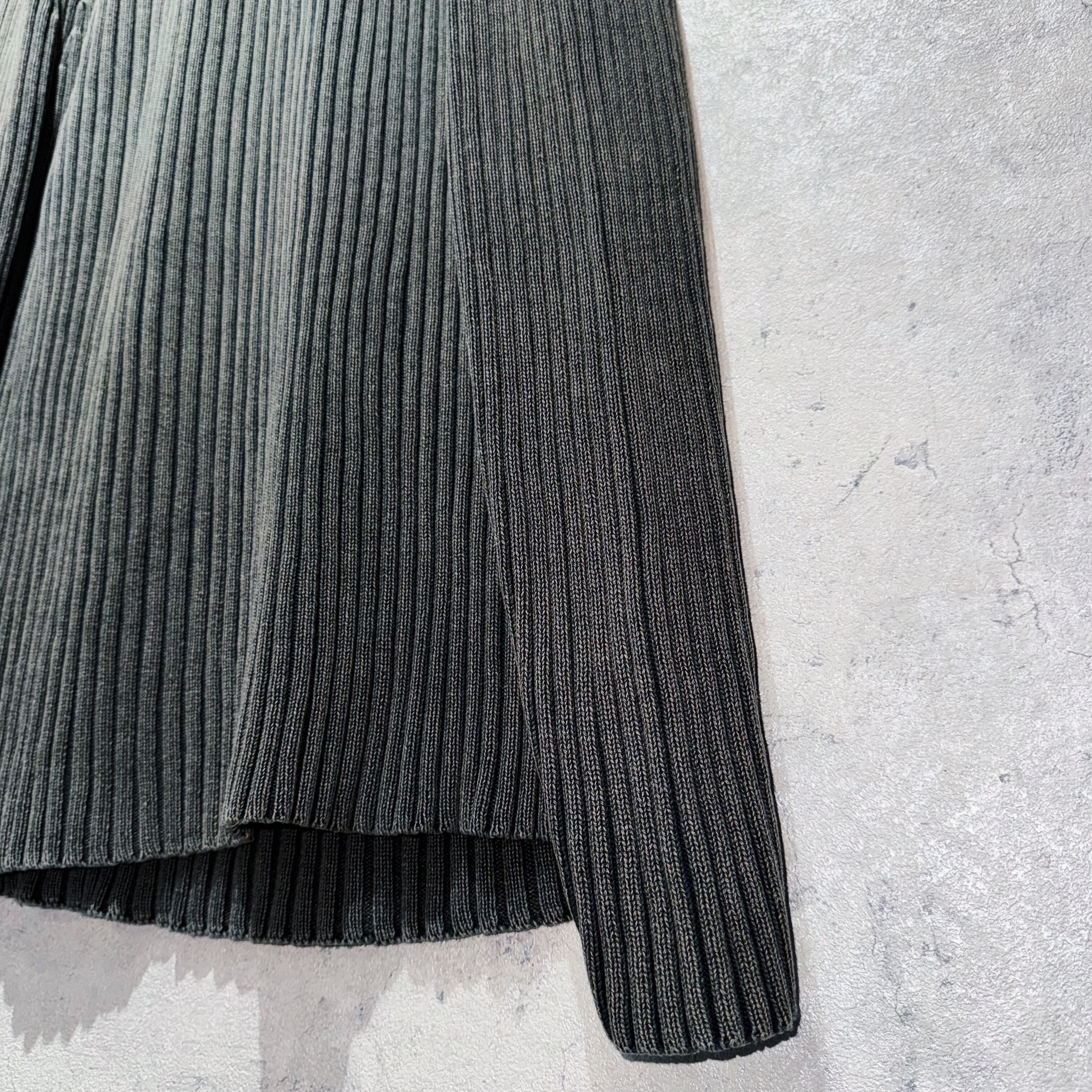 渋さのあるカーキカラーを身に纏ったプルオーバータイプのドライバーズニット。首元の両サイド側にジップが施されており、少しパンクでエッジの効いた仕上がりに。