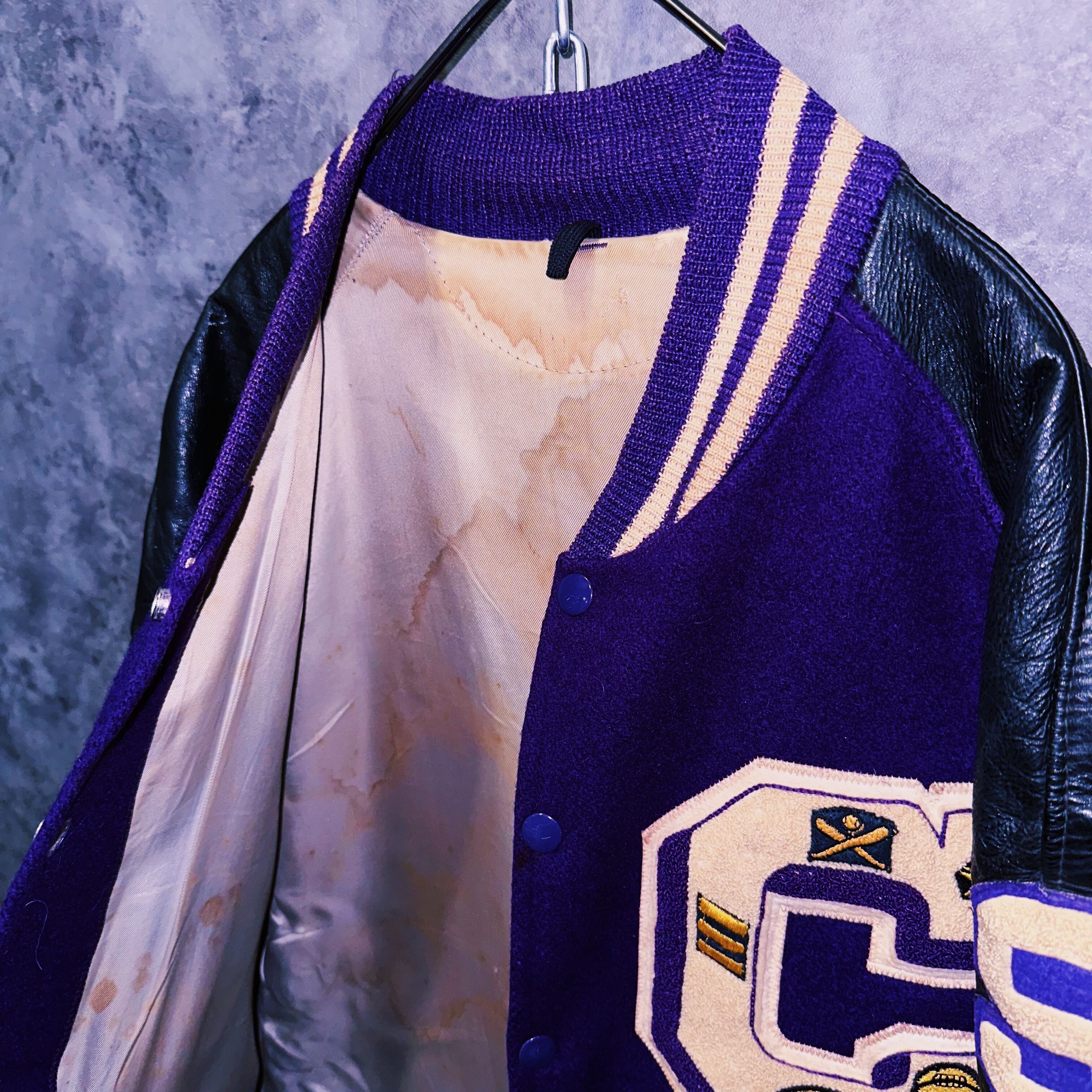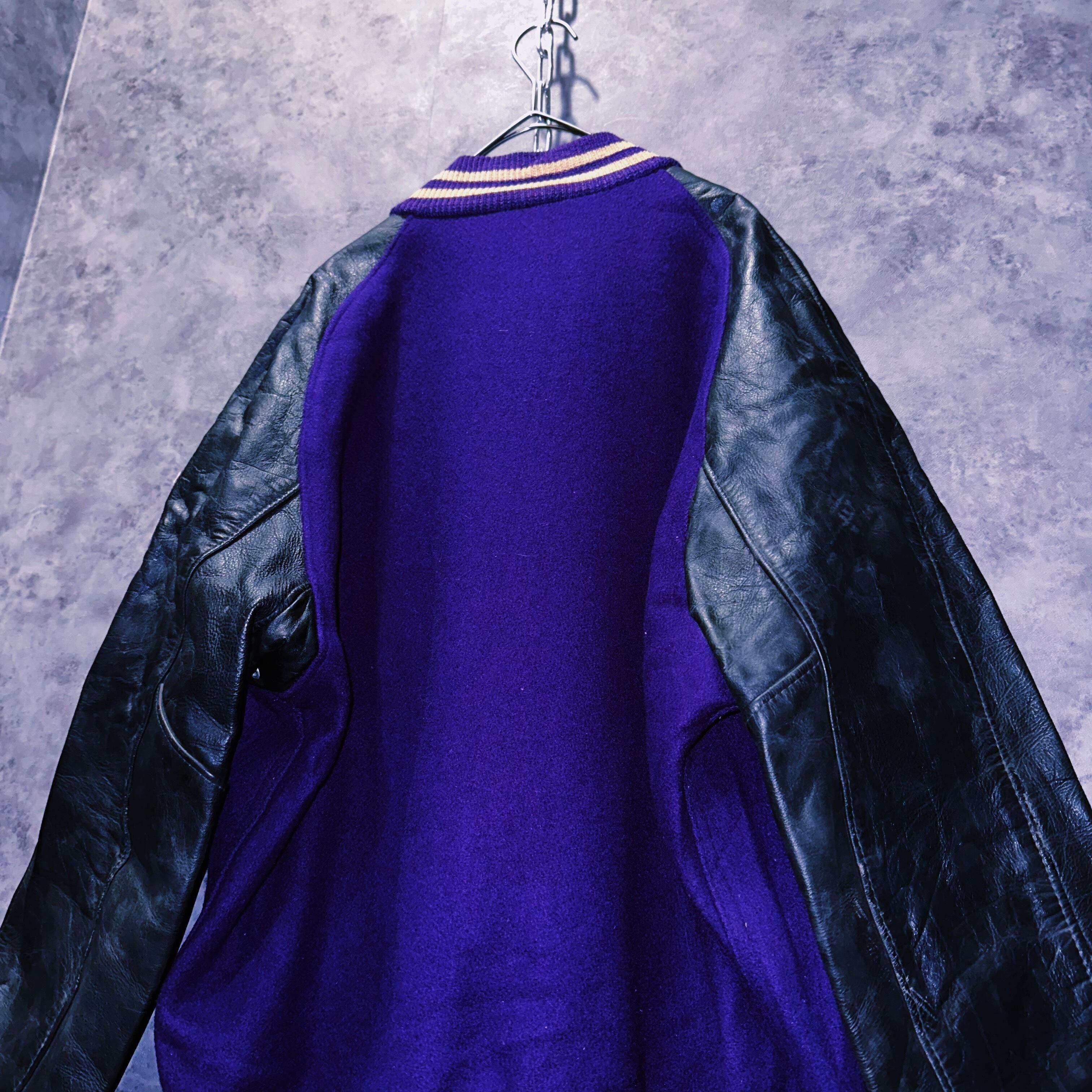 鮮やかなパープルカラーにブラックカラーのレザーの切り替えのデザインはスタジャンの中でも高級と言わんばかりのラグジュアリーなデザイン。ルーズなシルエット感。