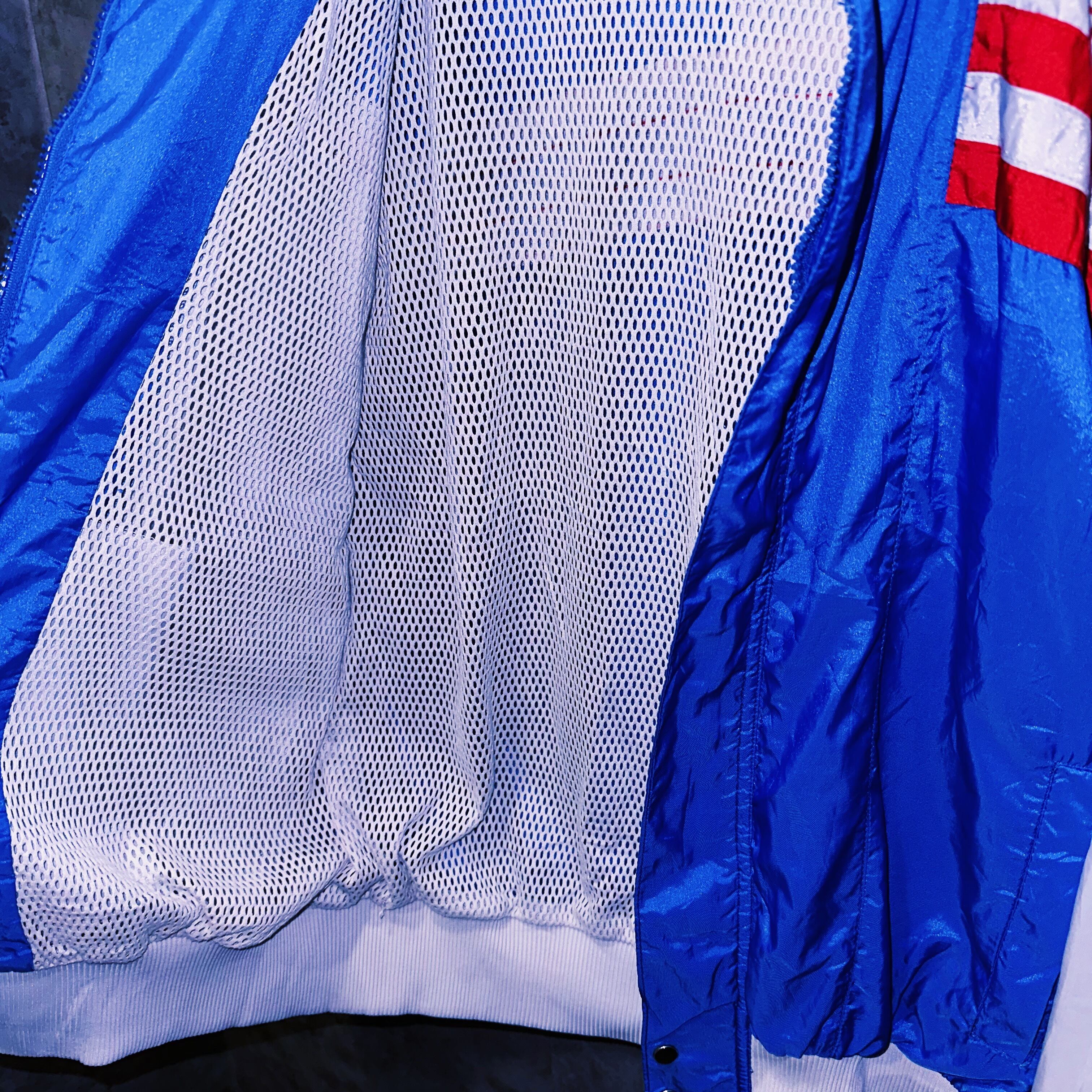 マルチな配色で全く見かけない、ブルーにレッドとグレーのクールなカラーリングが特徴的でどこか近未来感もある1着。