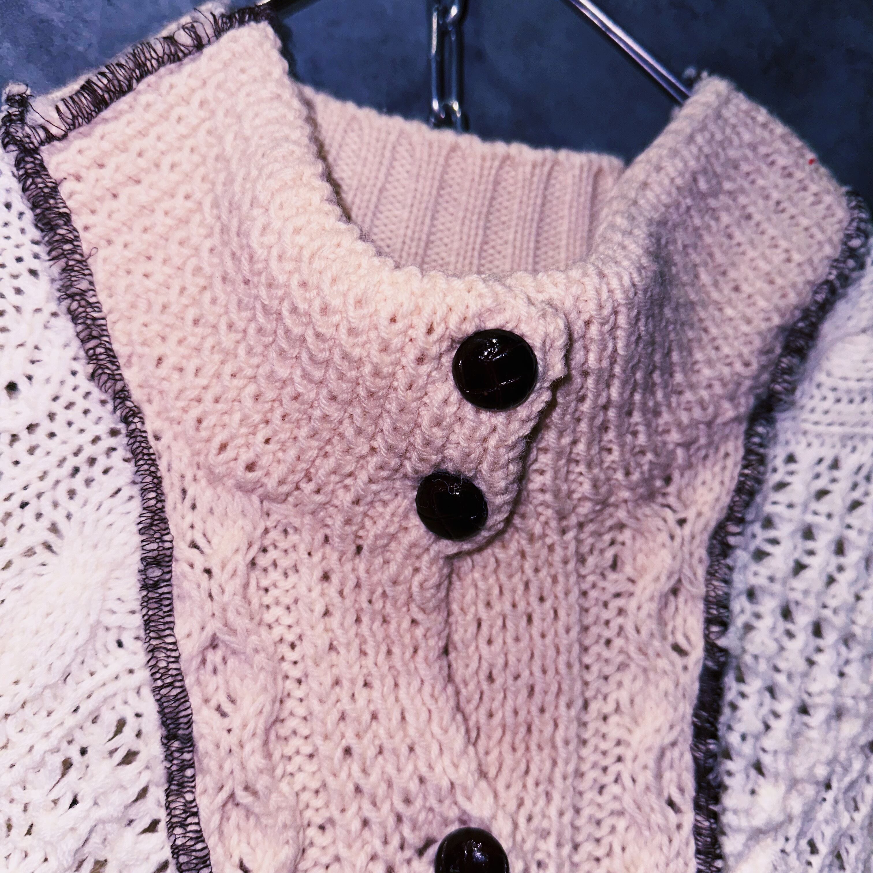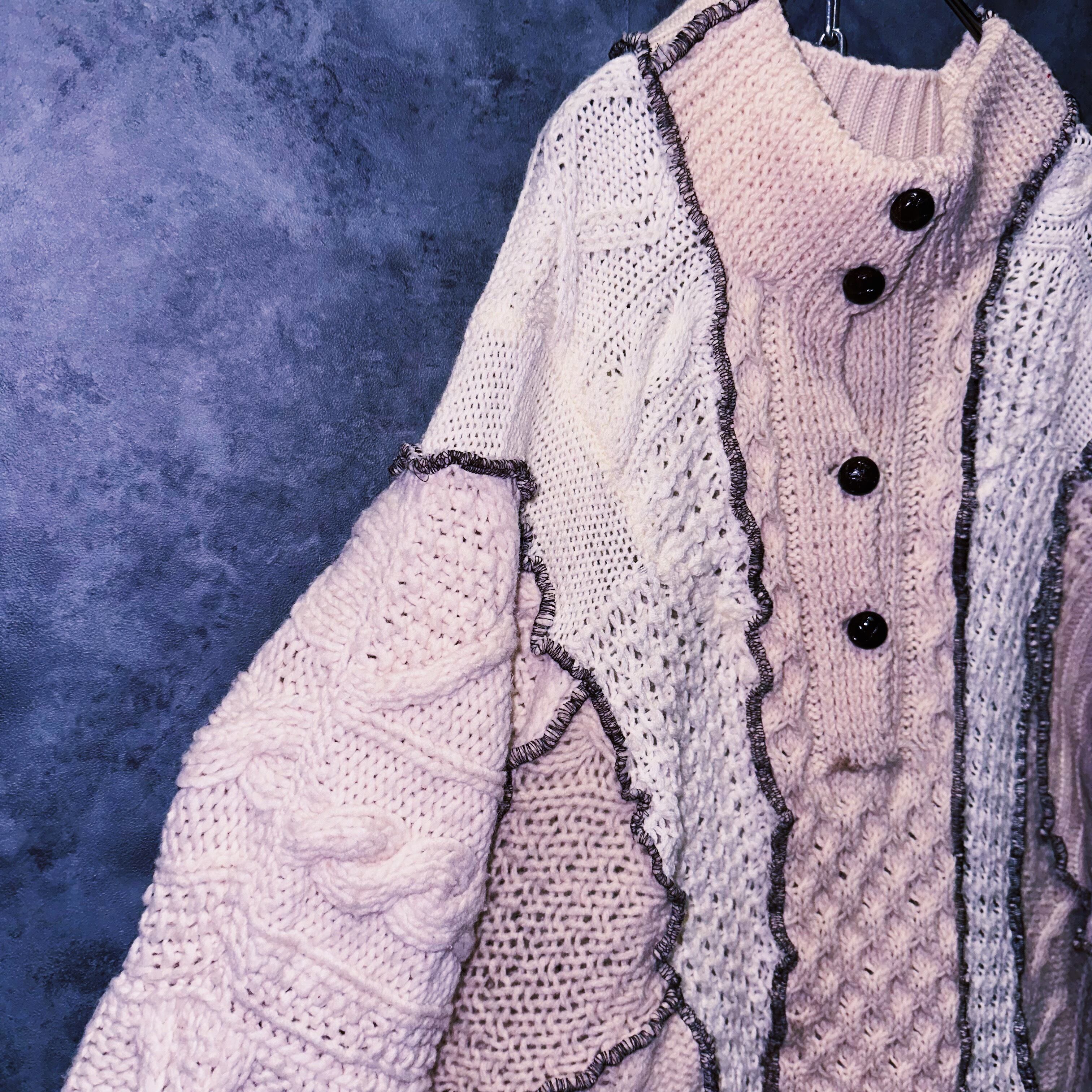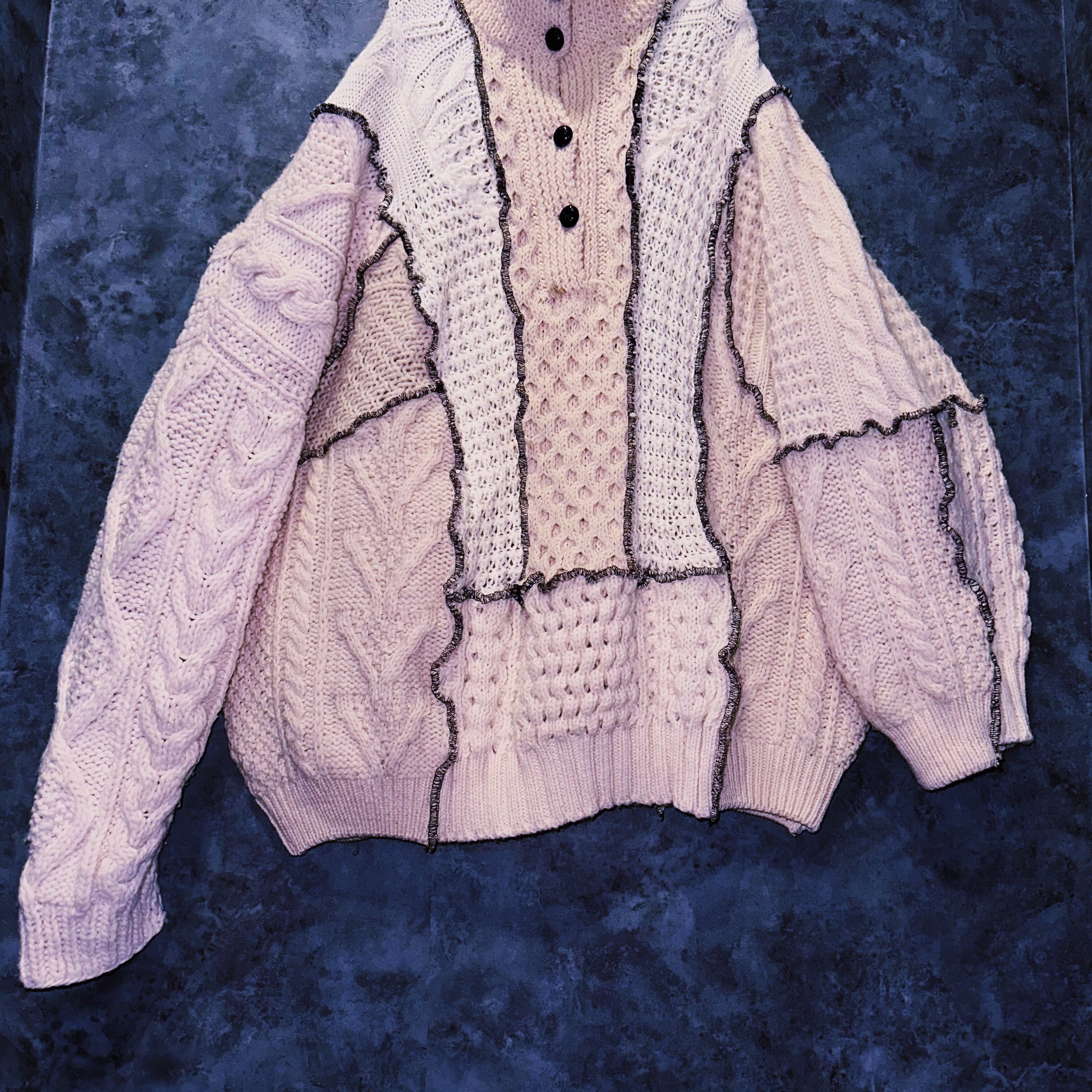 "ツギハギ"クレイジードッキングパターンリメイクケーブルプルオーバーハイネックニット