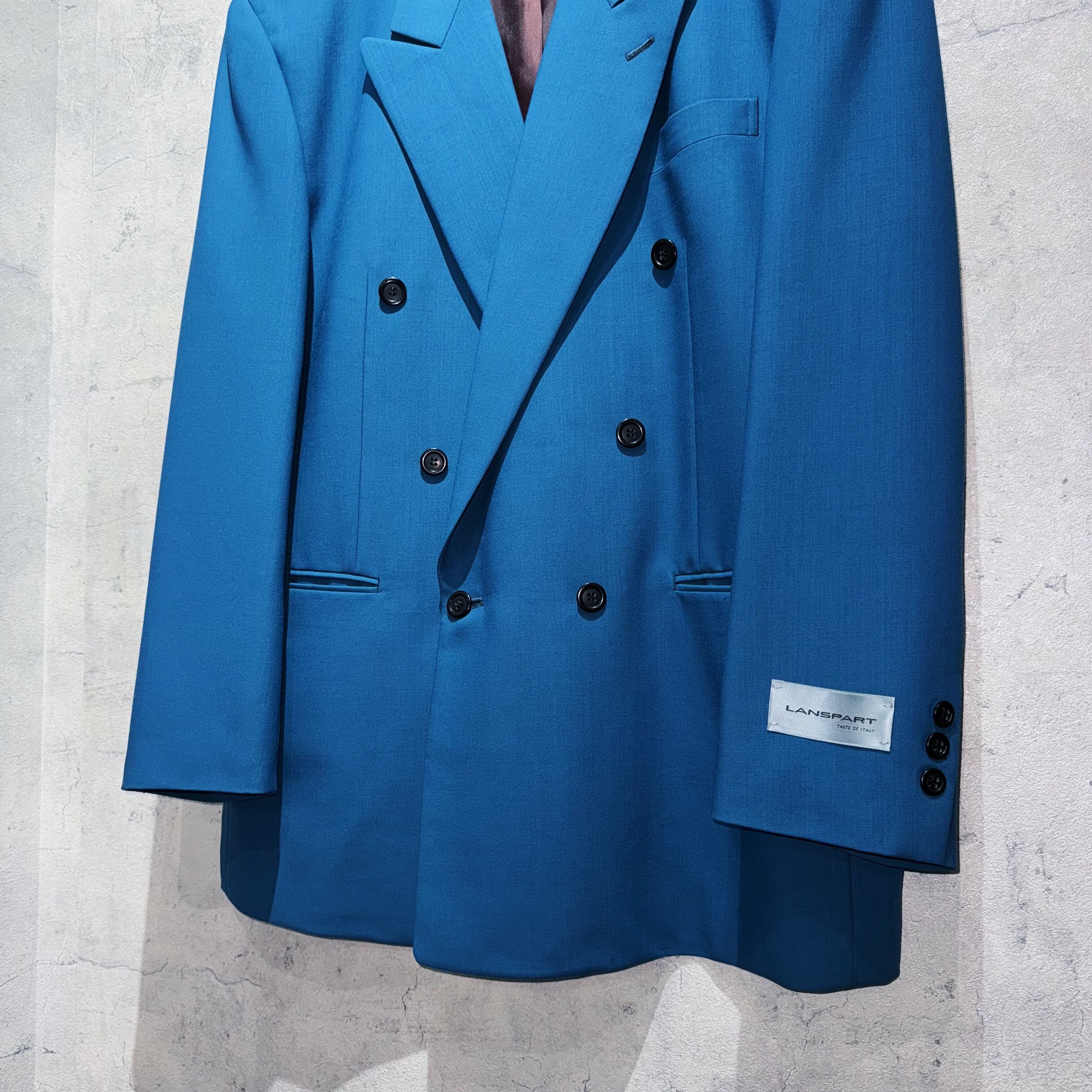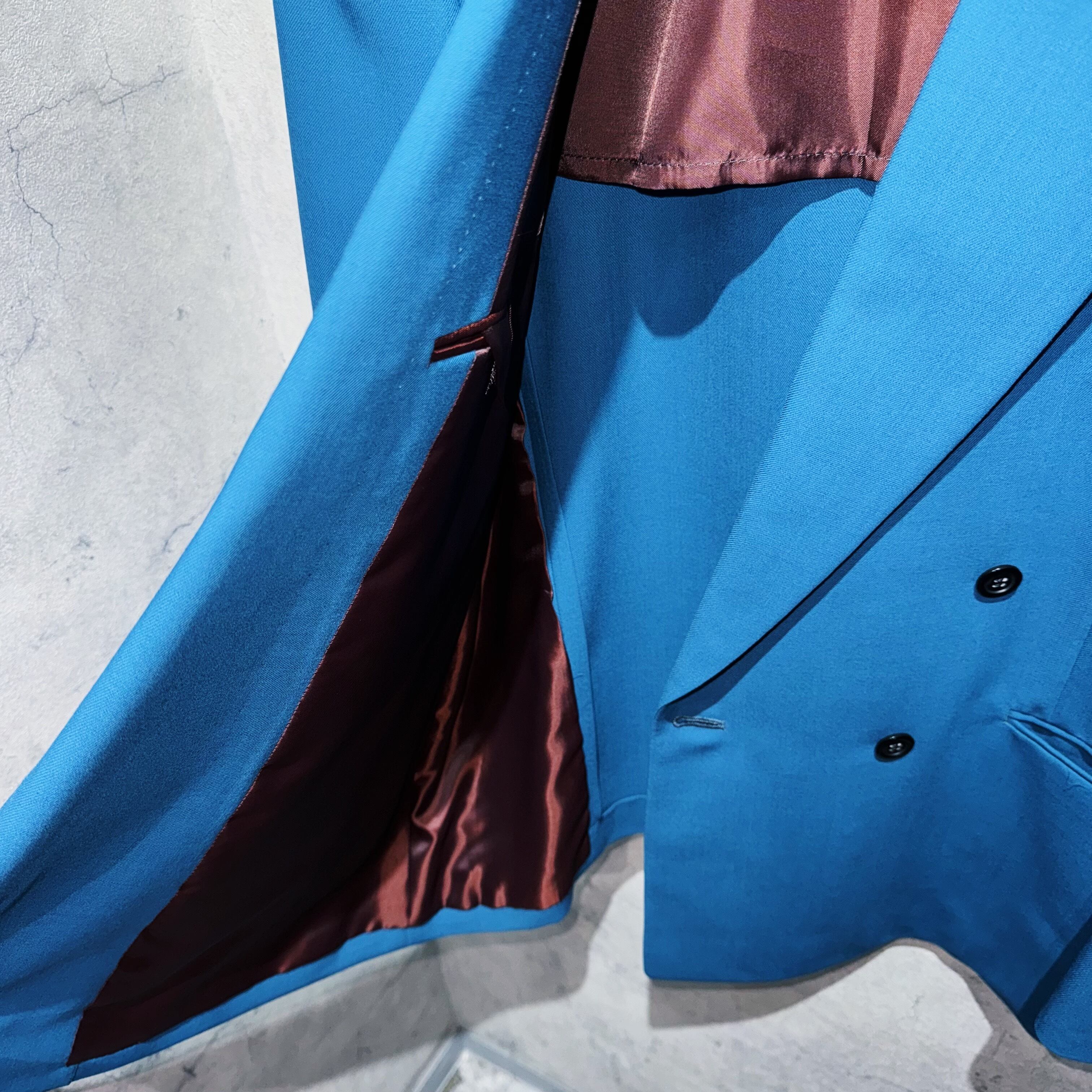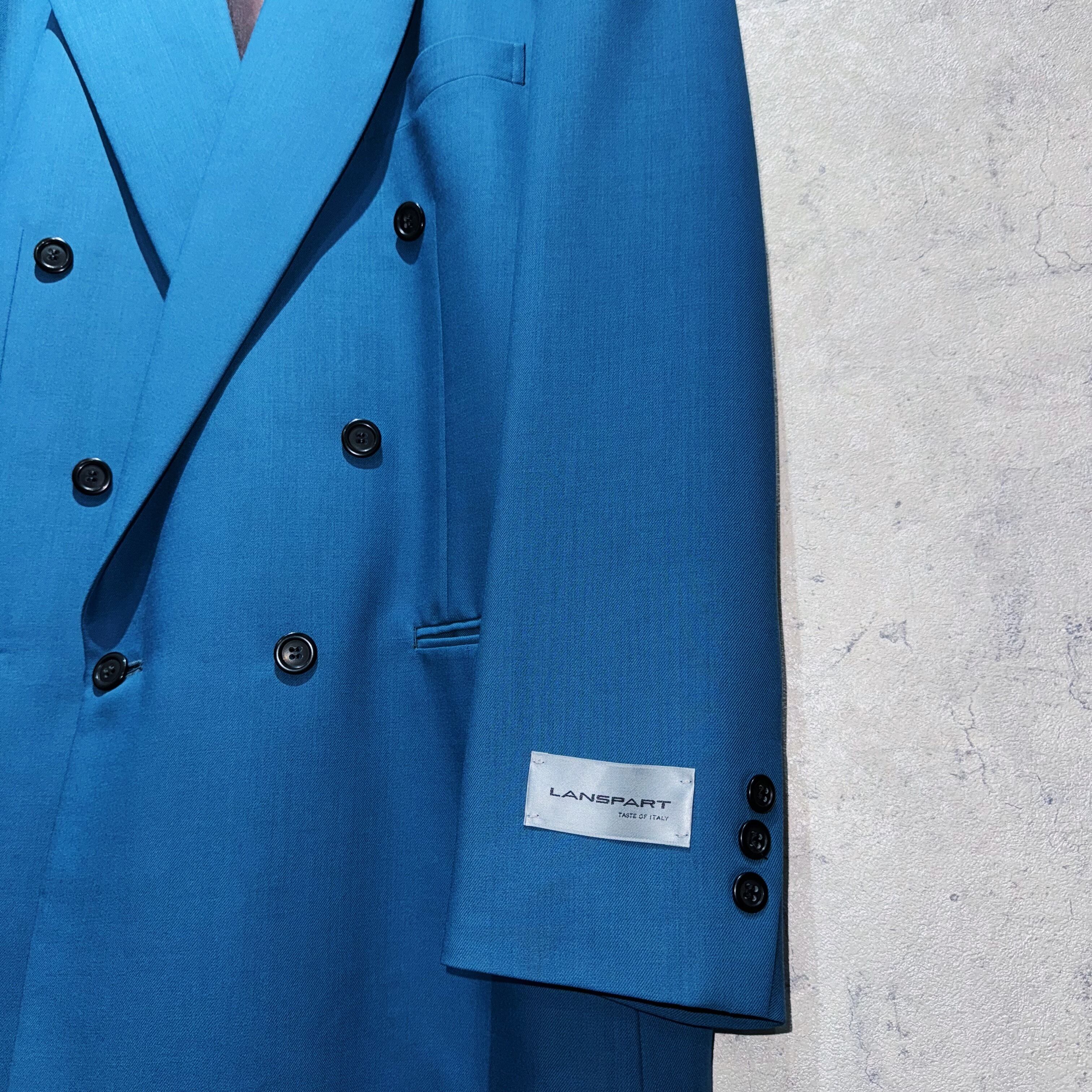 程よく上品な光沢を放ち、美しく発色するムーンシャインブルーブルーを身に纏ったダブルブレストのセットアップ。