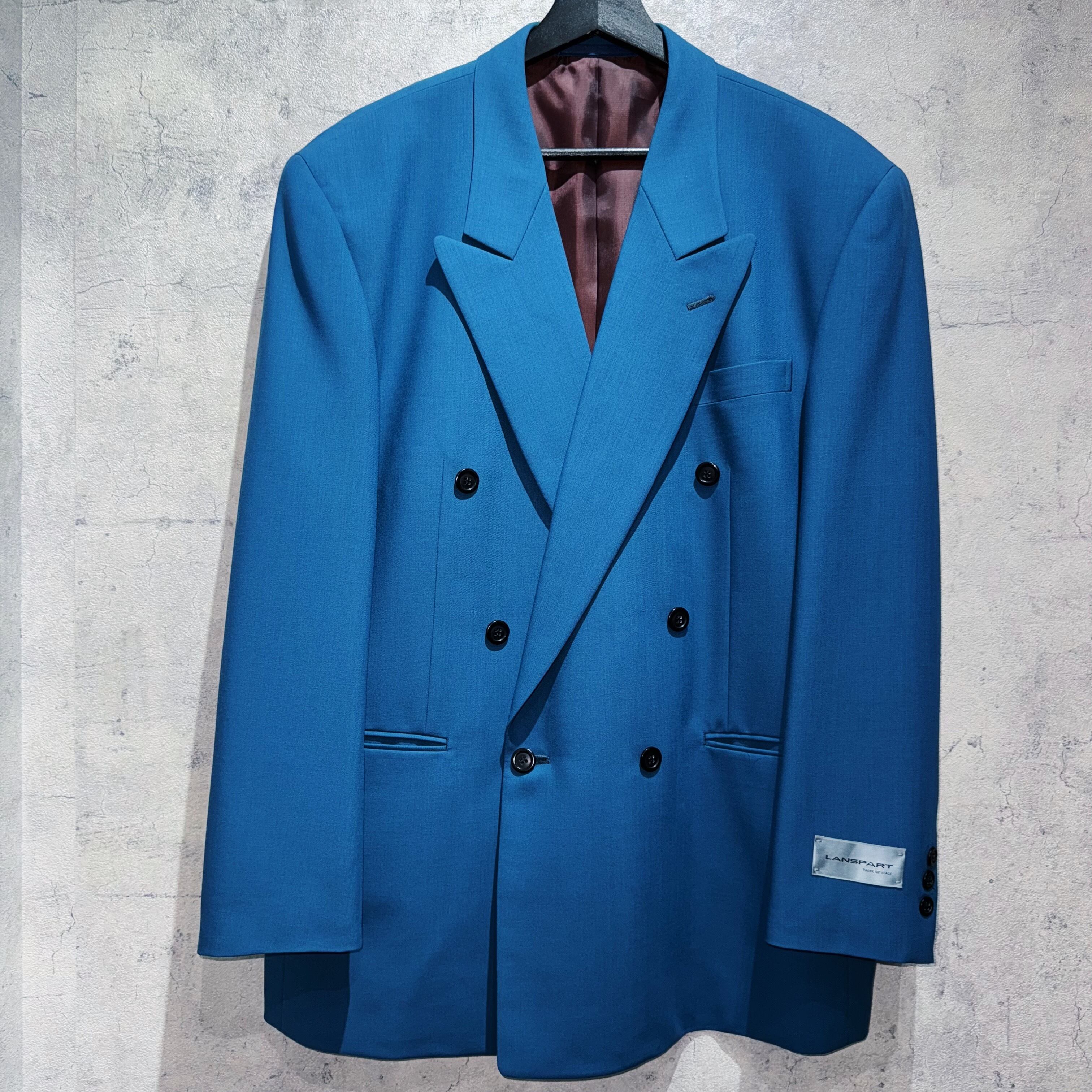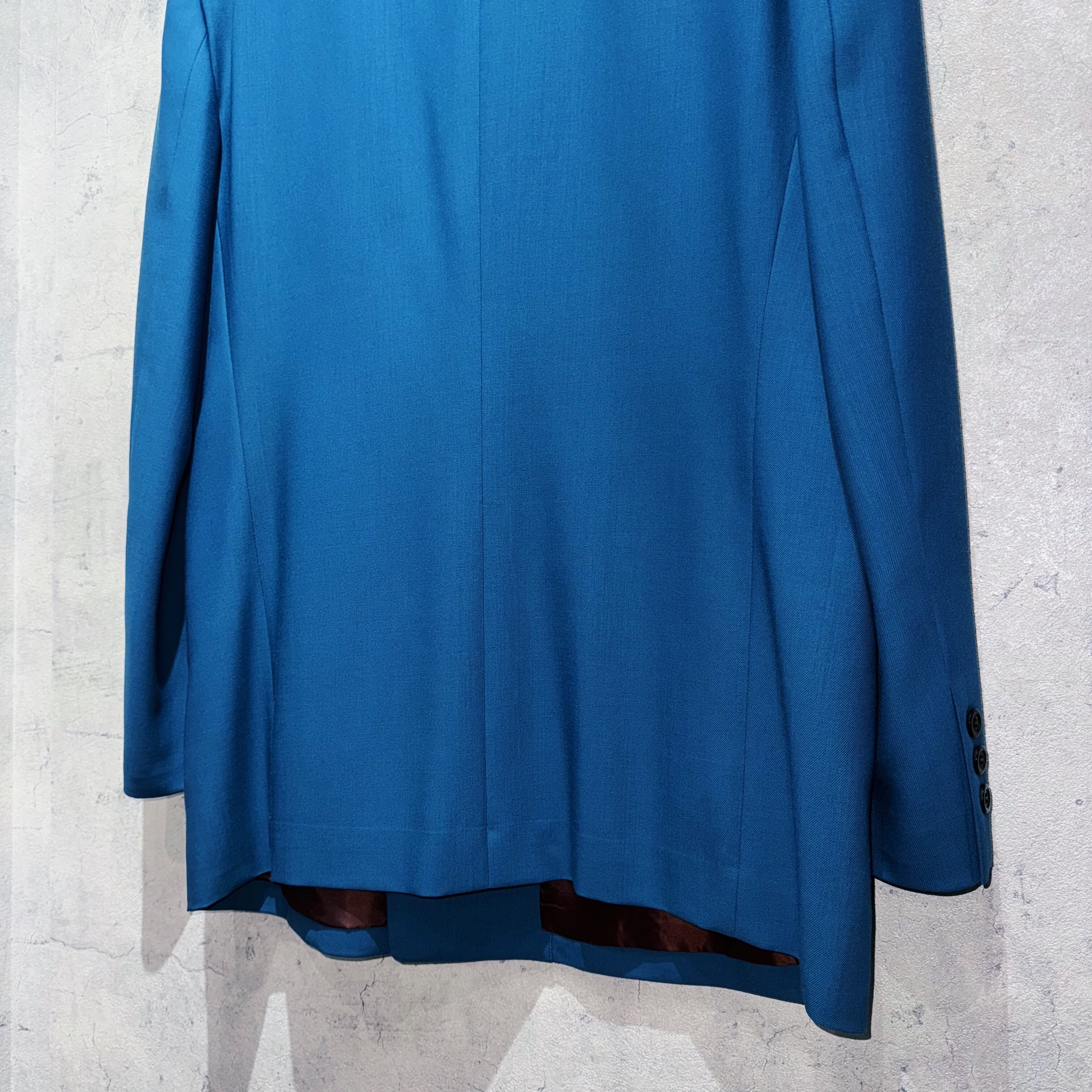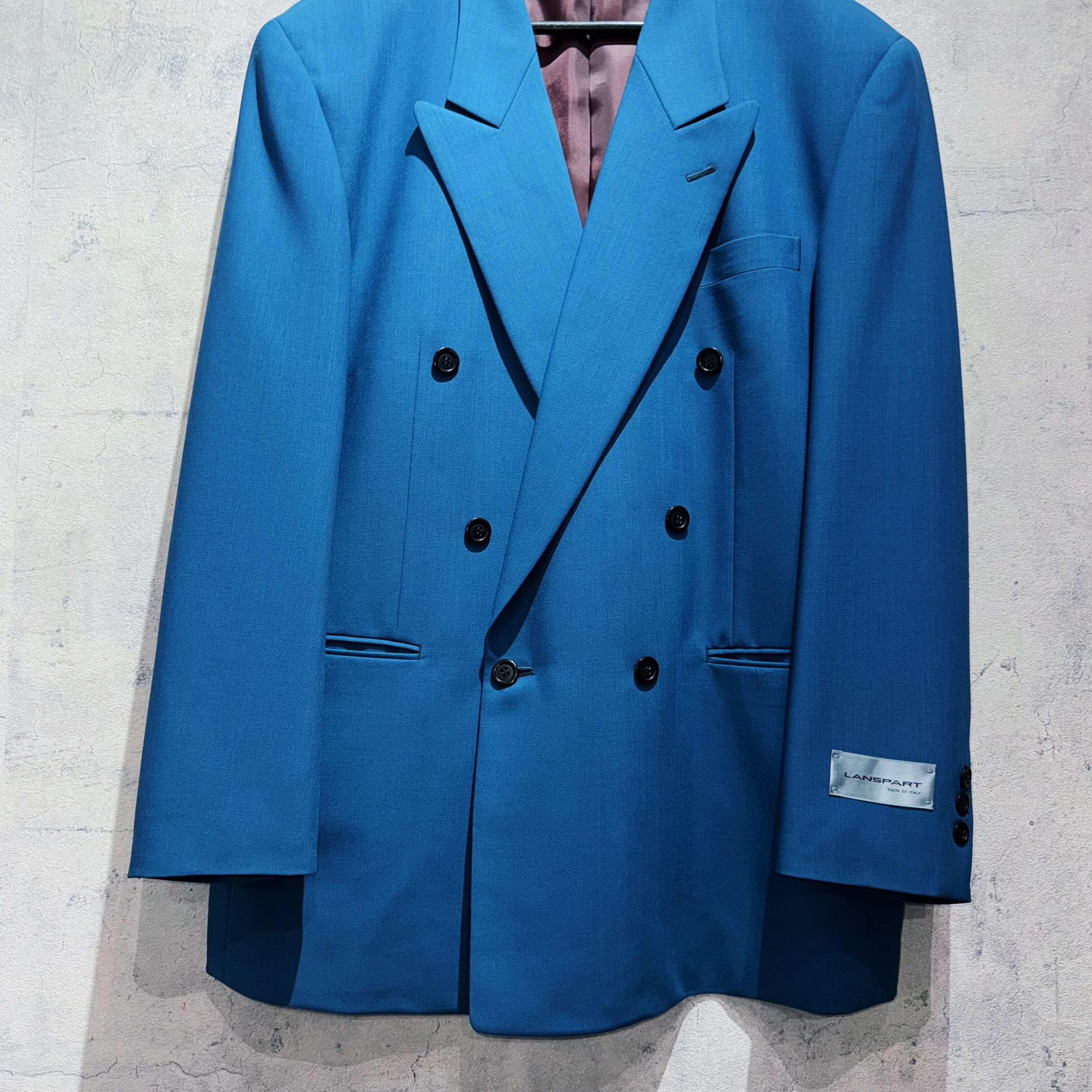 程よく上品な光沢を放ち、美しく発色するムーンシャインブルーブルーを身に纏ったダブルブレストのセットアップ。