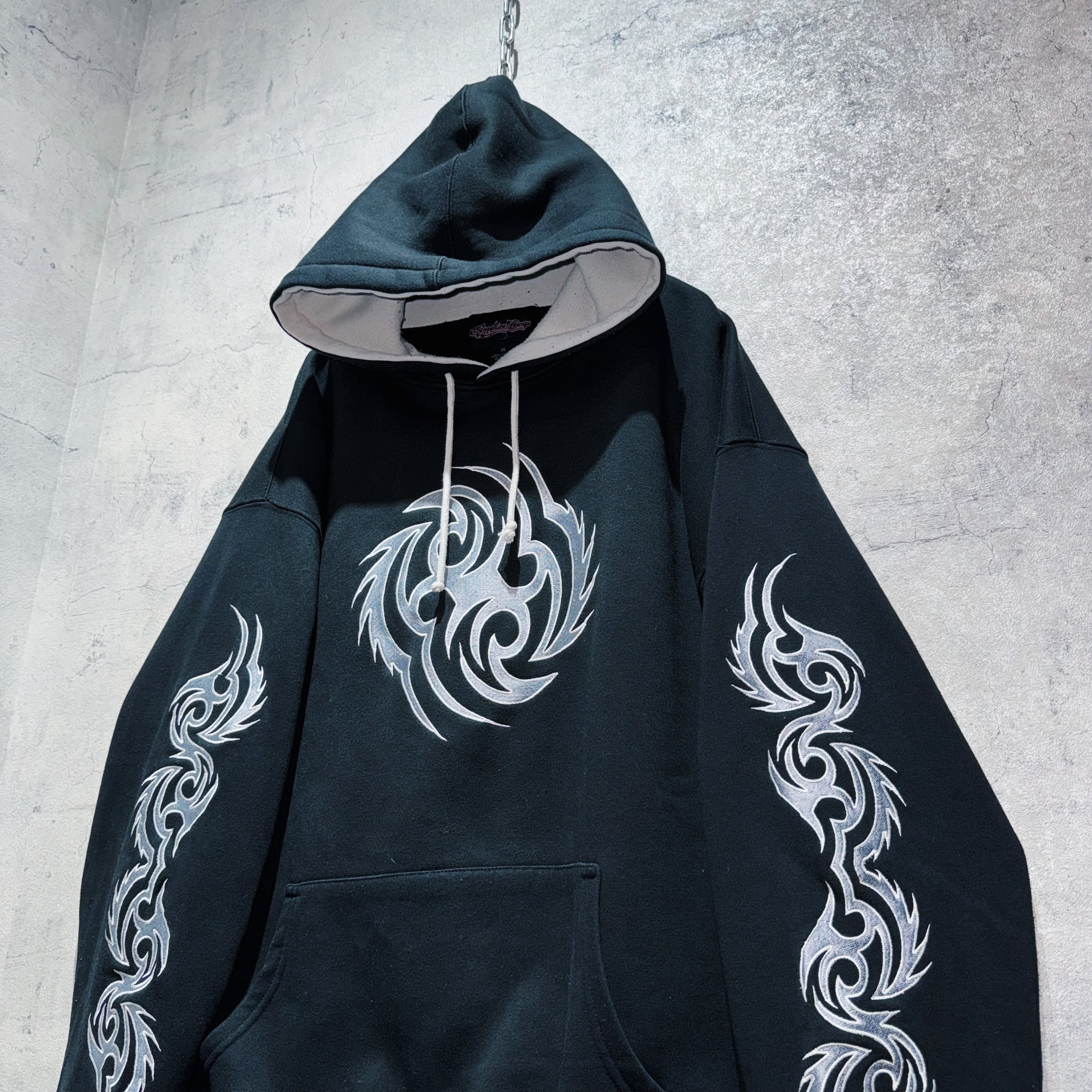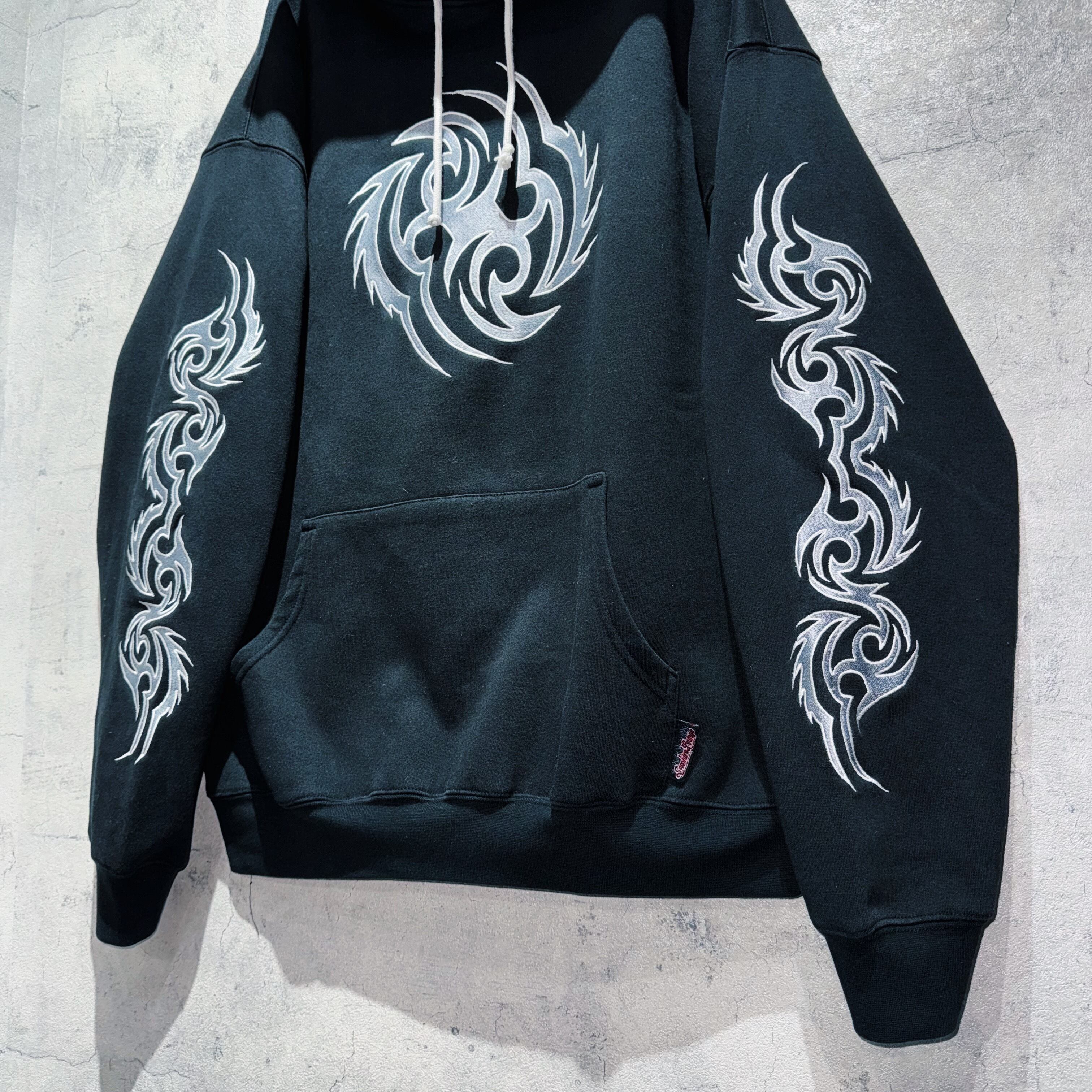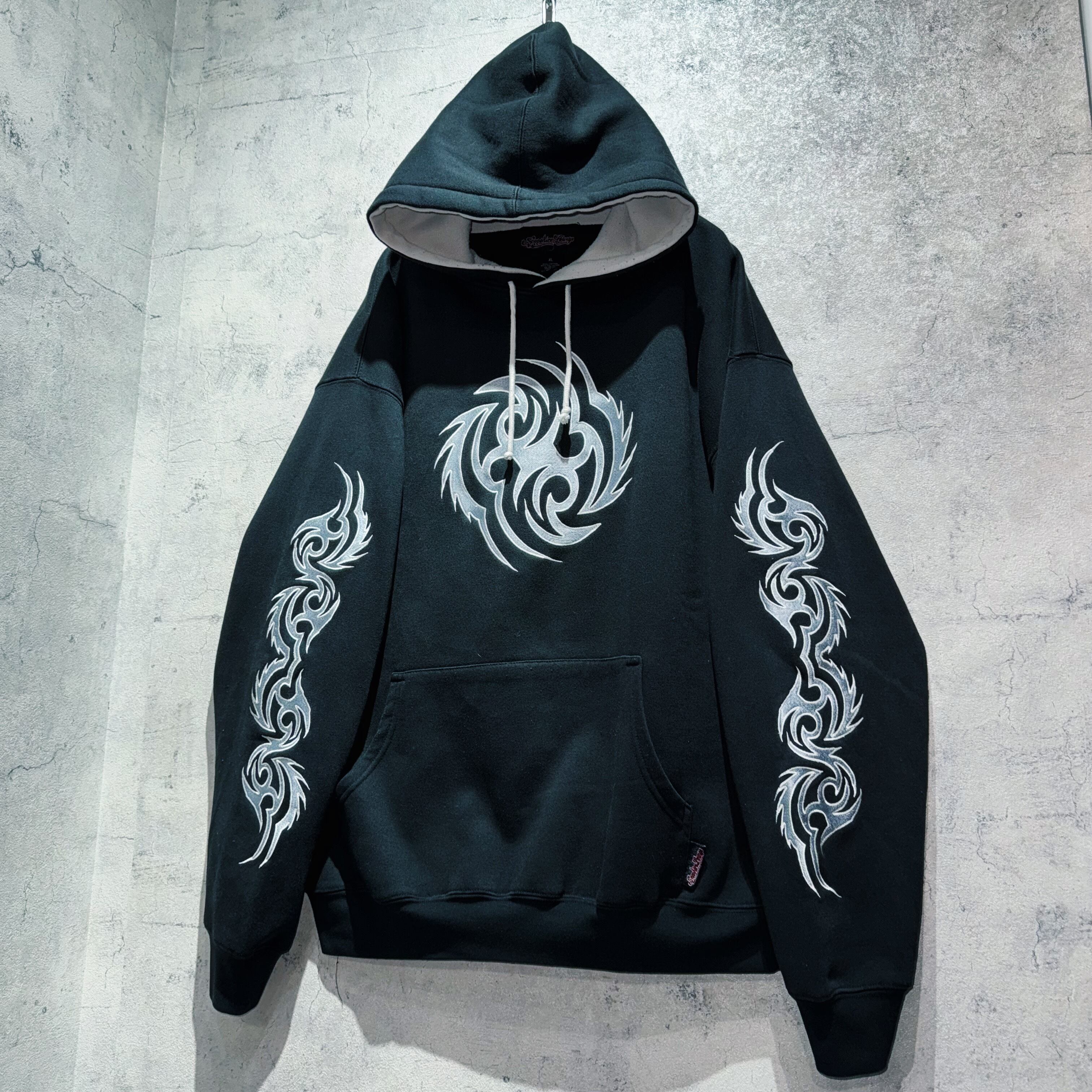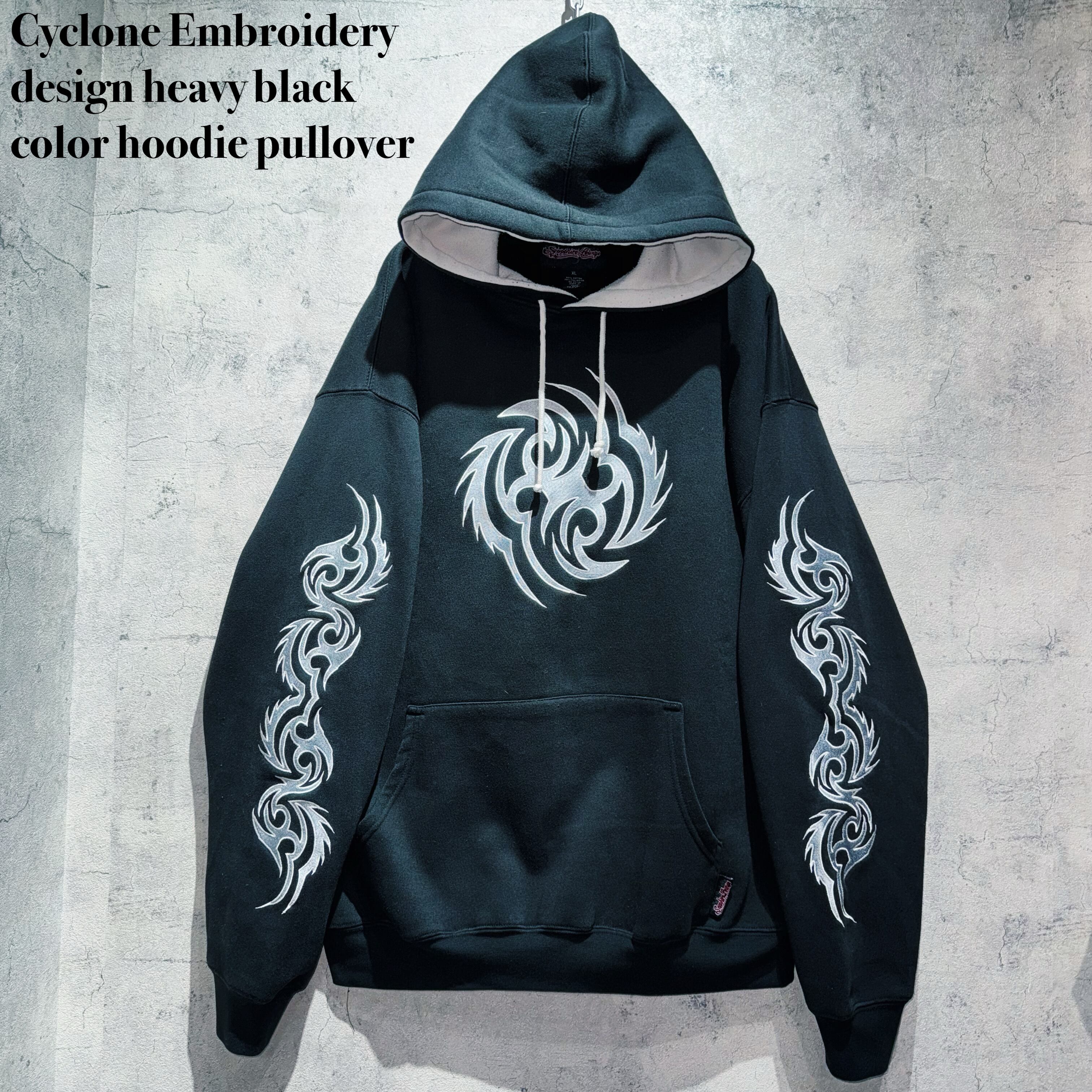 サイクロンエンブロイダリーデザインヘビーブラックカラーフーディープルオーバー