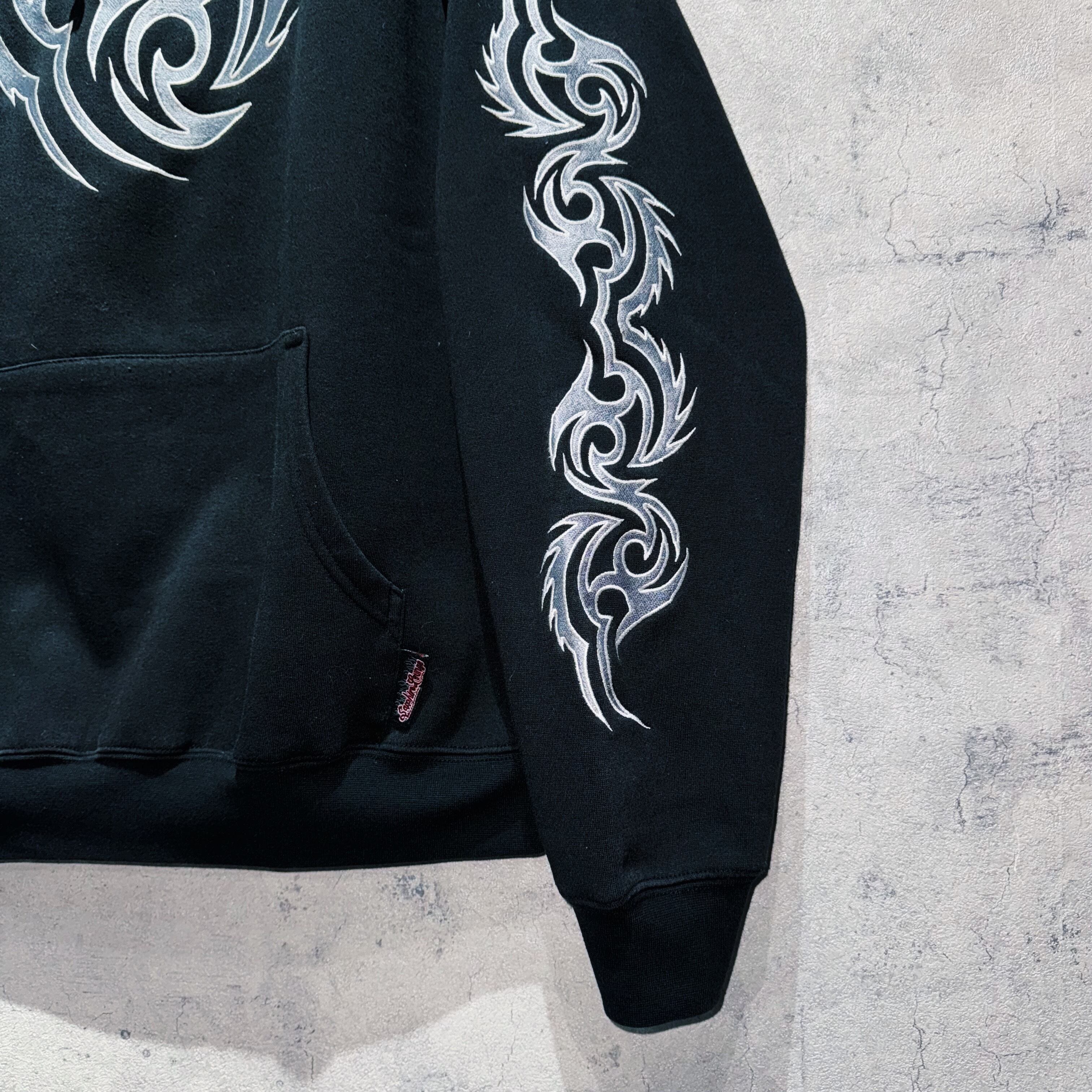 ヘビーオンスのブラックのボディに極ノ番・うずまきのようなY2Kノリもある刺繍を刻んだデザインフーディー。フロントだけではなく袖元にもデザインを施しており抜かりのないデザイン。