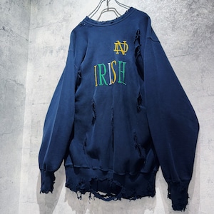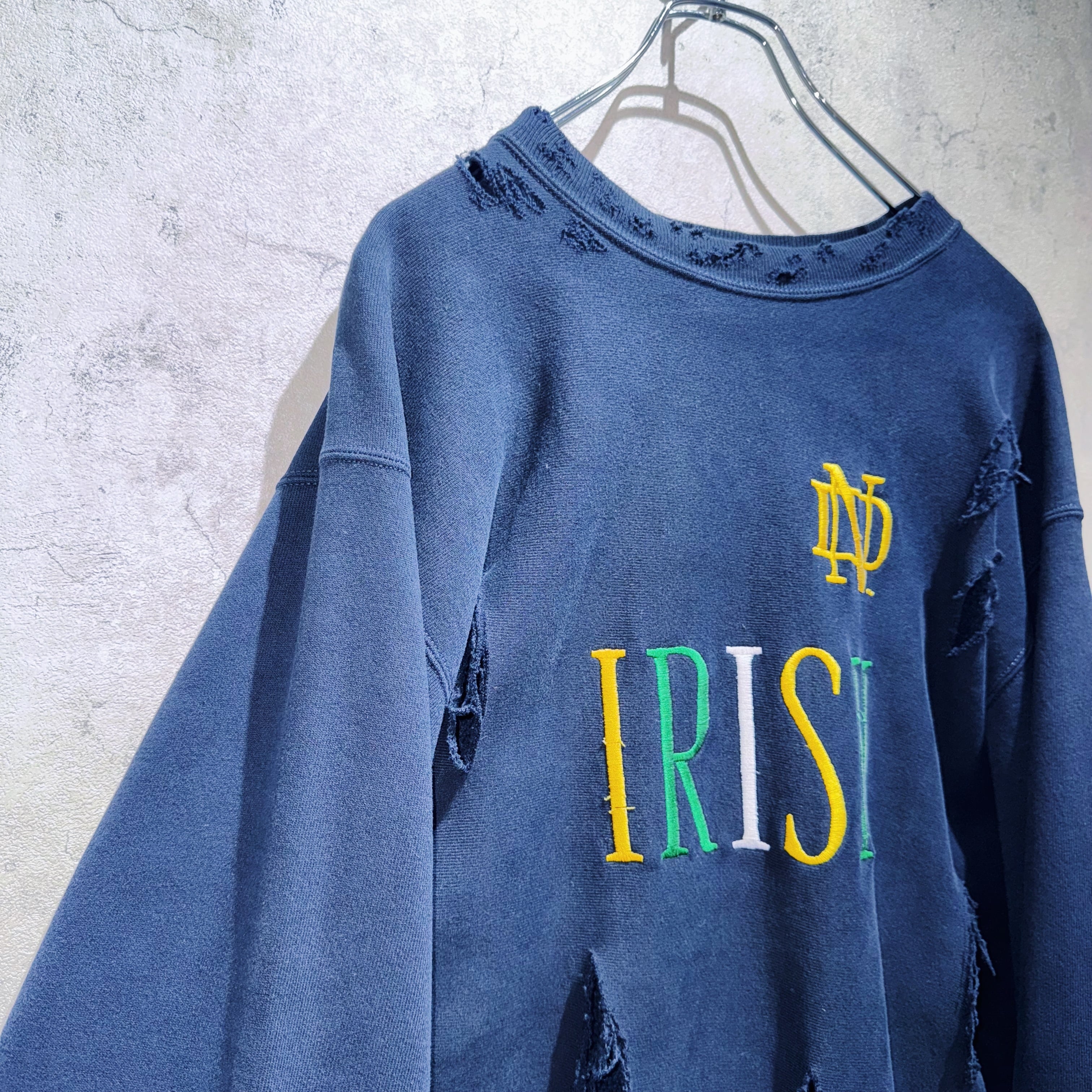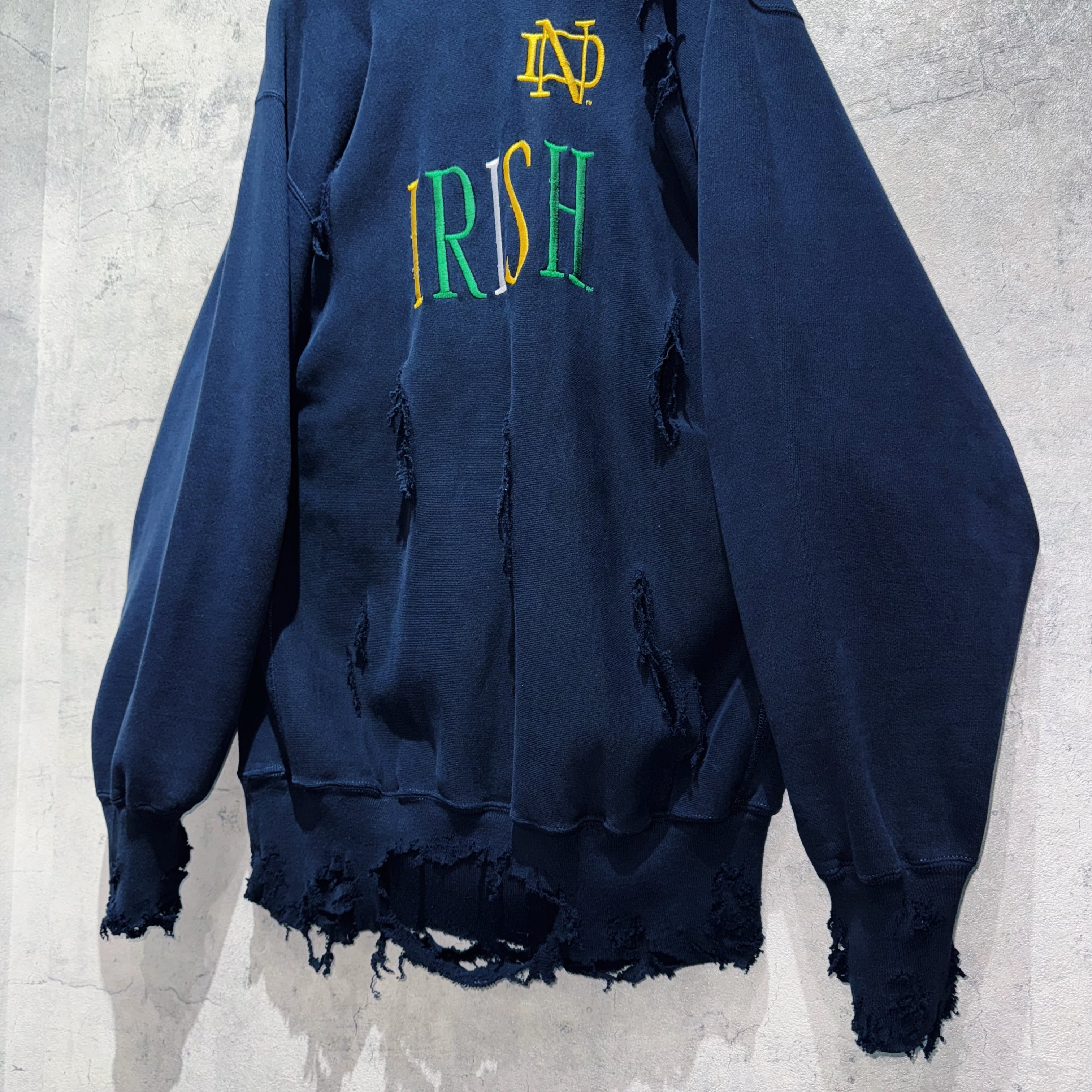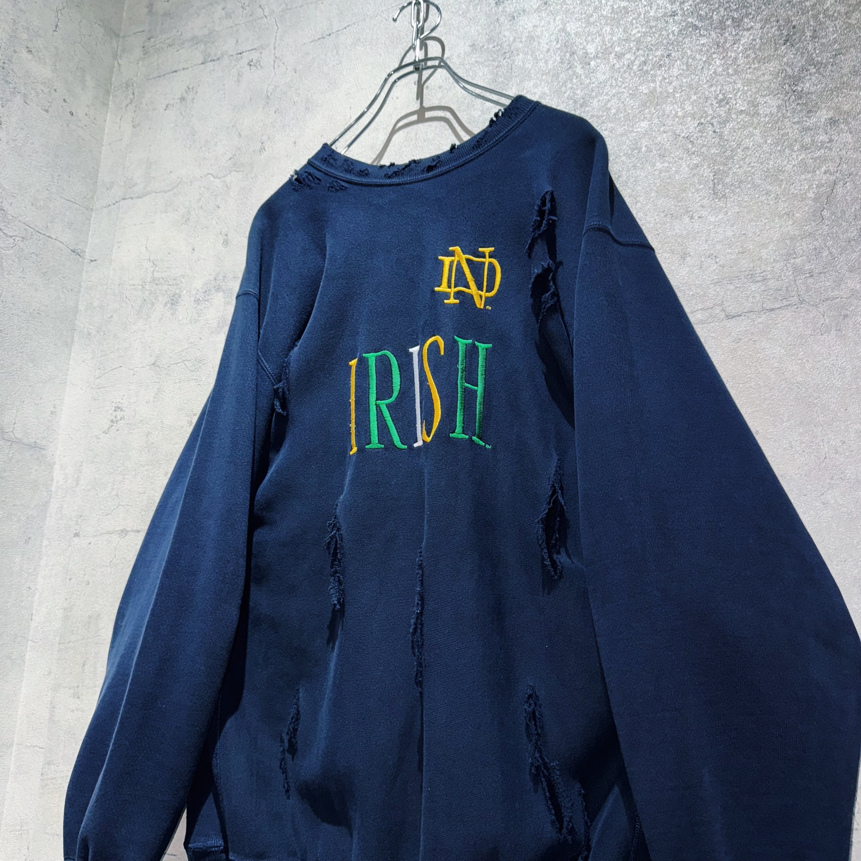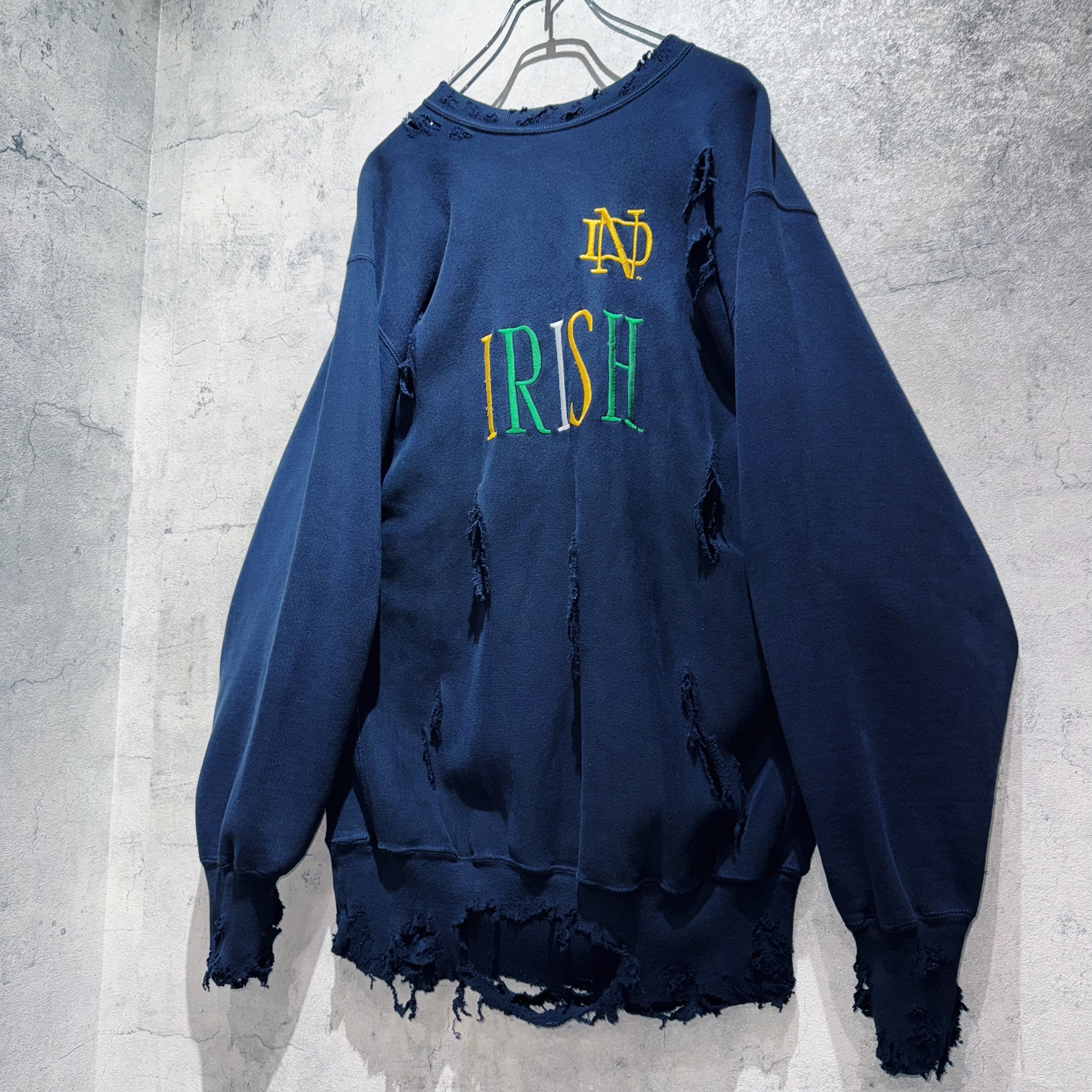 そんなスウェットを贅沢にボロカスタムし唯一無二の仕上がりへと変貌を遂げた一着。フロントには「IRISH」と刺繍が刻まれたカレッジプリント物で、サイズも2XLとルーズなサイジングで一枚でも十分な存在感があります。