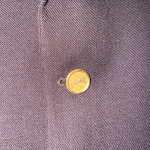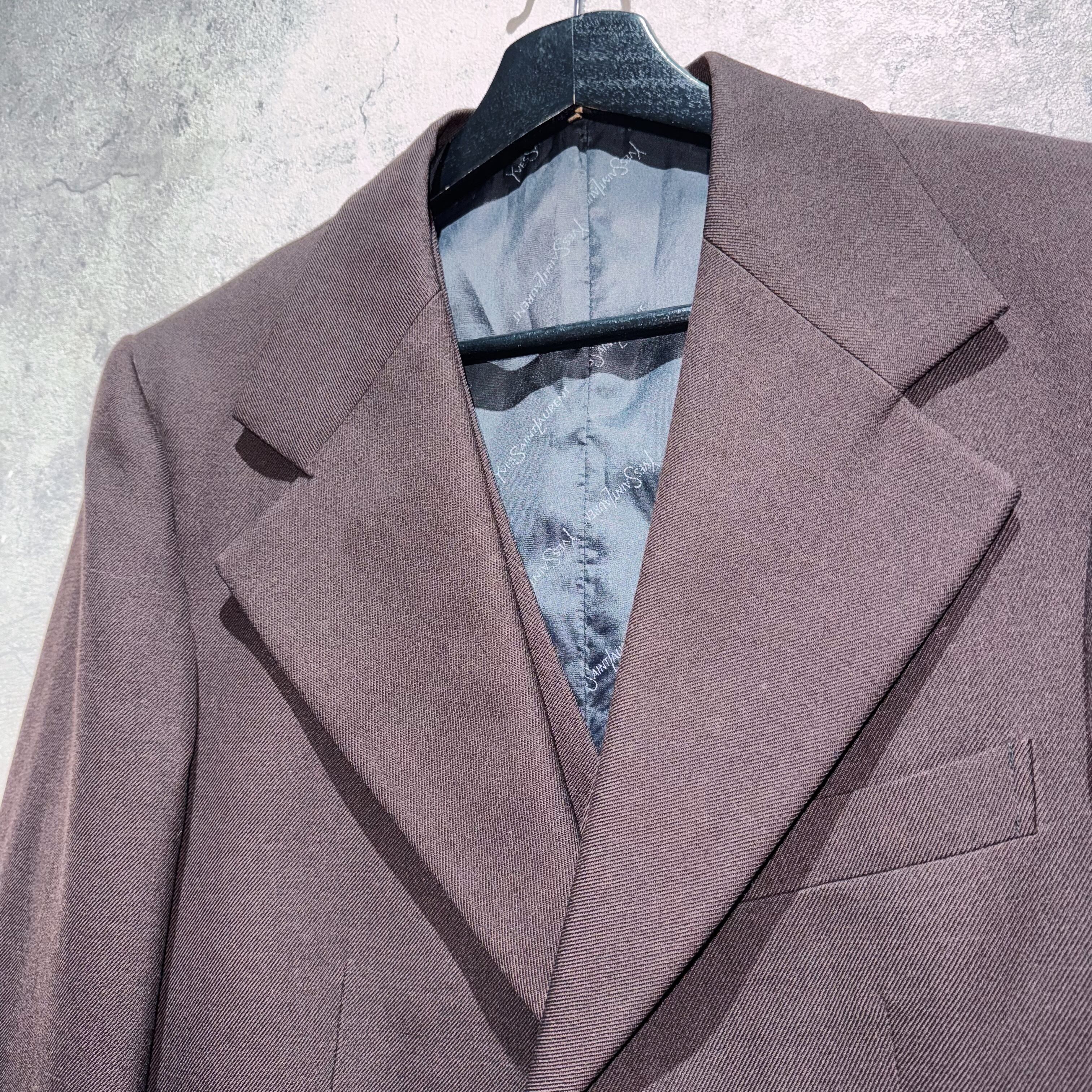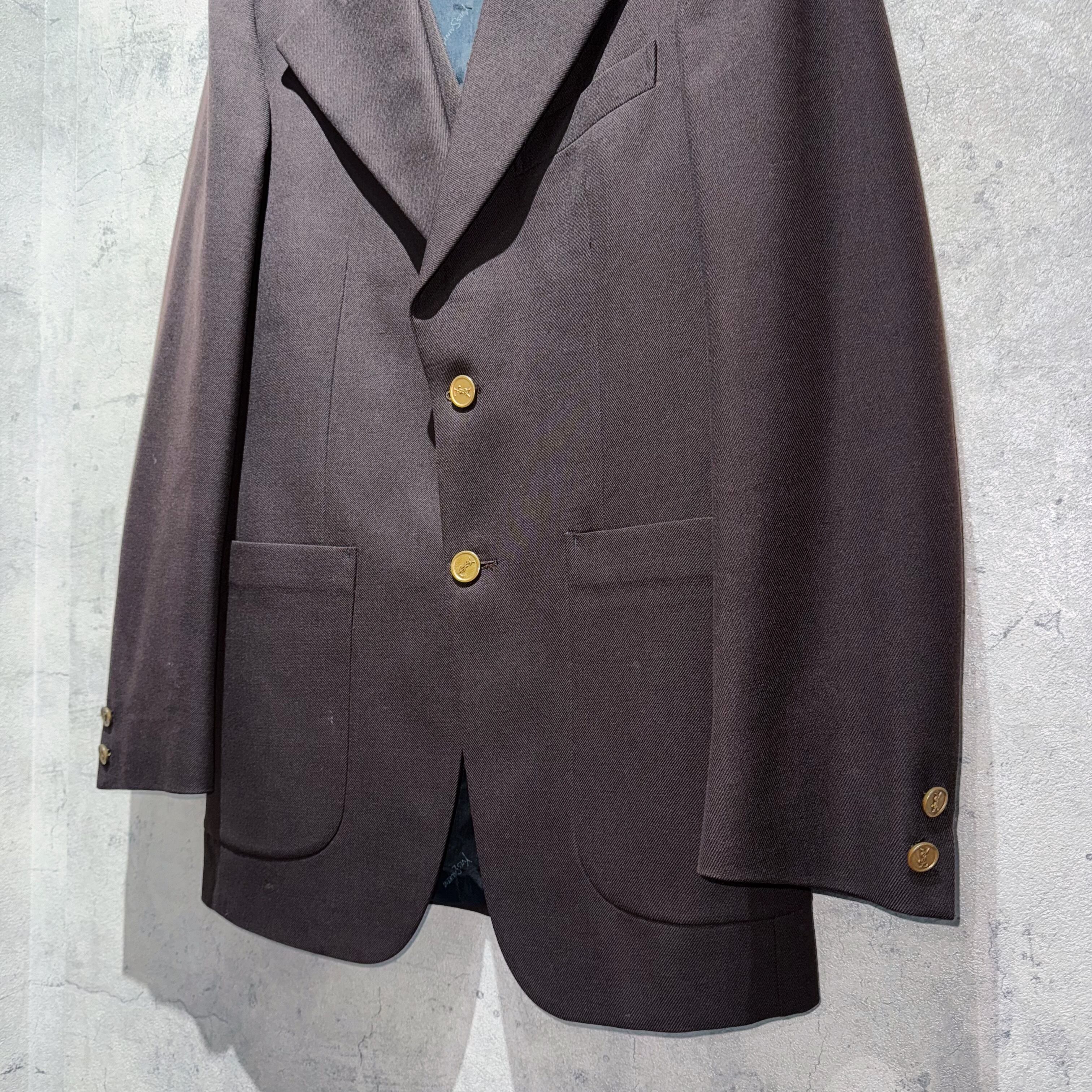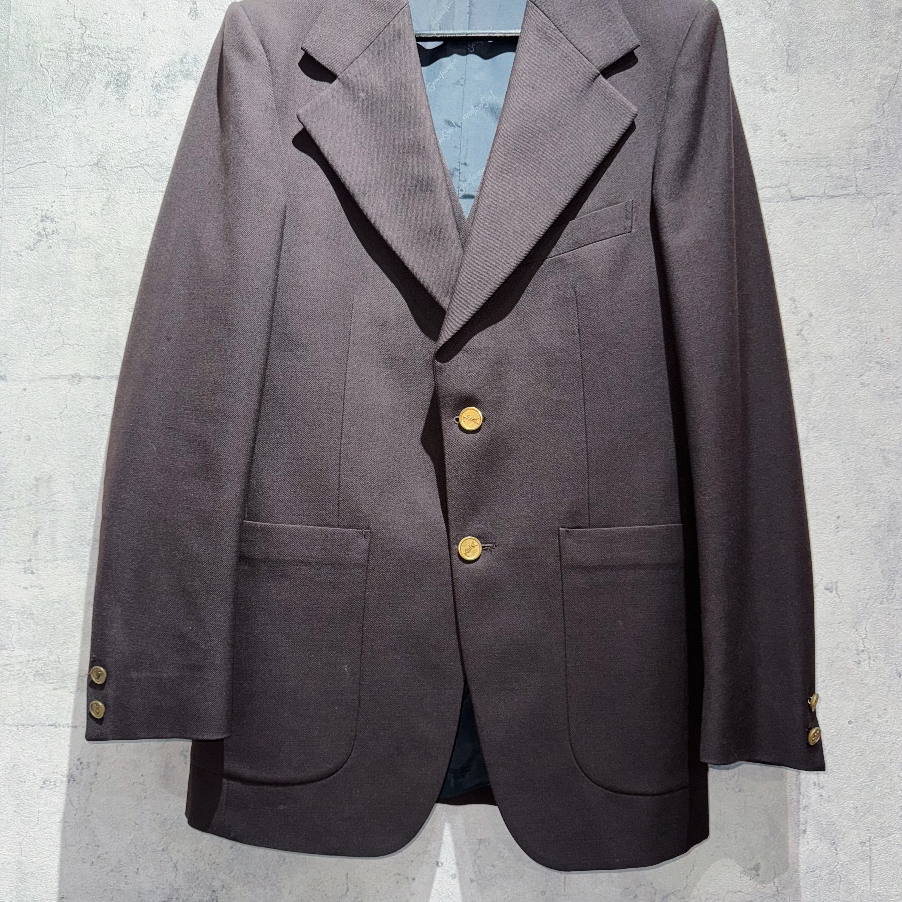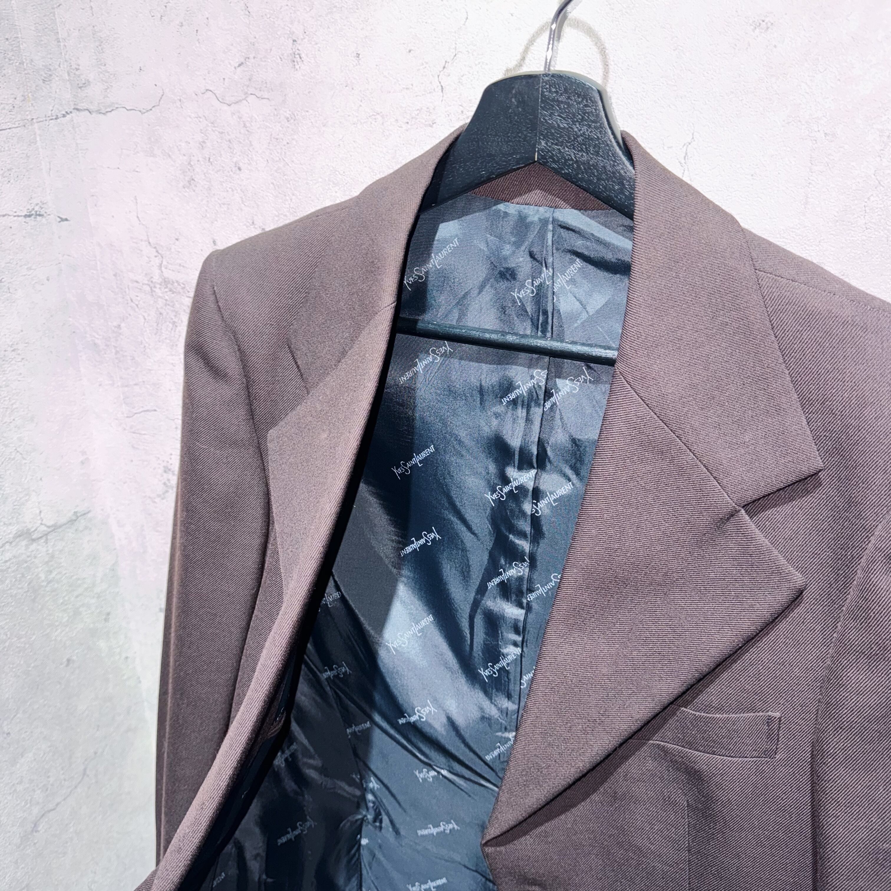 品格のあるブラウンカラーに身を包み、ボタン一つひとつが”YSL”と刻まれたゴールドボタンのジャケット。70年代らしくシングルでピークドラペル、もちろんパンツはフレアシルエットでご用意。