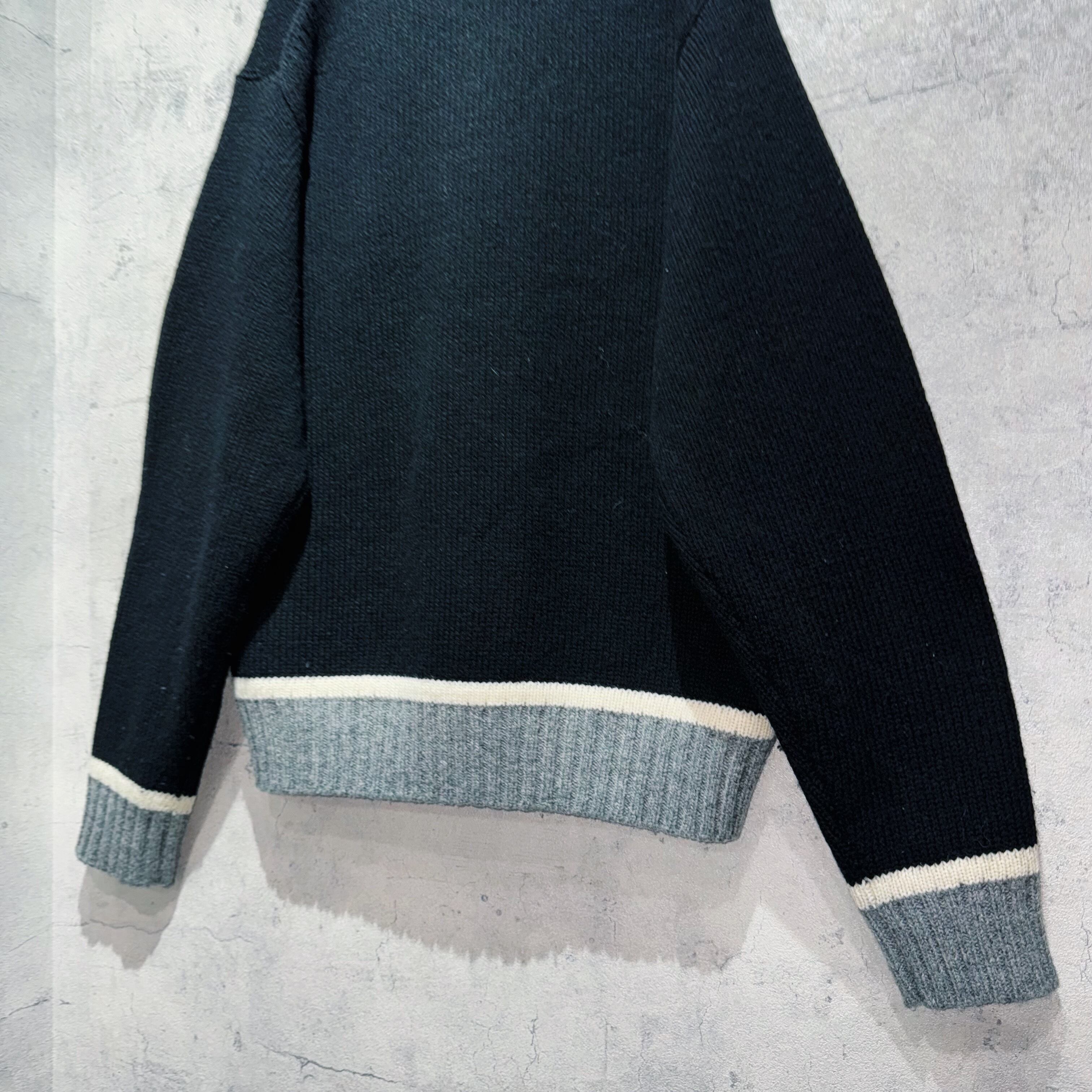 胸元にシグネチャーでもある”D”のロゴと共にブランド名が刺繍されたアイコニックなプルオーバーニット。ボディはブラックを基調とし、首元や裾がホワイト×グレーに切り替わったクラシカルなデザイン。