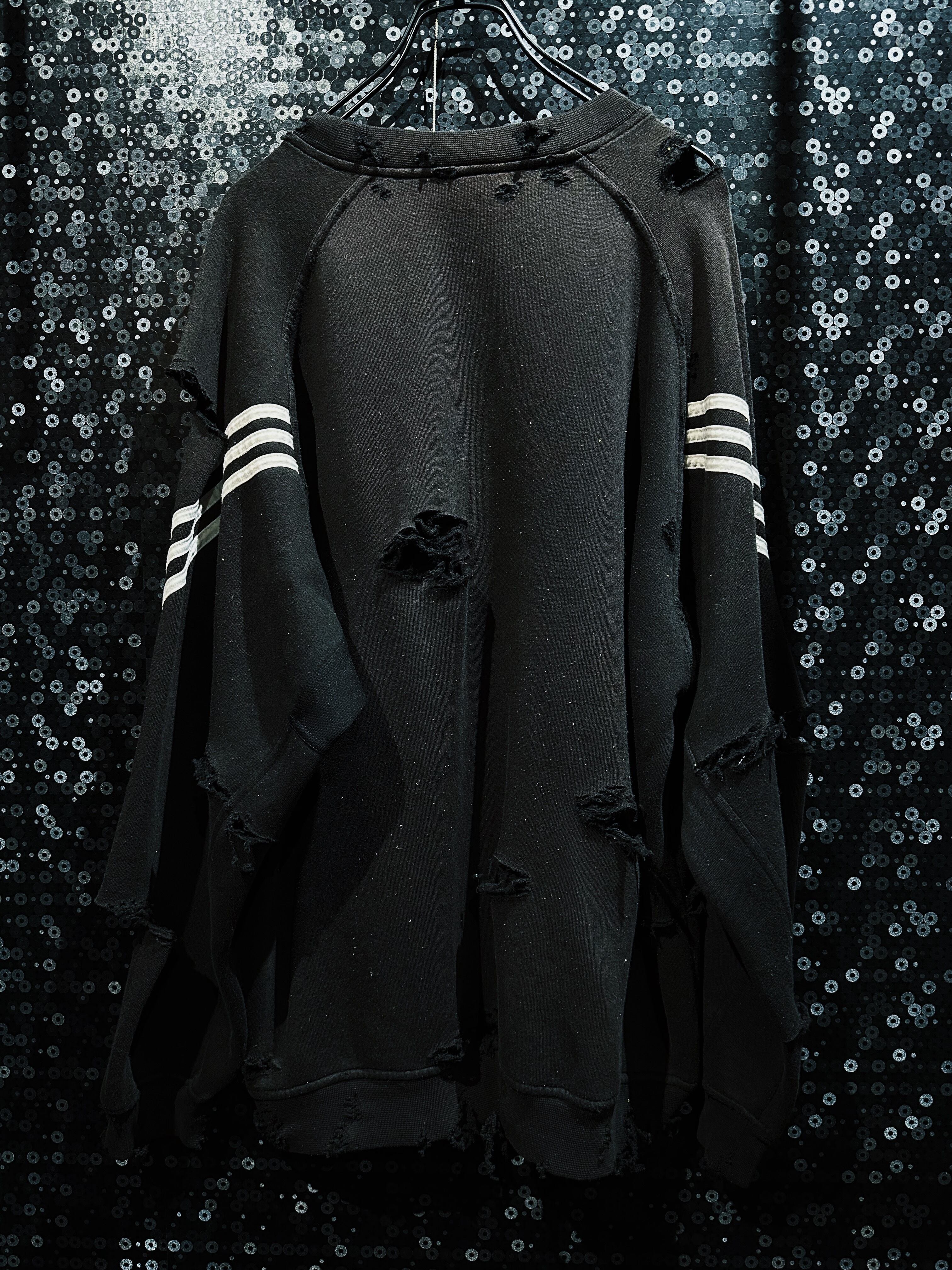 アディダスのスウェットを惜しげも無くボロカスタムした1着。カジュアルな着こなしをするのも良し、トラックパンツと併せてスポーツカジュアルなスタイリングにするのも良い。