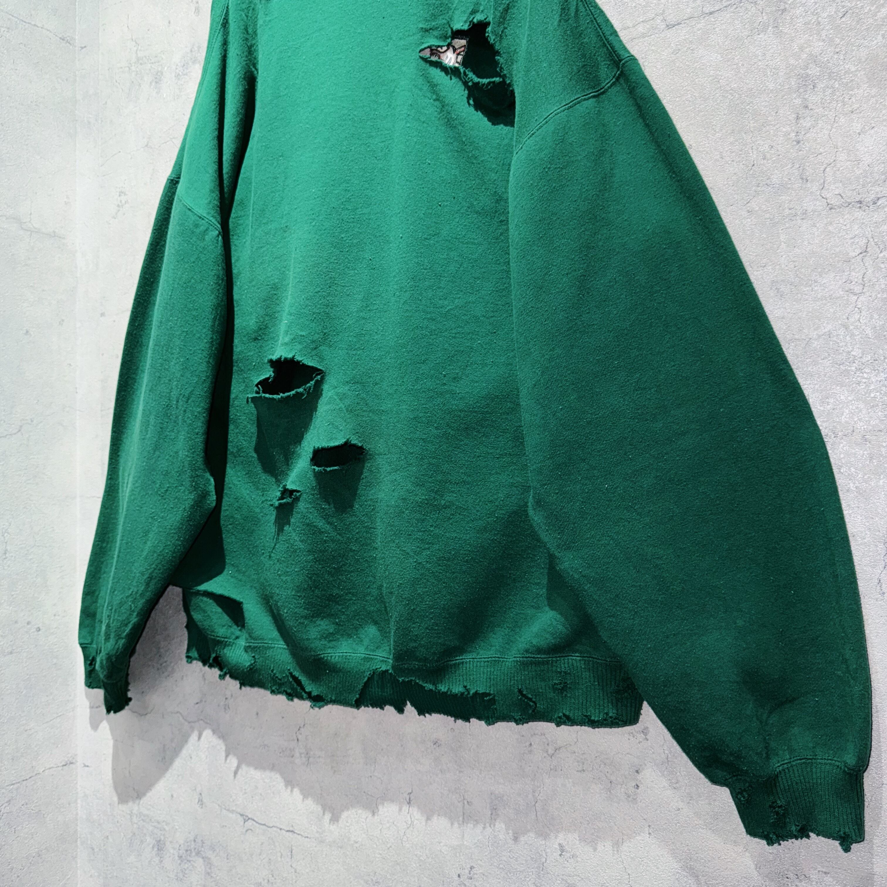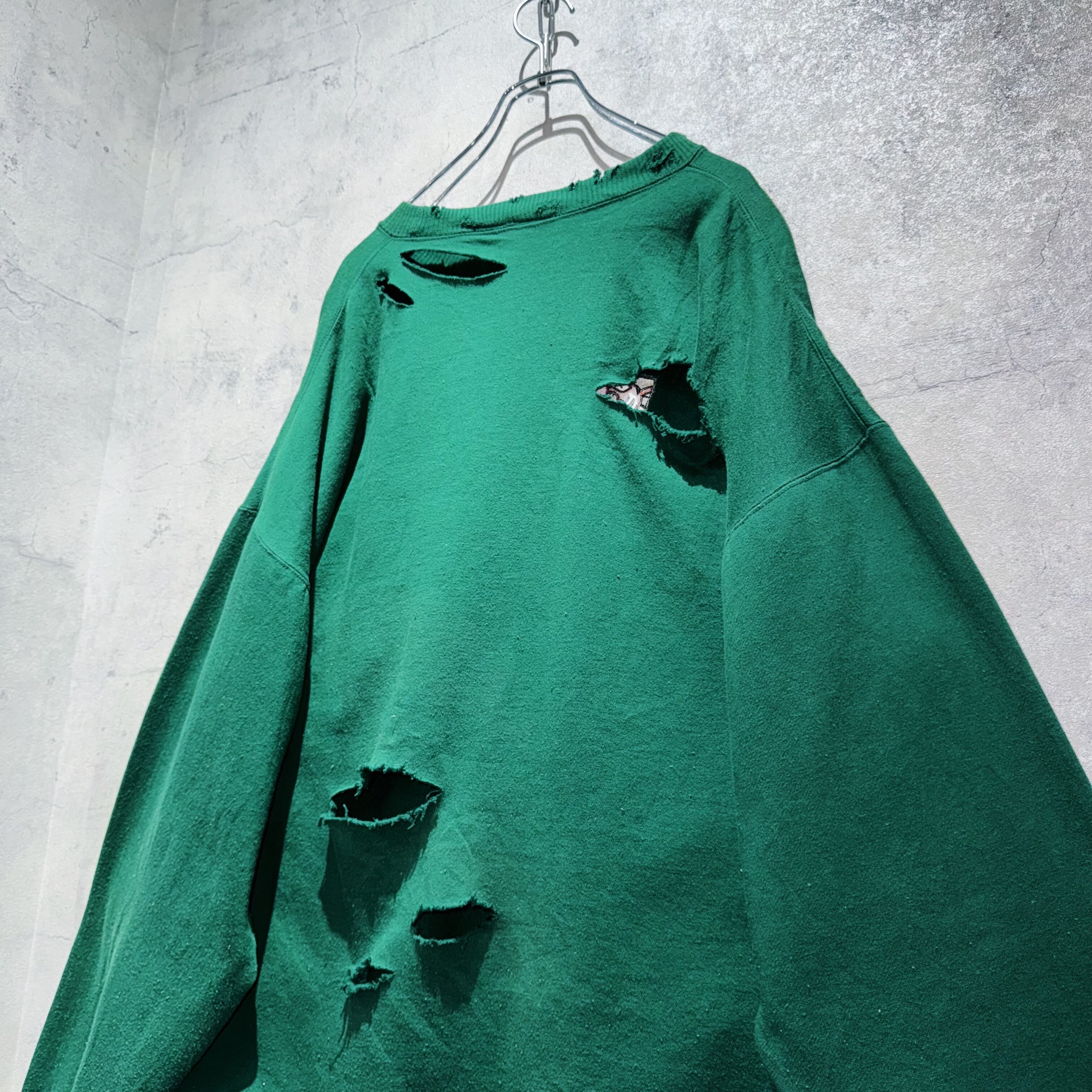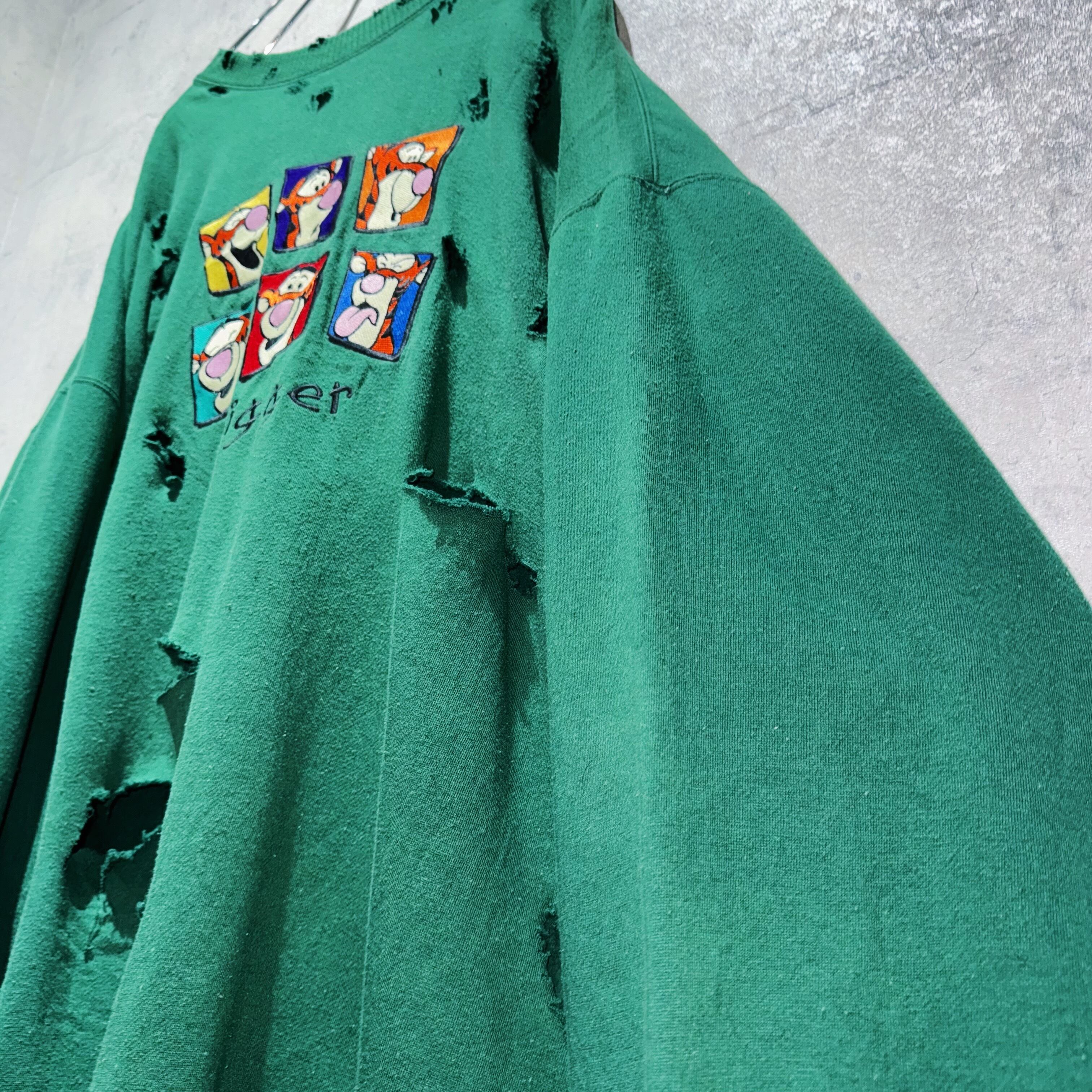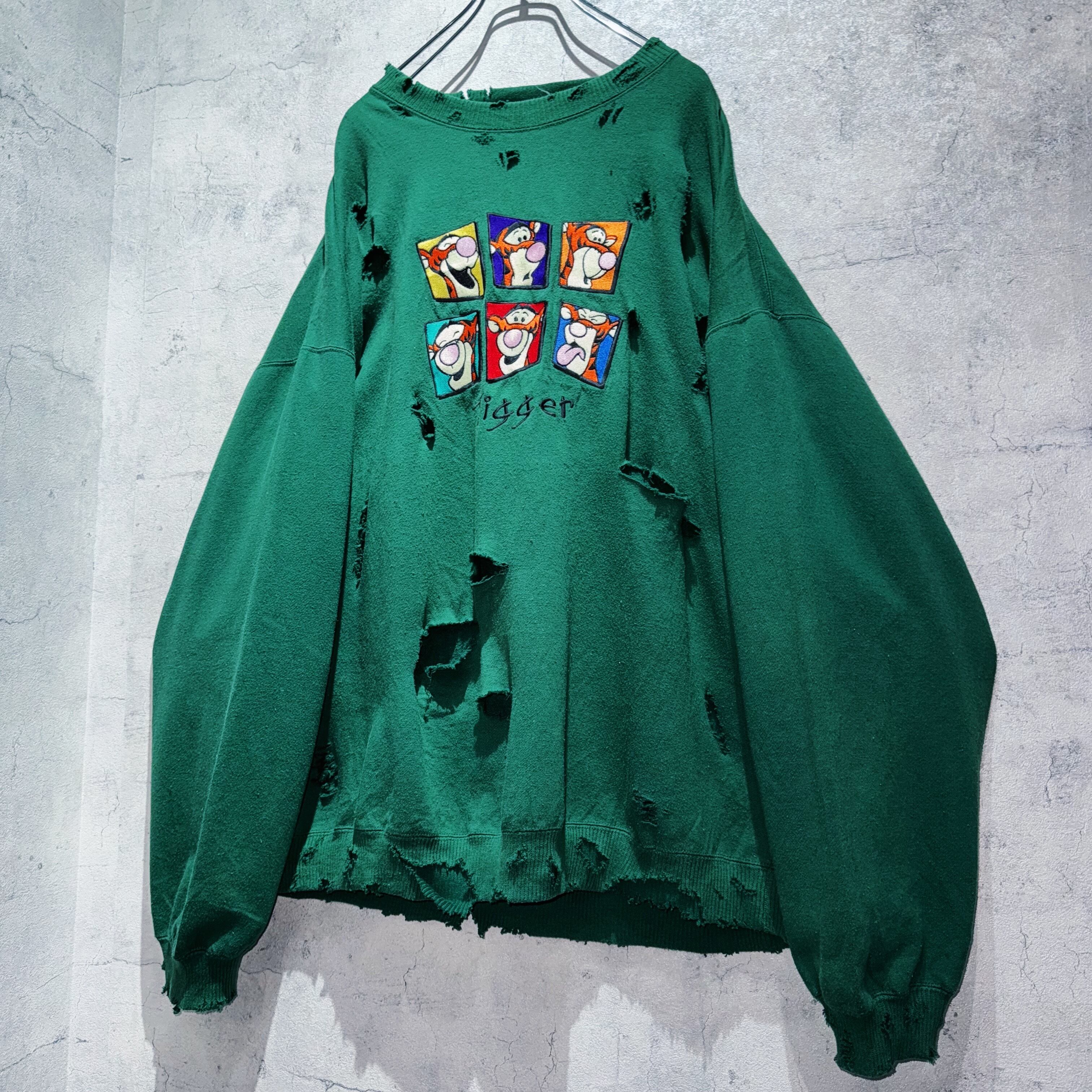 90年代にディズニーカタログで販売されていた「くまのプーさん」のキャラクターティガーの喜怒哀楽が描かれた刺繍デザインのプルオーバースウェット。そんな可愛らしいデザインを大胆にボロリメイクした個性的な一枚。