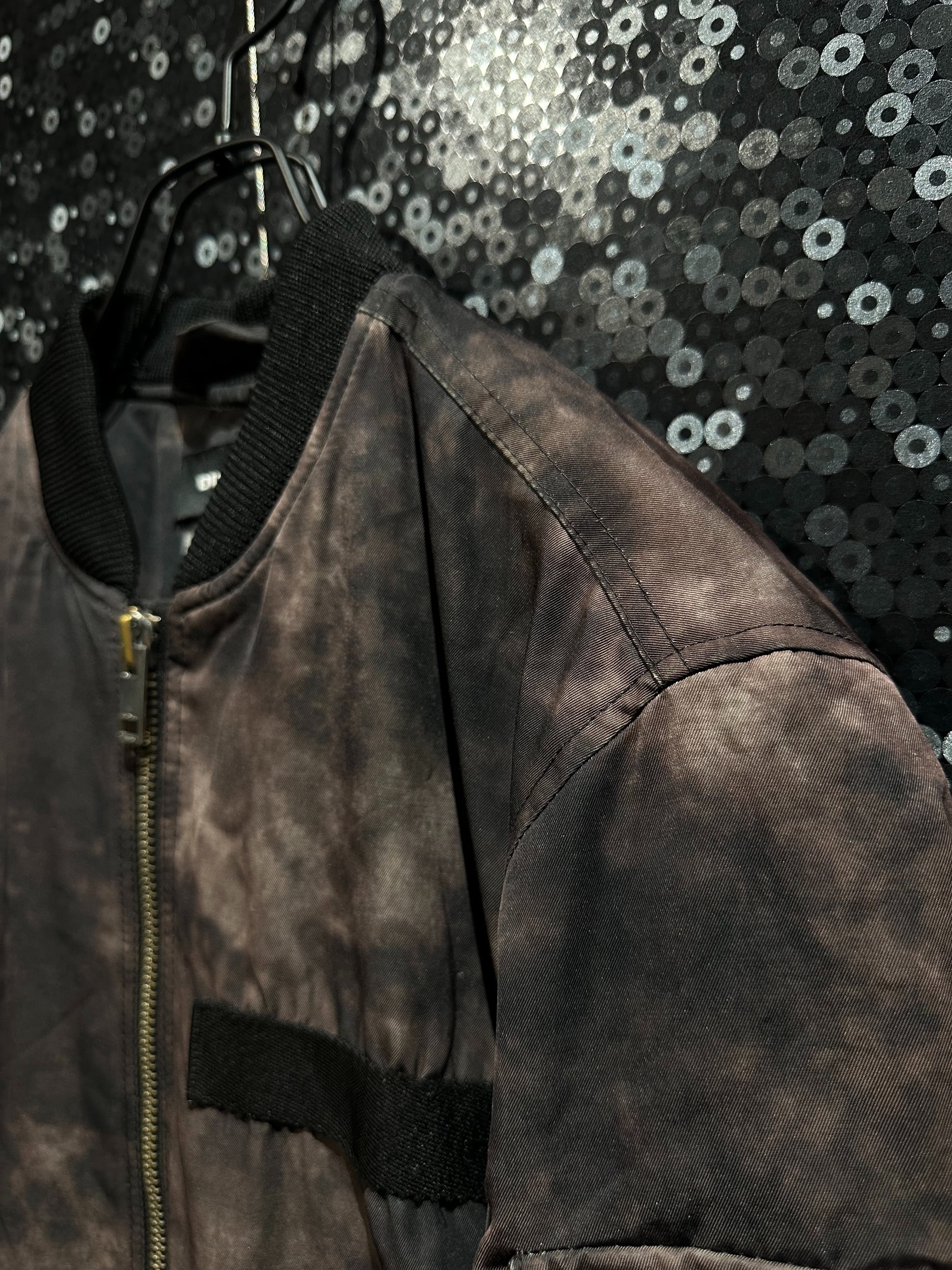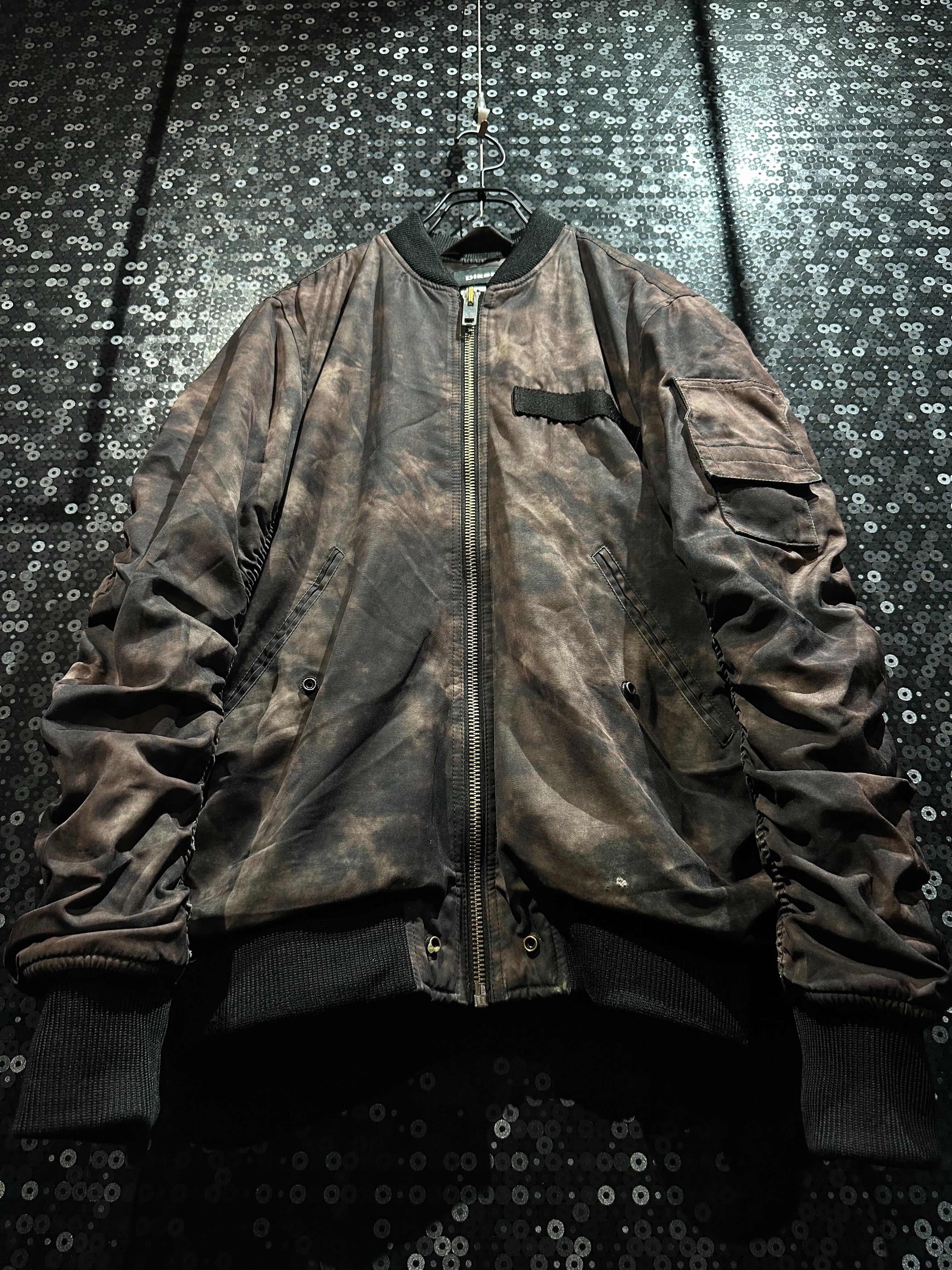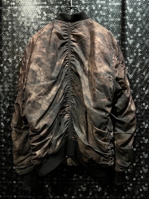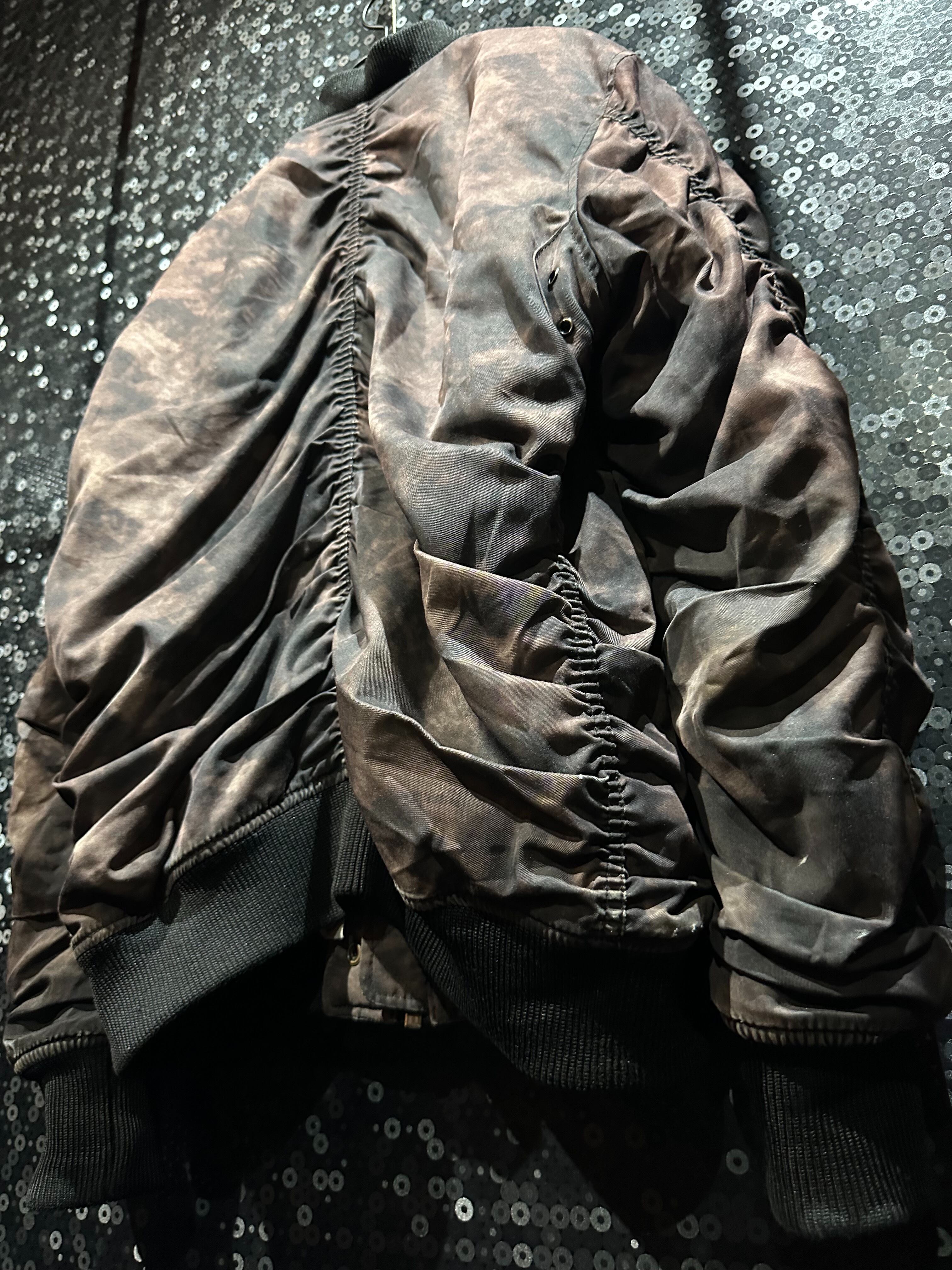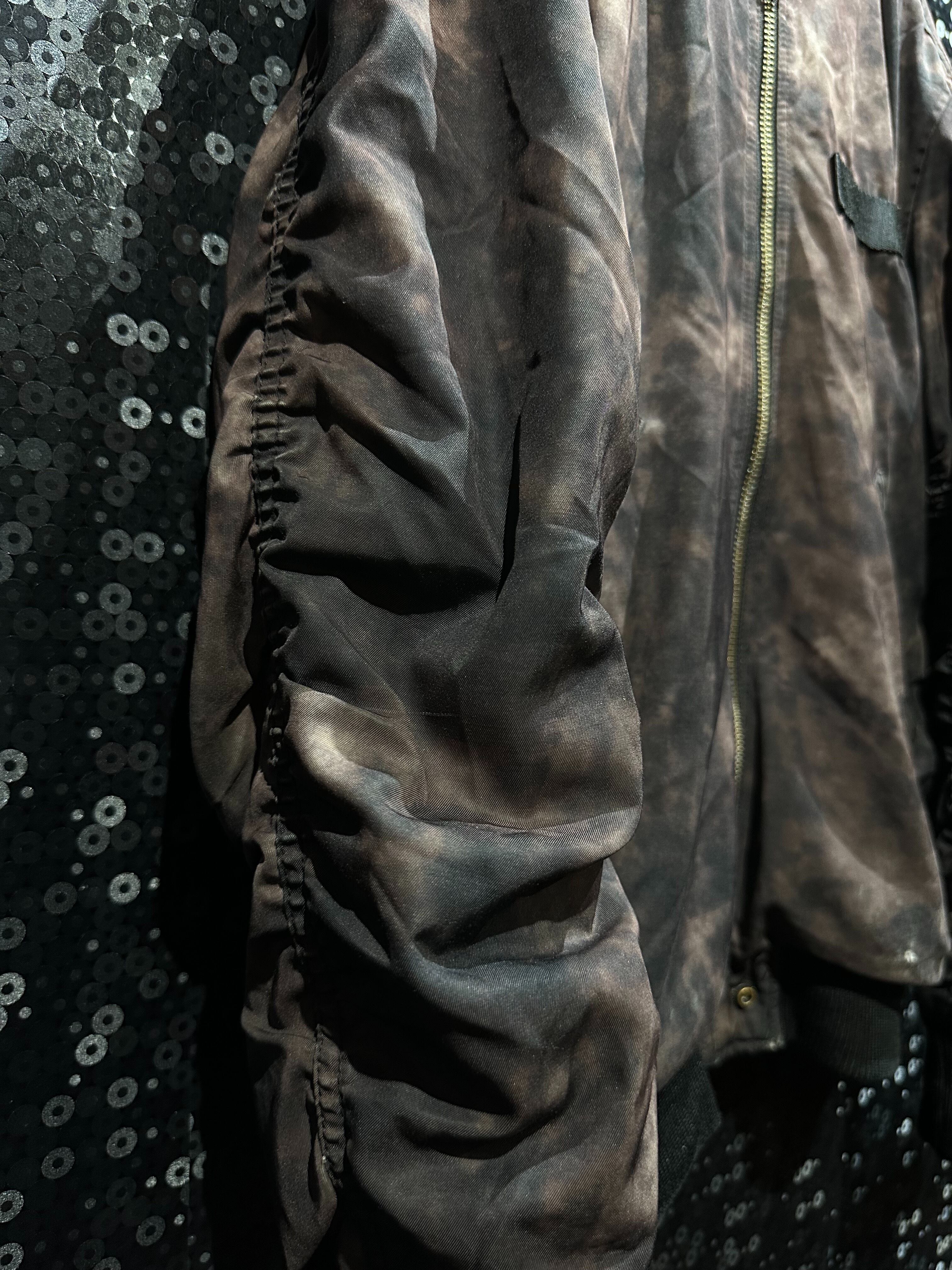 退廃的なグラデーションカラーのボディにギャザーが肩から袖にかけて、背面首元から裾にかけてデザインされたデザイン。そのファッショナブルなデザインをヴィンテージのフライトジャケットに落とし込むセンス。さすがは"DIESEL”。