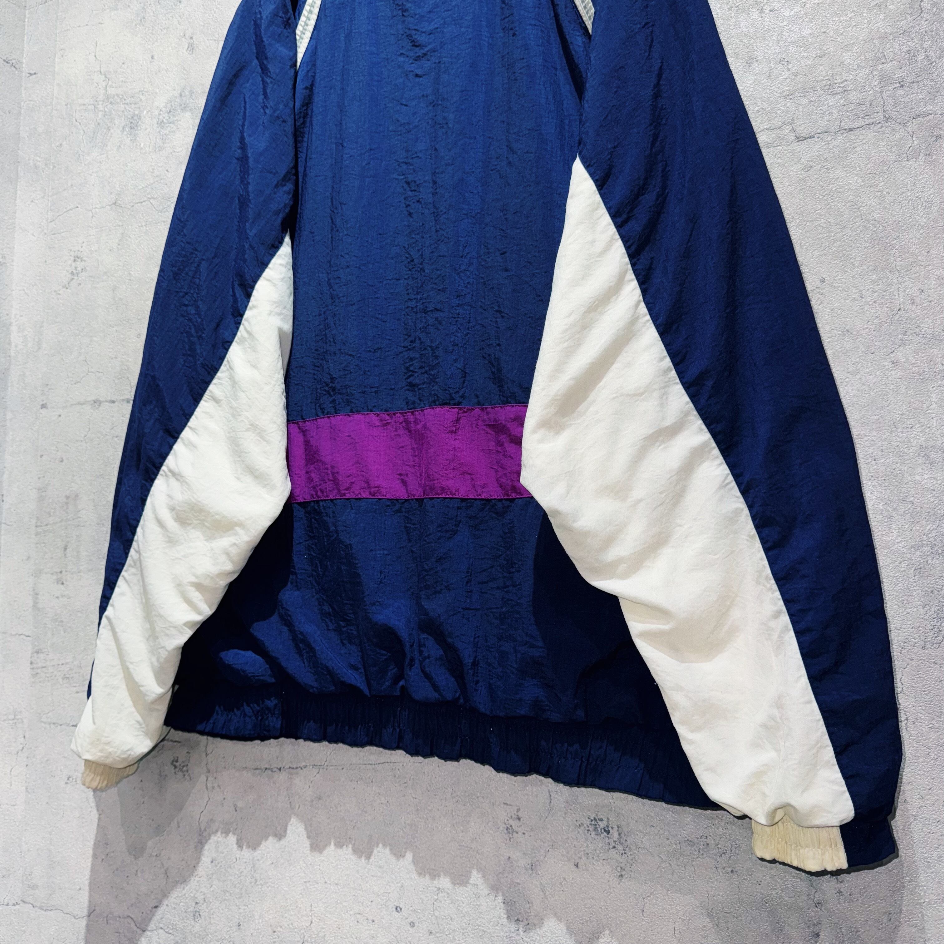 深〜いミッドナイトブルーをメインカラーに、パープル・ホワイト・グレーの切り替えがアクセントになった、カラーリングと配色バランスが素晴らしいナイロンジャケット。ナイロン特有の程よい光沢も相まって高級感のある仕上がりに。