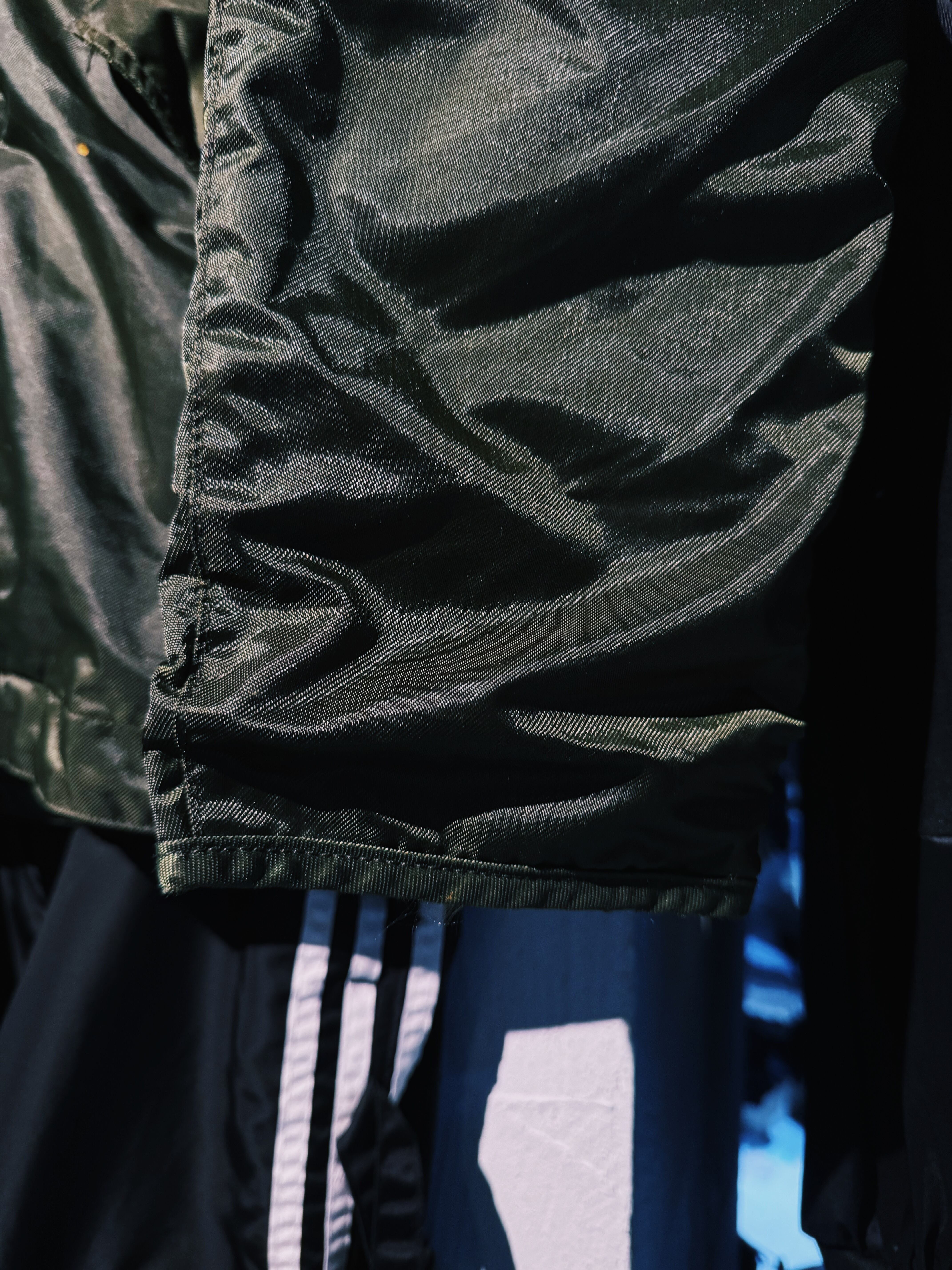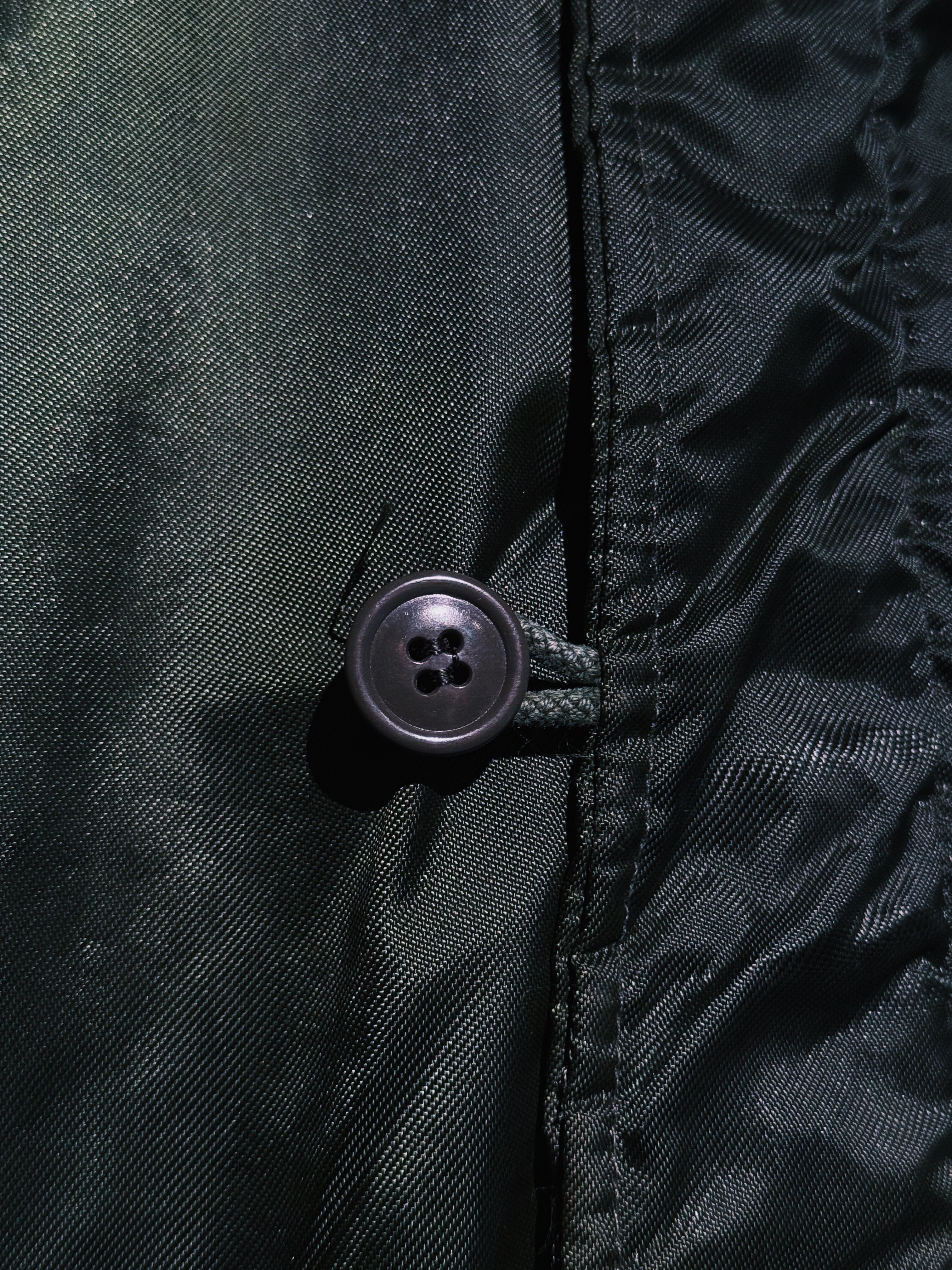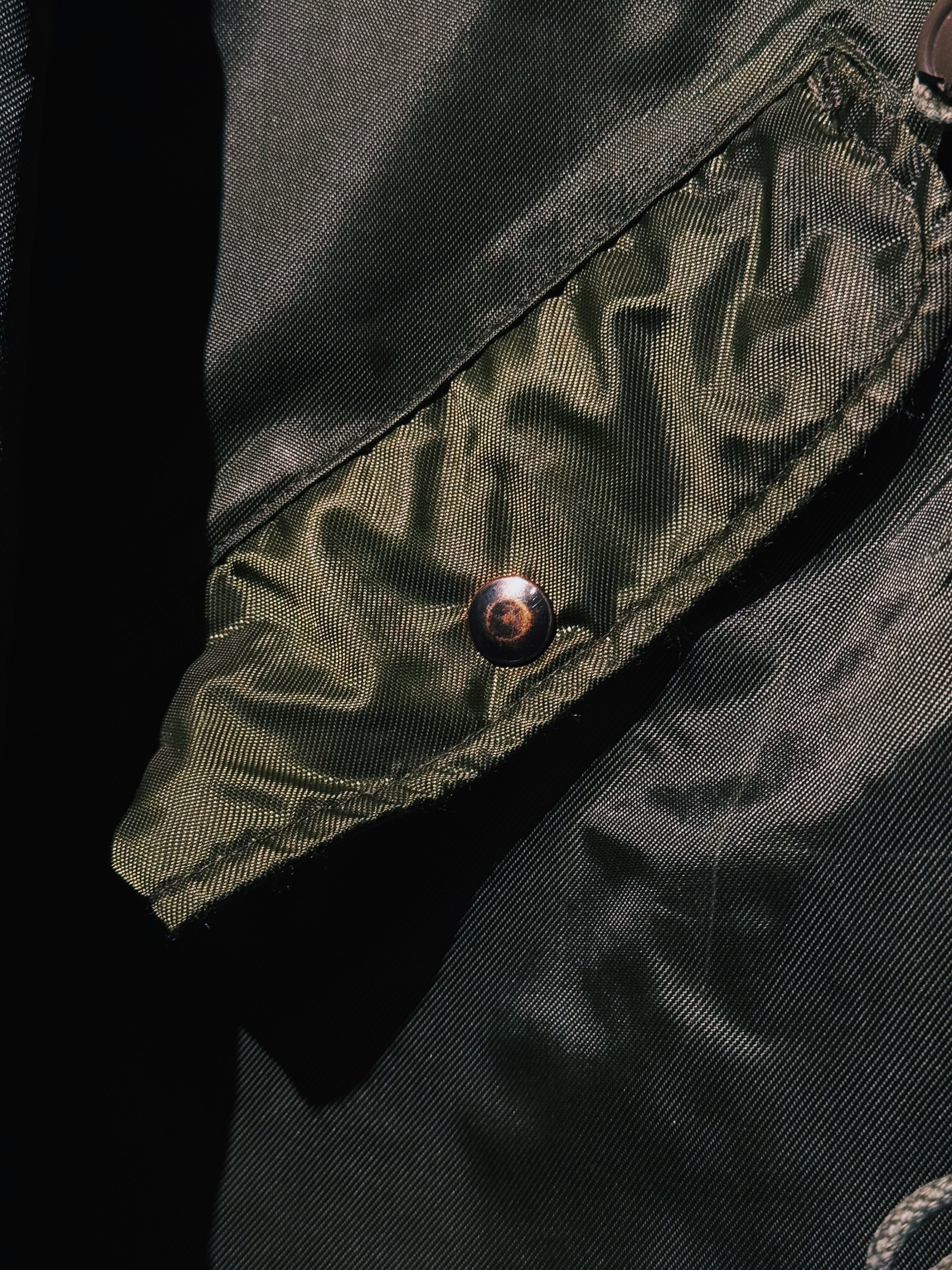 撥水性ナイロン素材でA-2などにはない光沢感があり、また違ったデッキジャケットが楽しめるかと思います。