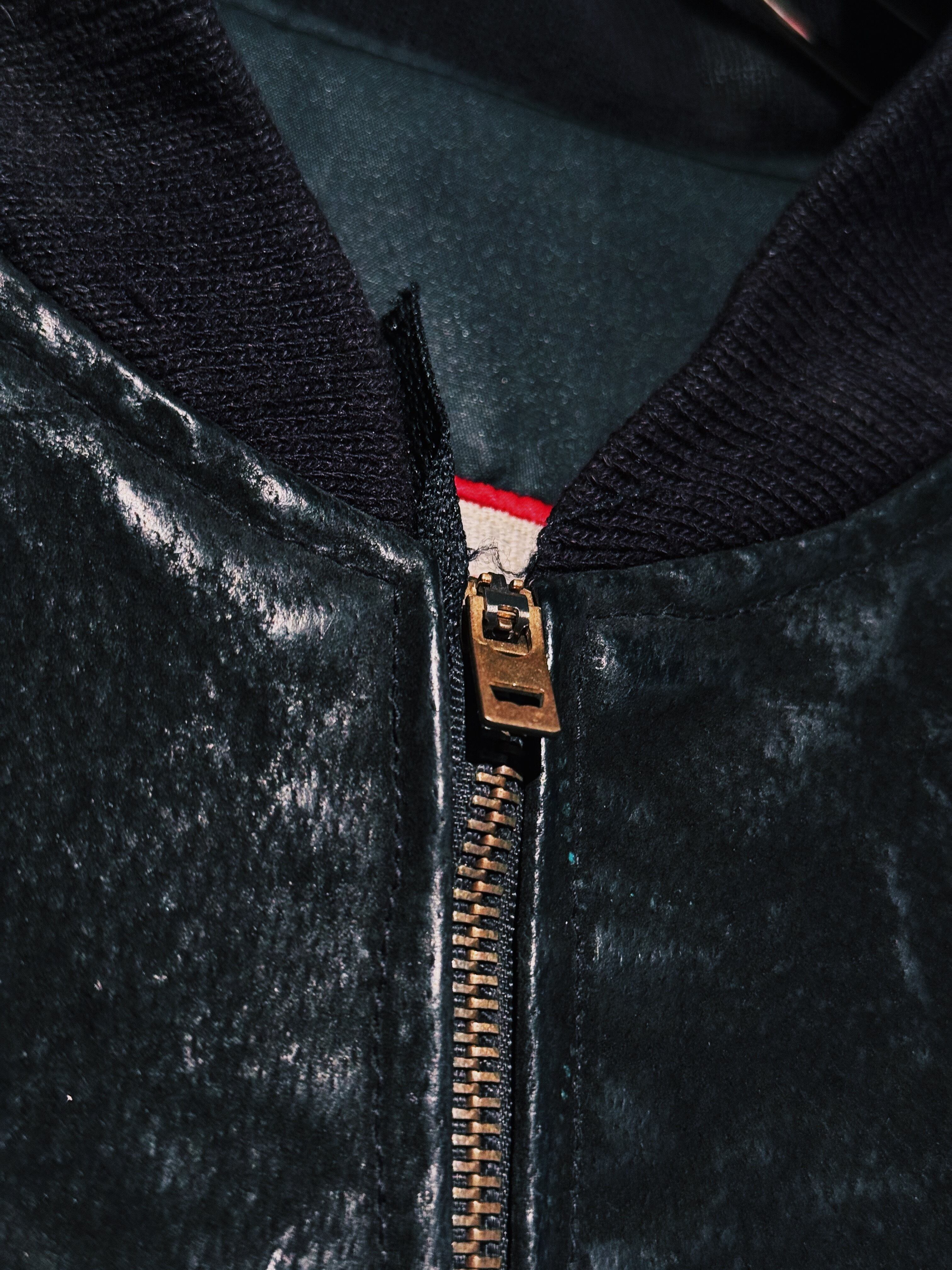 表は柔らかなスエードレザーを採用しており、フロントとバックにはスムースレザーのワッペンで頭文字とロゴを載せた贅沢な1着。