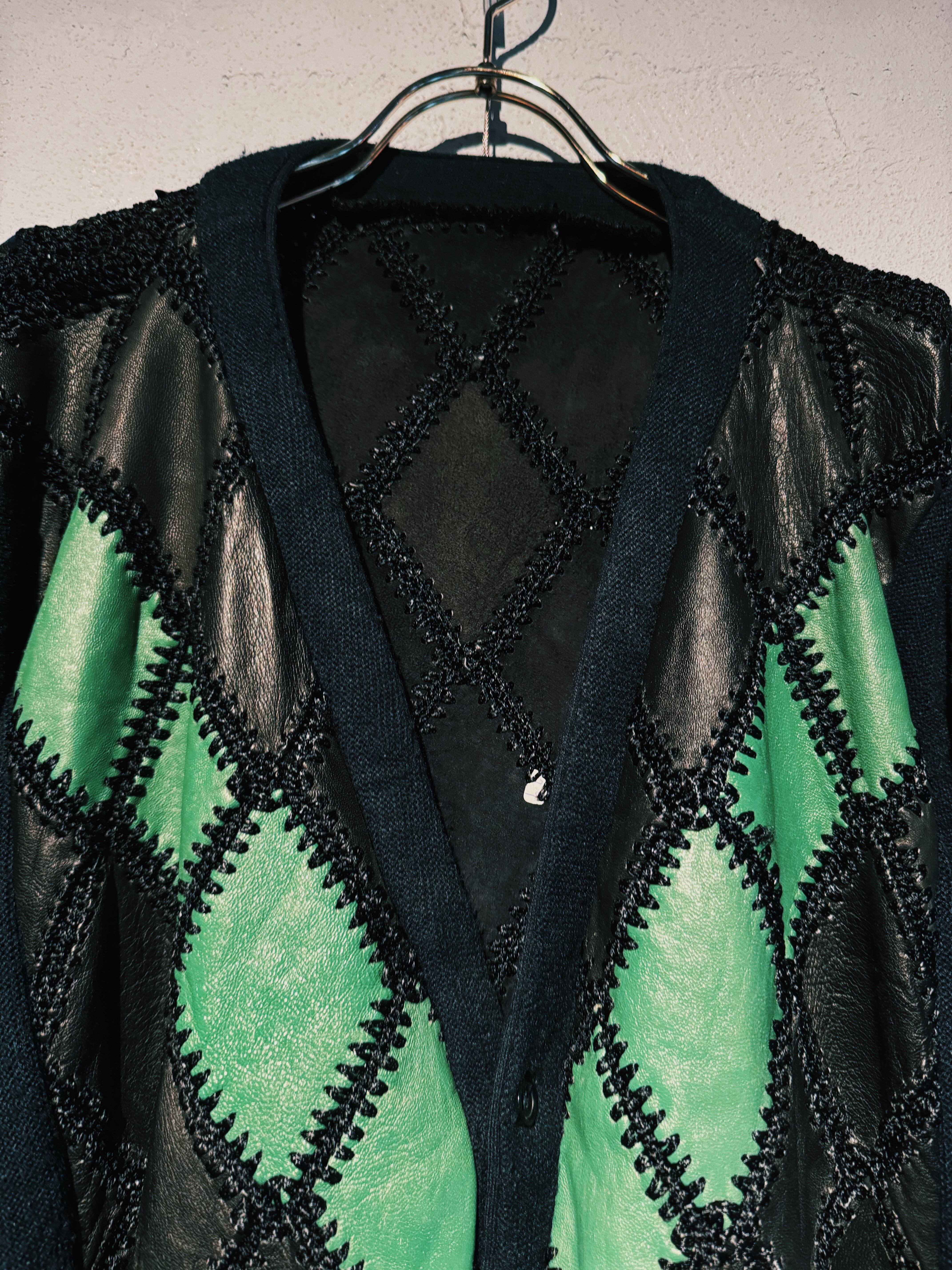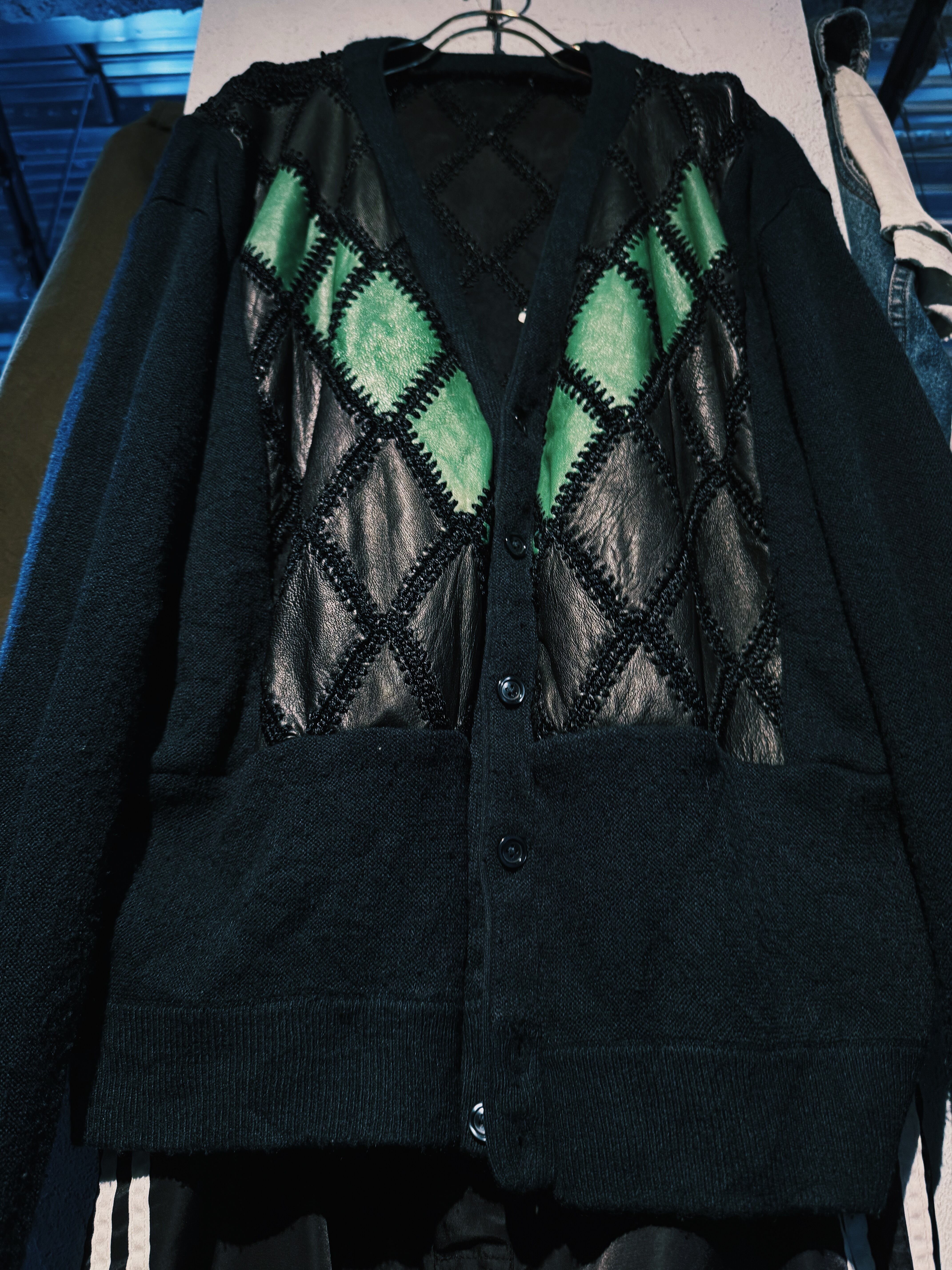 菱形で切り取られたブラックカラーの上質なレザーをツギハギし、非常に発色の良いレッドのカーディガンにドッキングしたスペシャルアイテム。