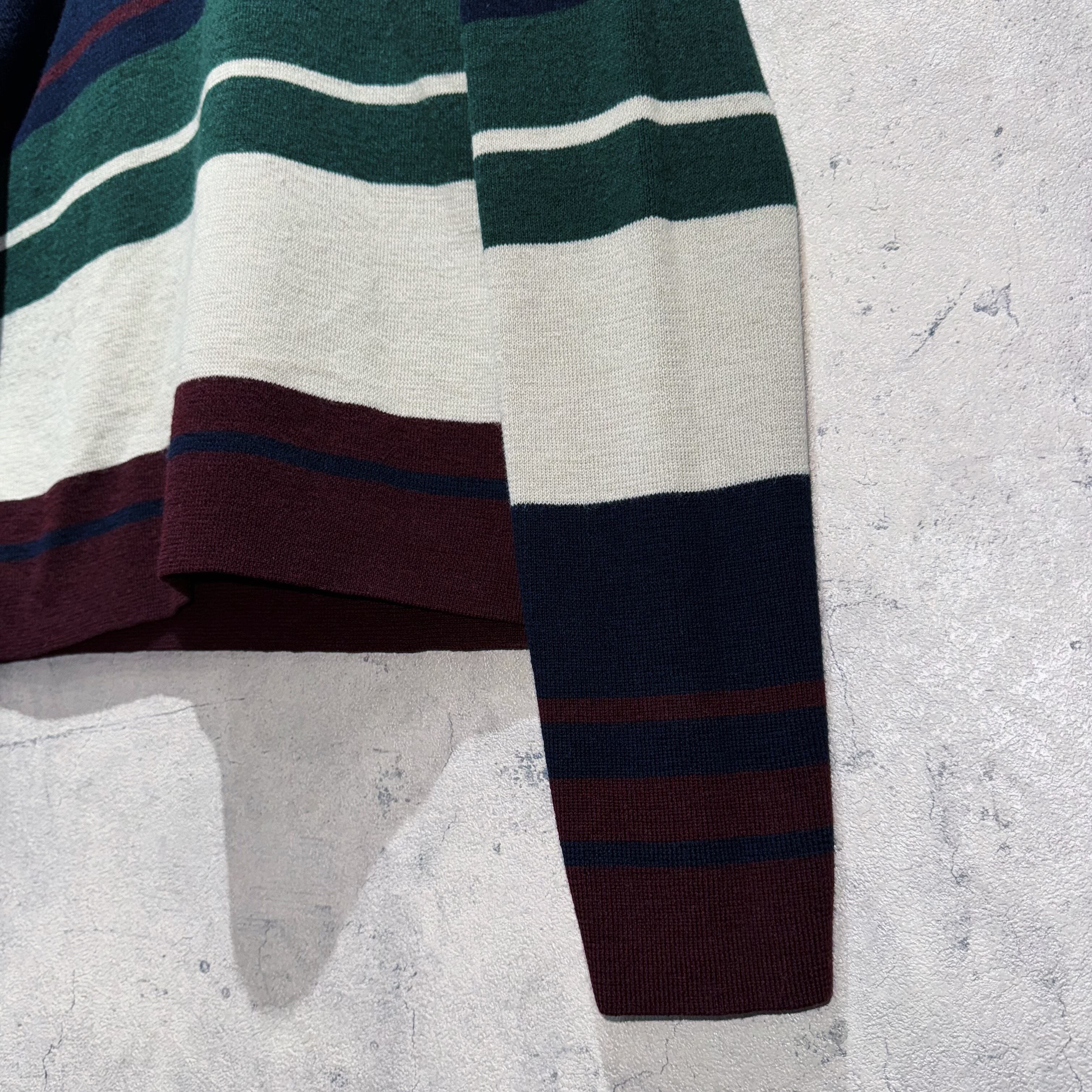 ワインレッドやオリーブグリーンなど複雑な色合いながらも配色バランスが素晴らしく、カラーリングが素晴らしいボーダーニット。