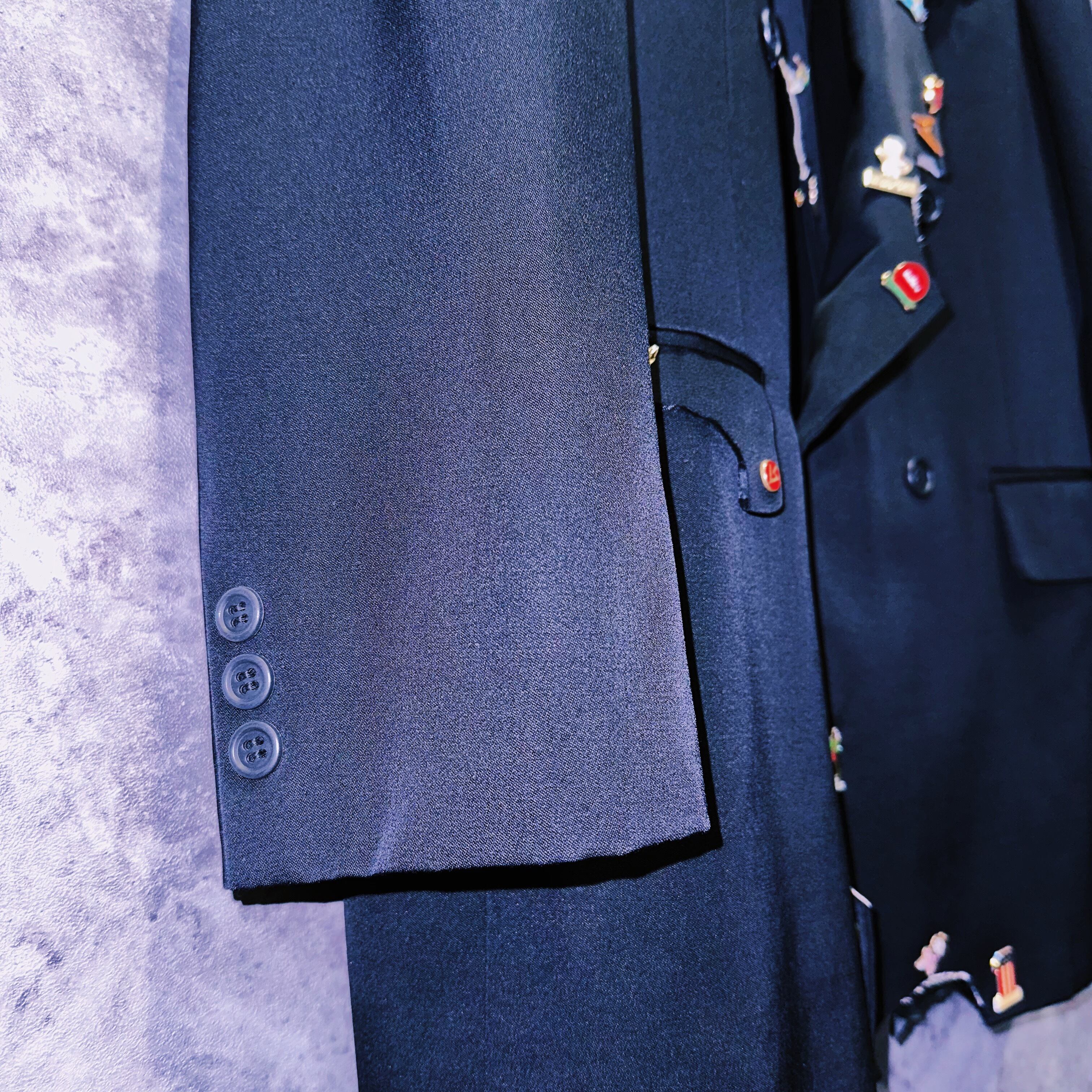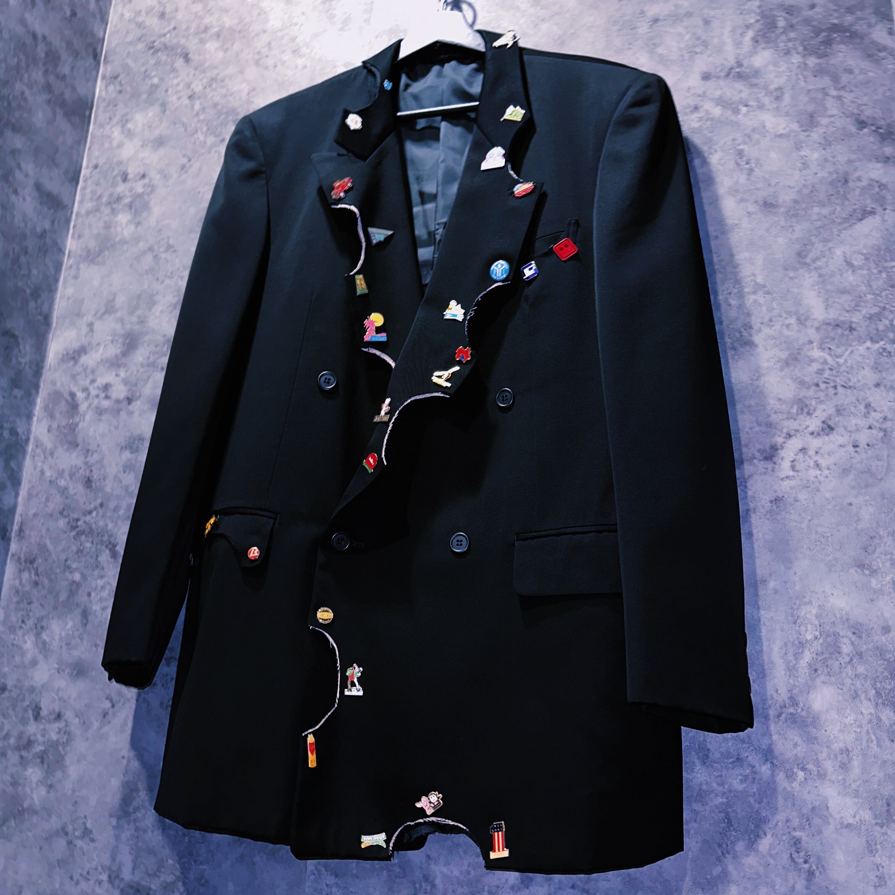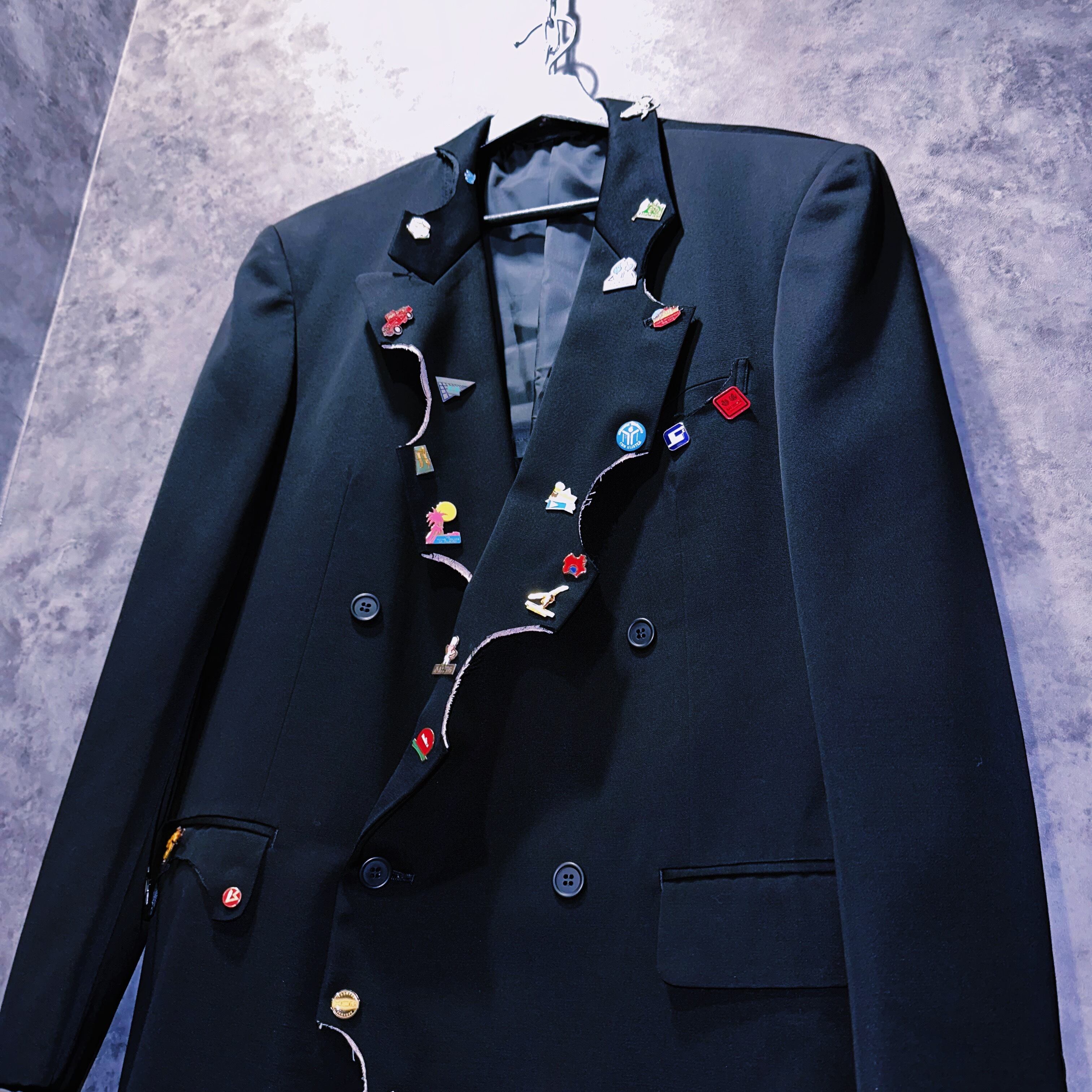 マットでハイモードなムードを醸し出すブラックカラーのボディにヴィンテージのピンズが全体に施されたダブルブレストセットアップ。さらに随所にカッティングをあしらったハイブランド顔負けのアバンギャルドな仕上がりに。