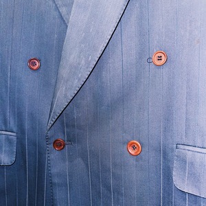 リッチグリーンストライプを纏った大人の品格とラグジュアリーさを演出。ダブルブレストには珍しい細めのラペルはシャープな仕上がりに。