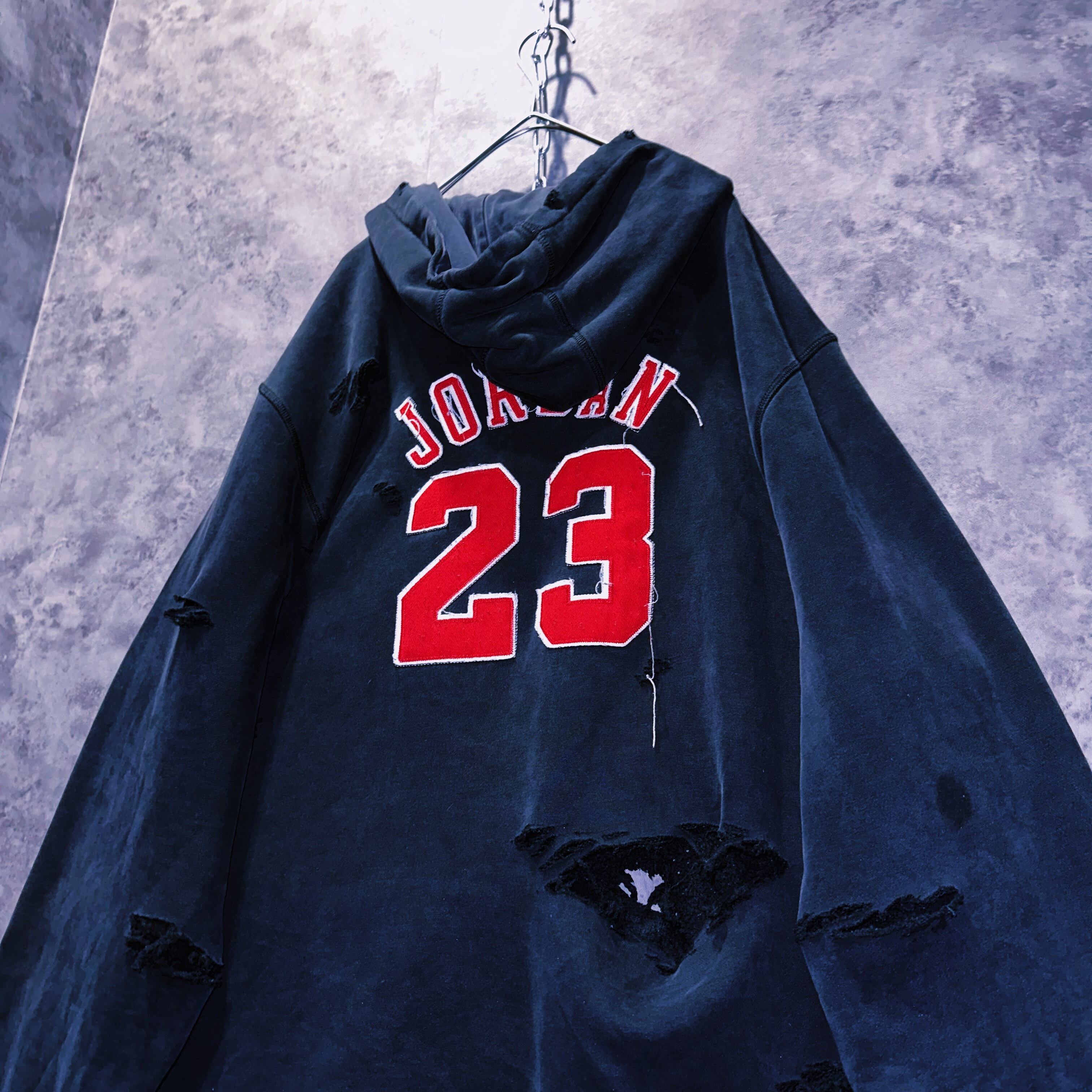 シカゴブルズのカレッジワッペンがカスタムされており、ステッチは垂れ流しのグランジスタイルのフーディー23番にバックにはJORDANと施されており語る事なしの間違いない一着。