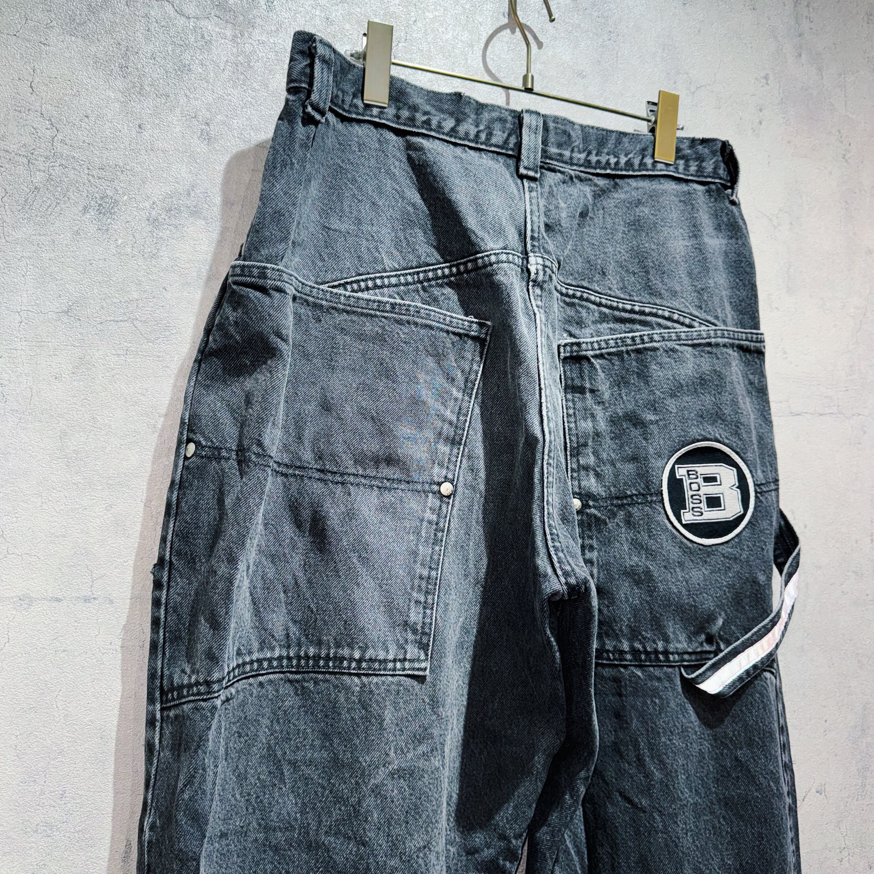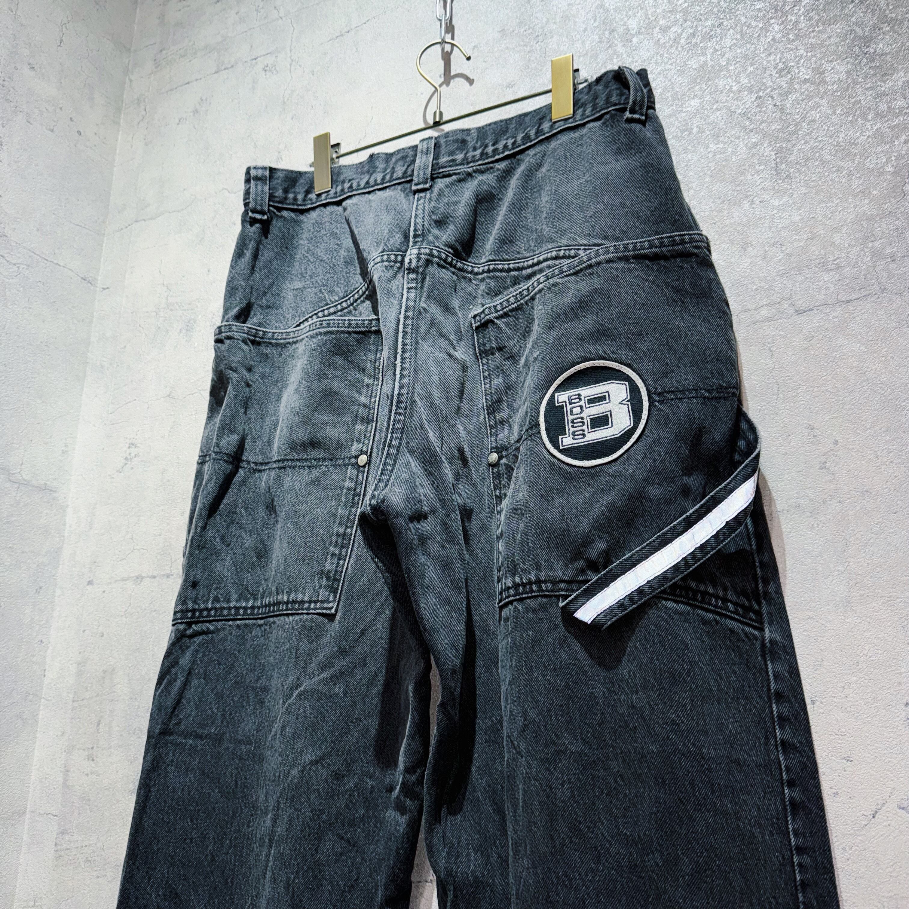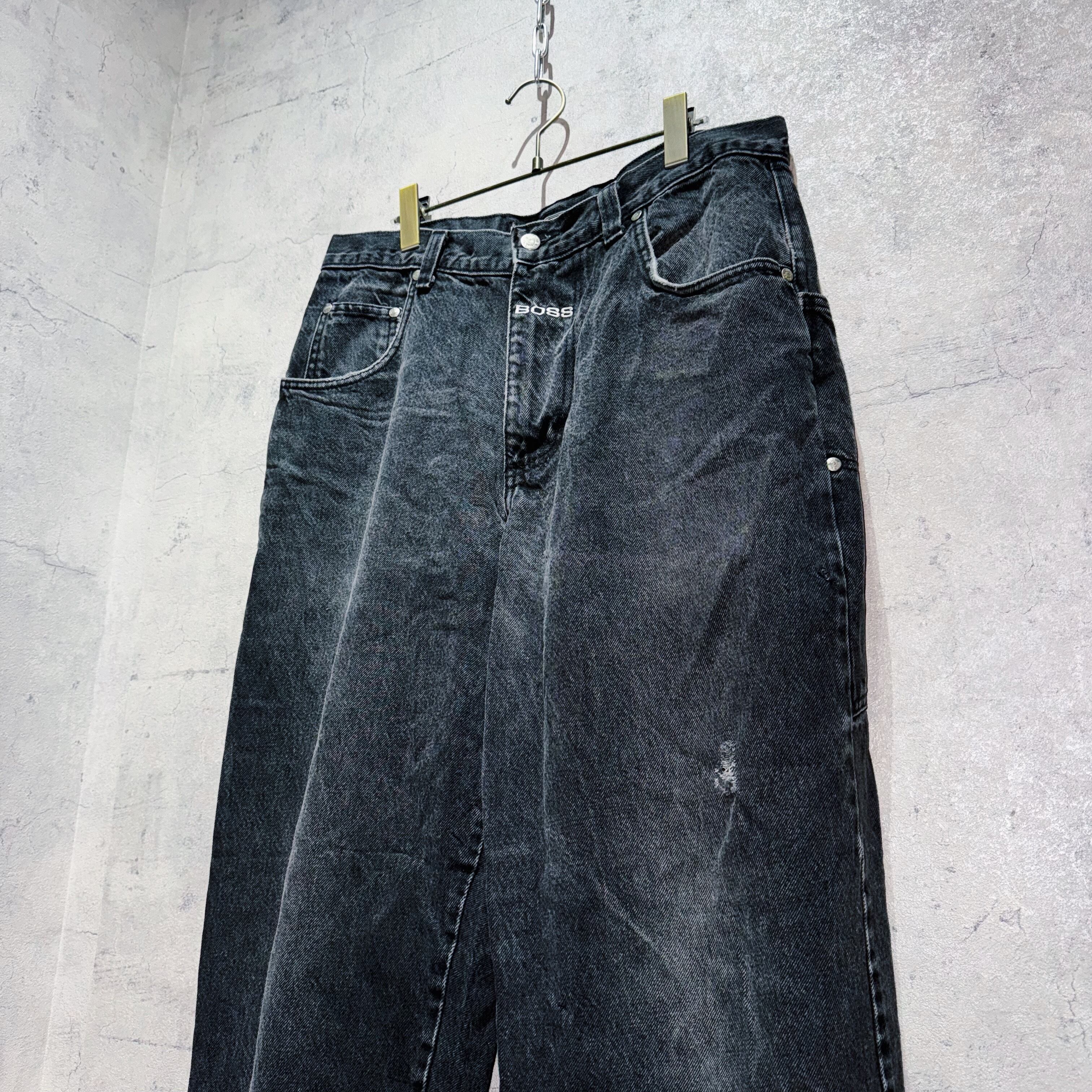 ”ボス”ブランドロゴデザインインクブラックカラーワイドバギーデニムパンツ
