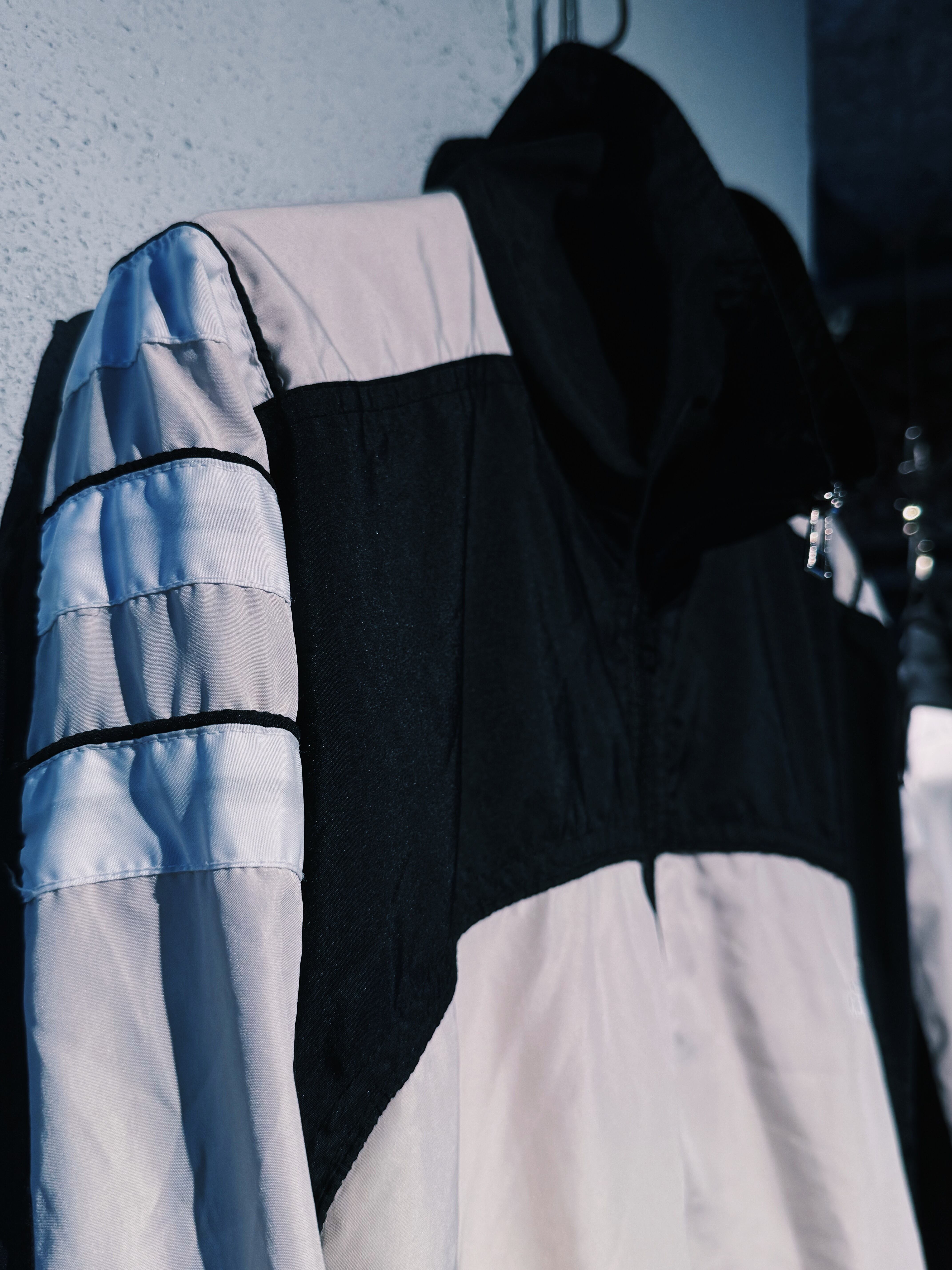 モノトーンな配色で、全く見かけない圧倒的なデザイン性が特徴的でどこか近未来感もある1着。