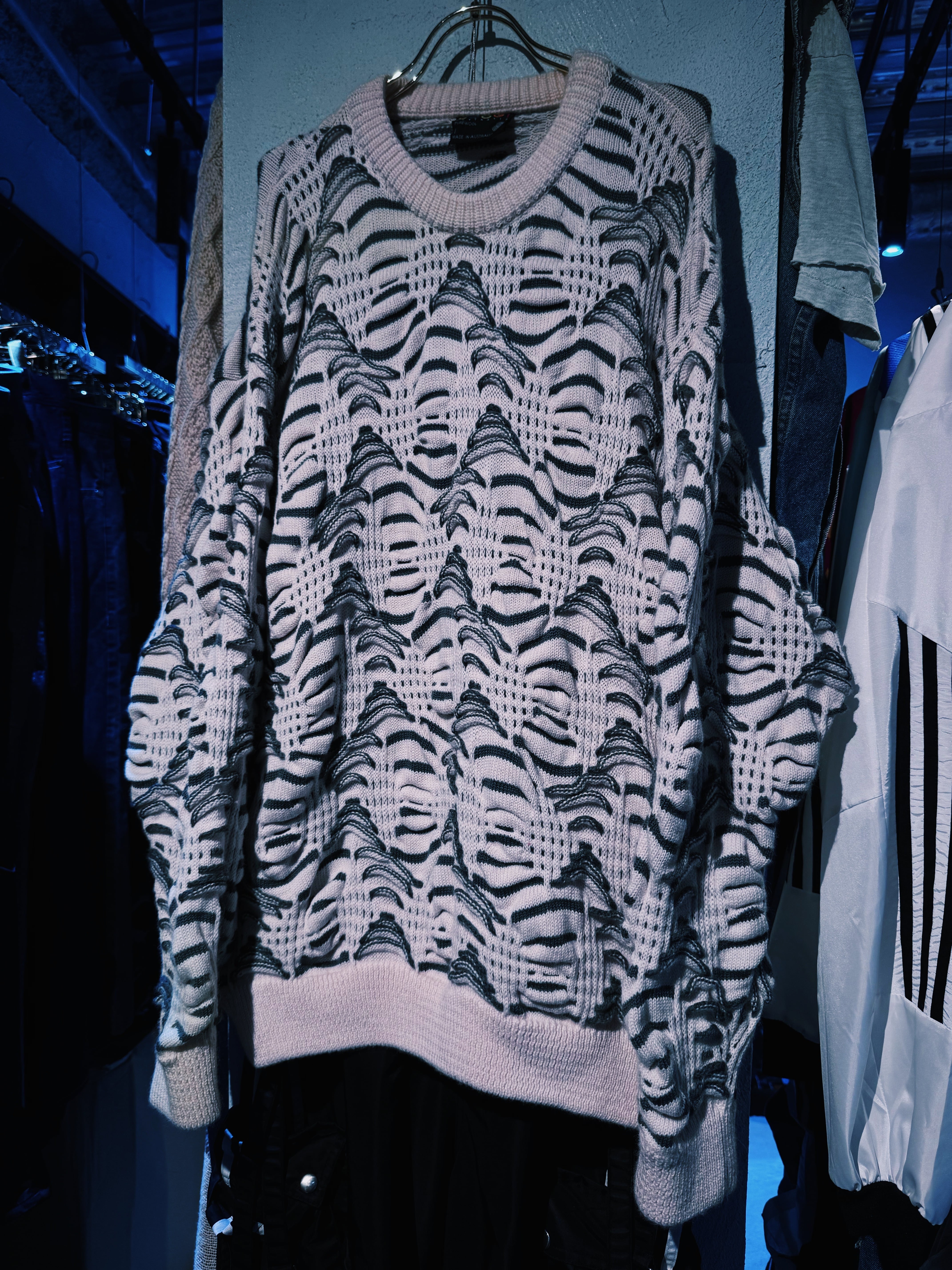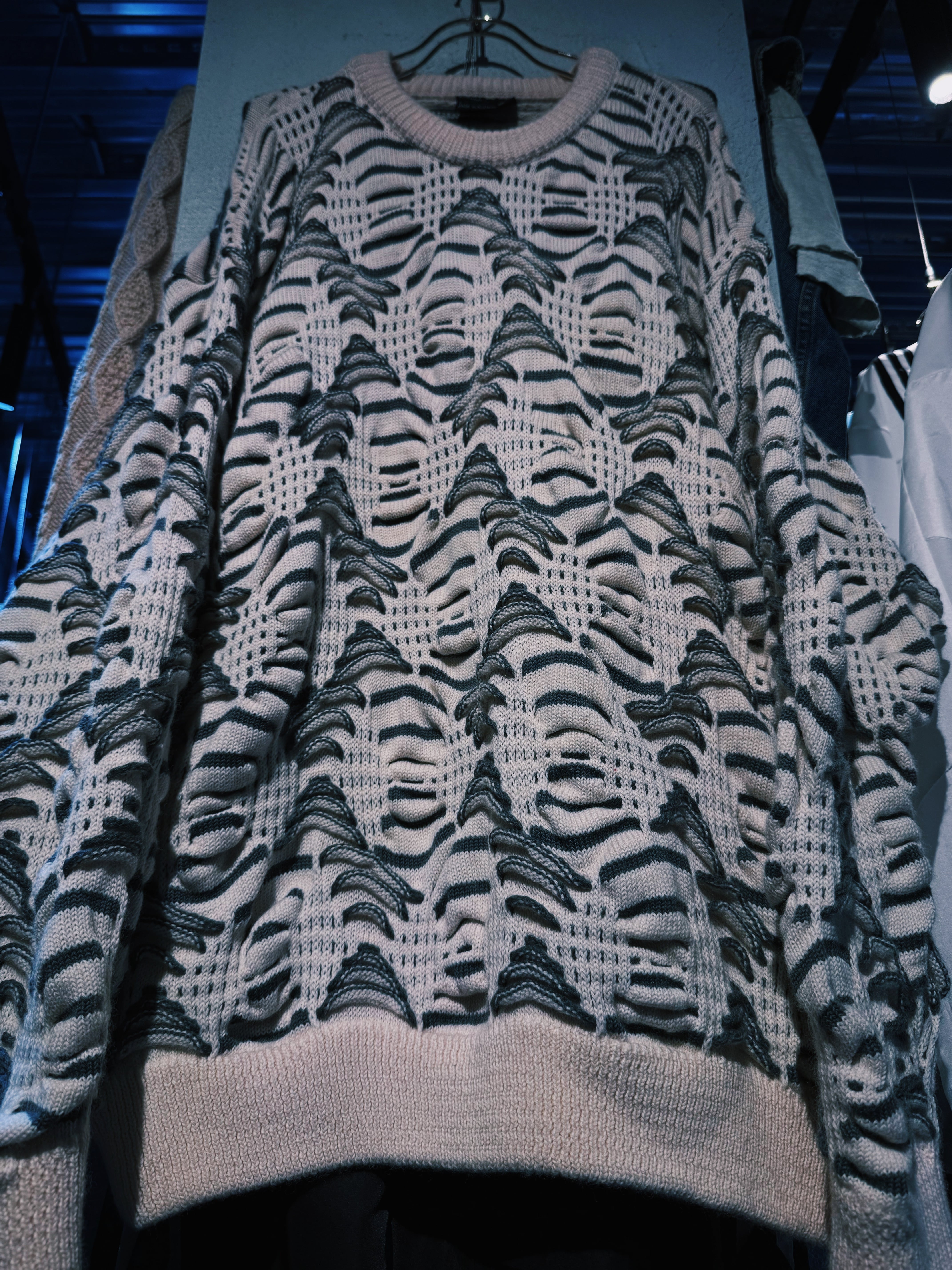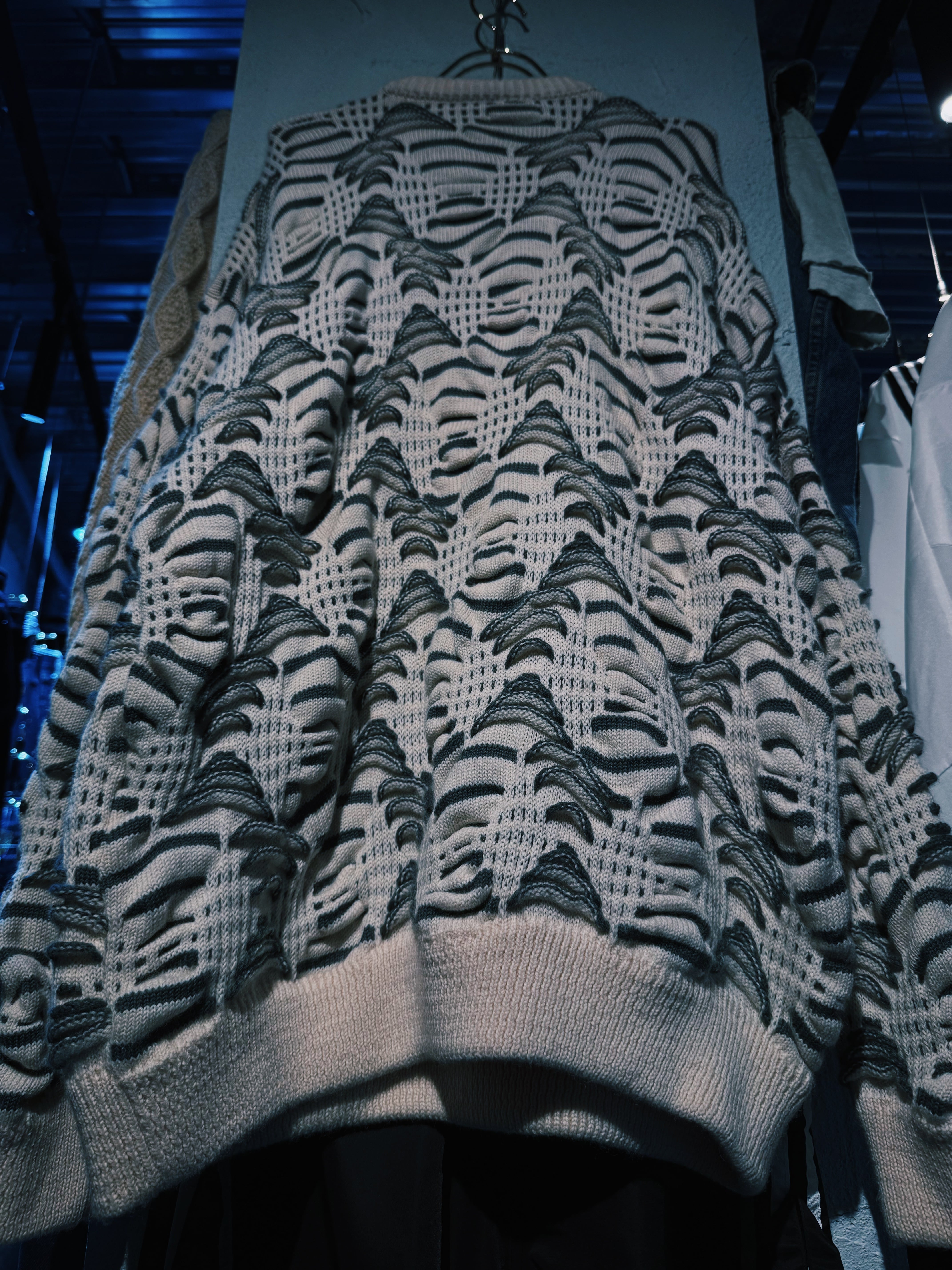 大胆なデザインと立体構造の織りを駆使したアイコニックなニット、全体的にゆったりとしたサイジング、3Dニットの立体的な構造が相まってリラックスした雰囲気かつ、シルクのような光沢感が高級感を演出。