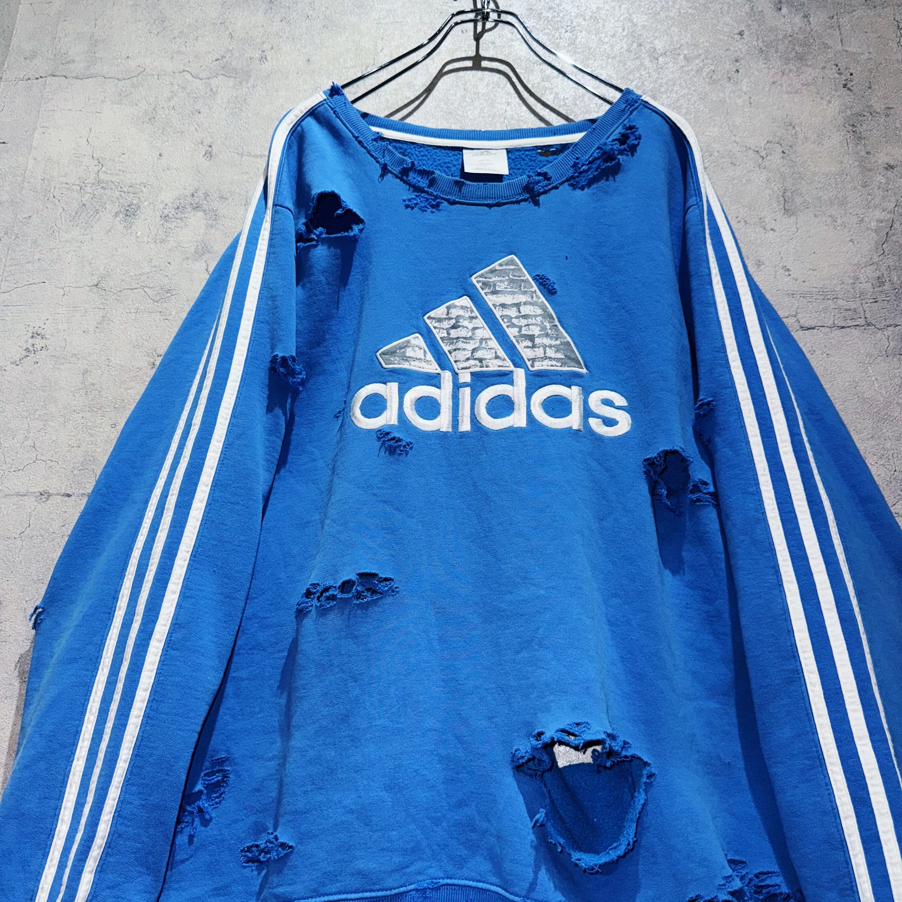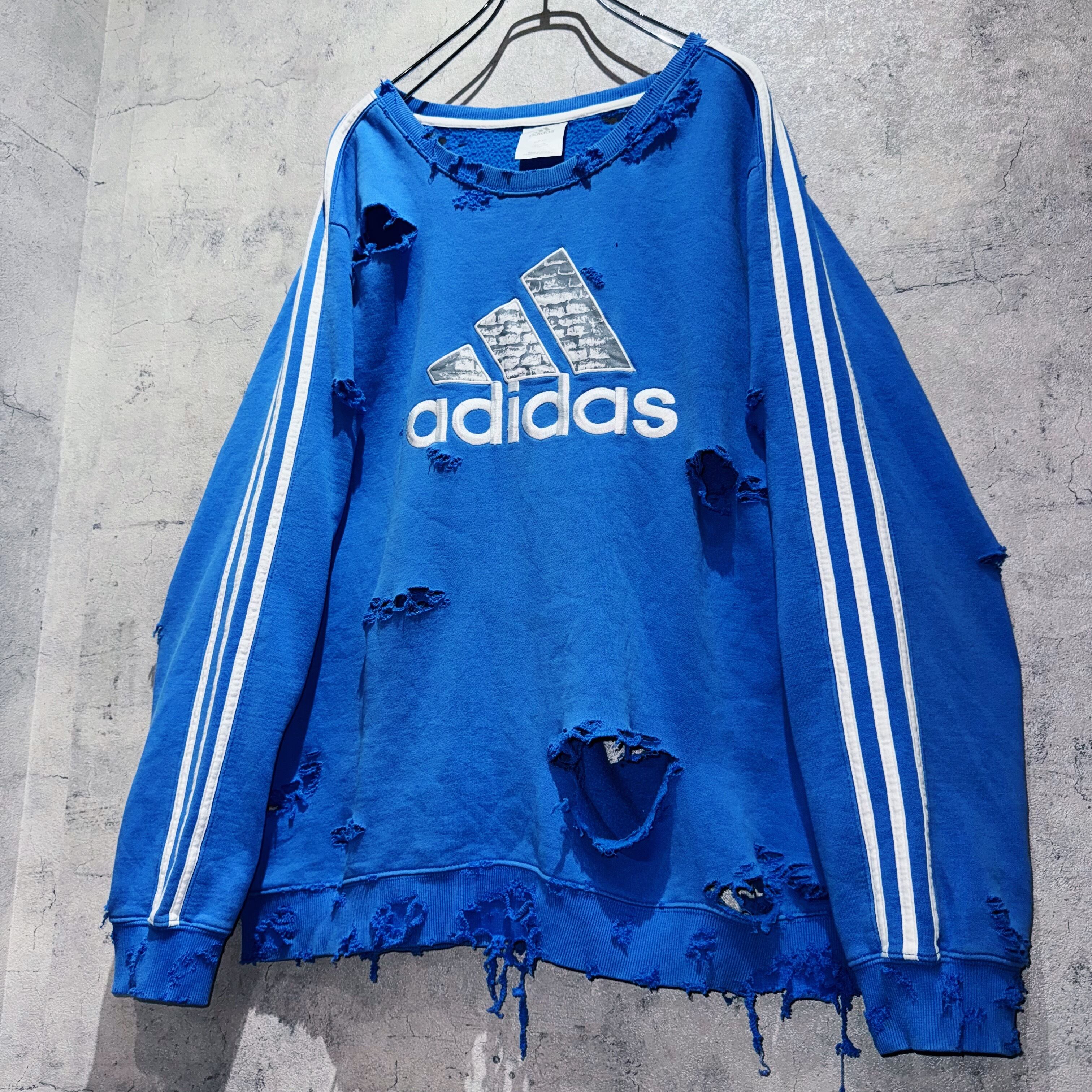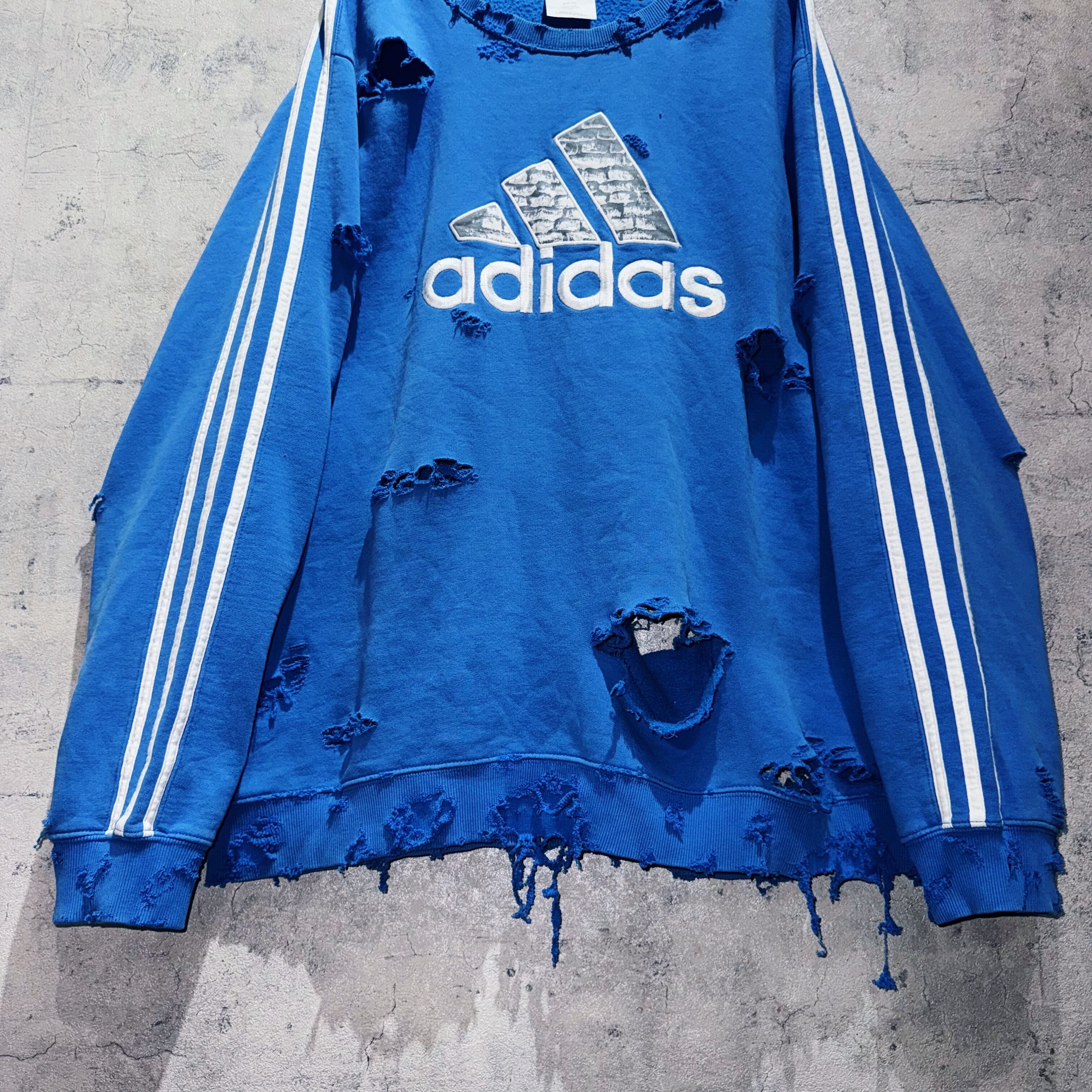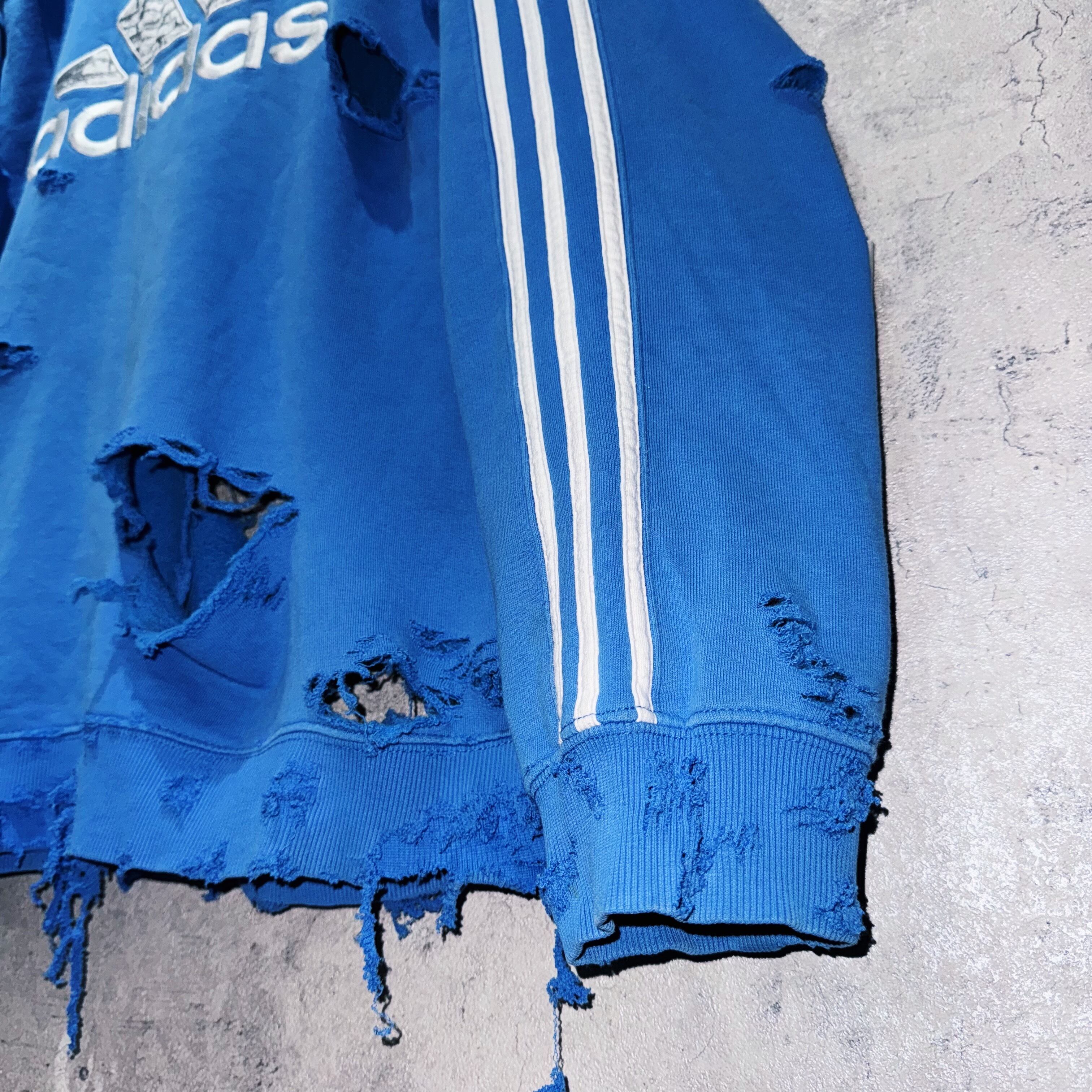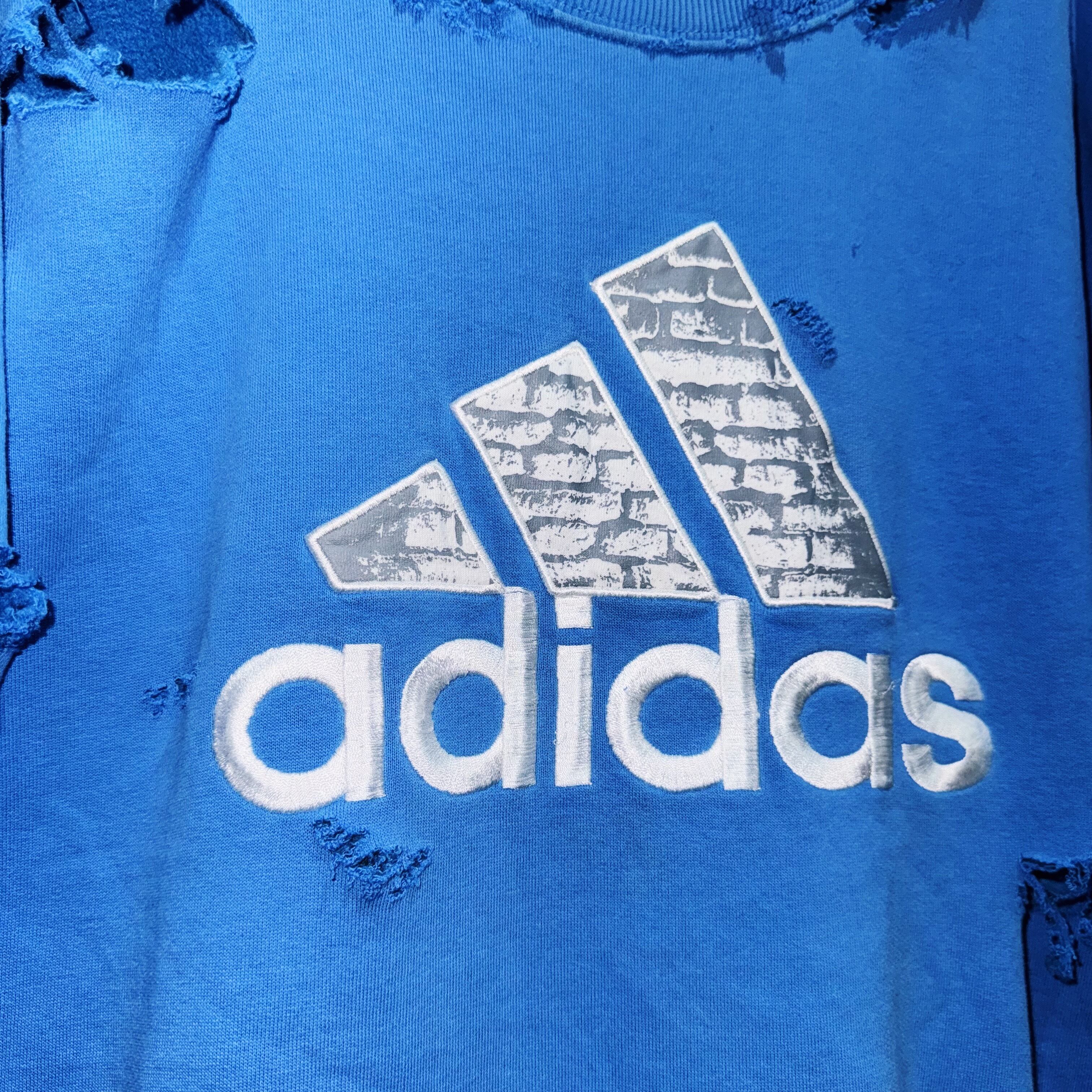 当店十八番のボロリメイクの中でもかなり人気の高い"ADIDAS"を贅沢にボロカスタムした一枚。ボディの淡いブルーの色味も魅力的でパフォーマンスロゴをフロントに、両サイドには3ストライプスあしらっておりボディも一級品。