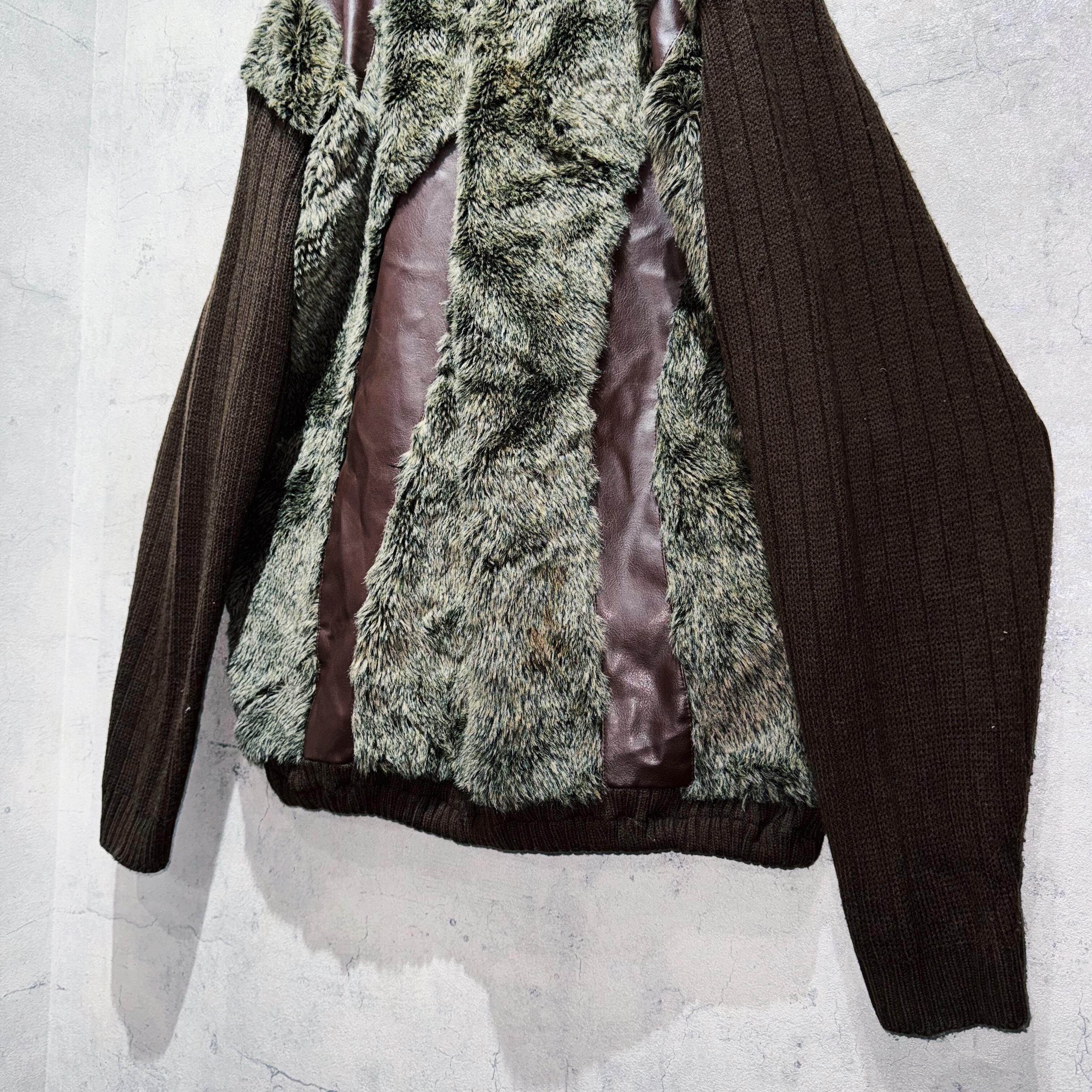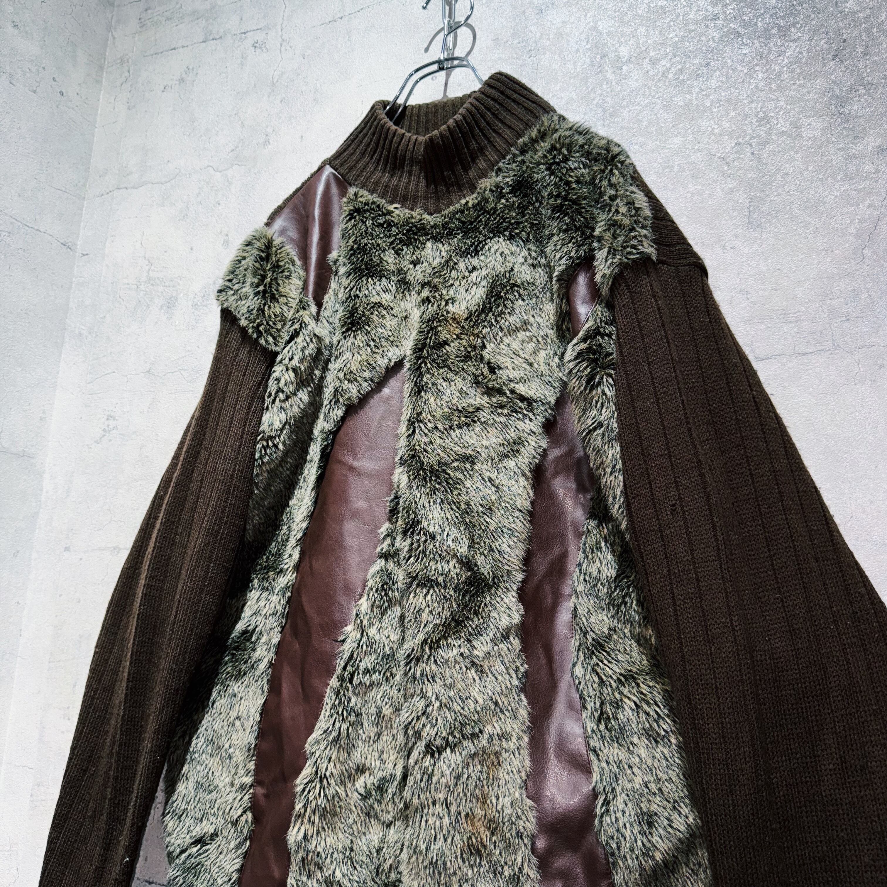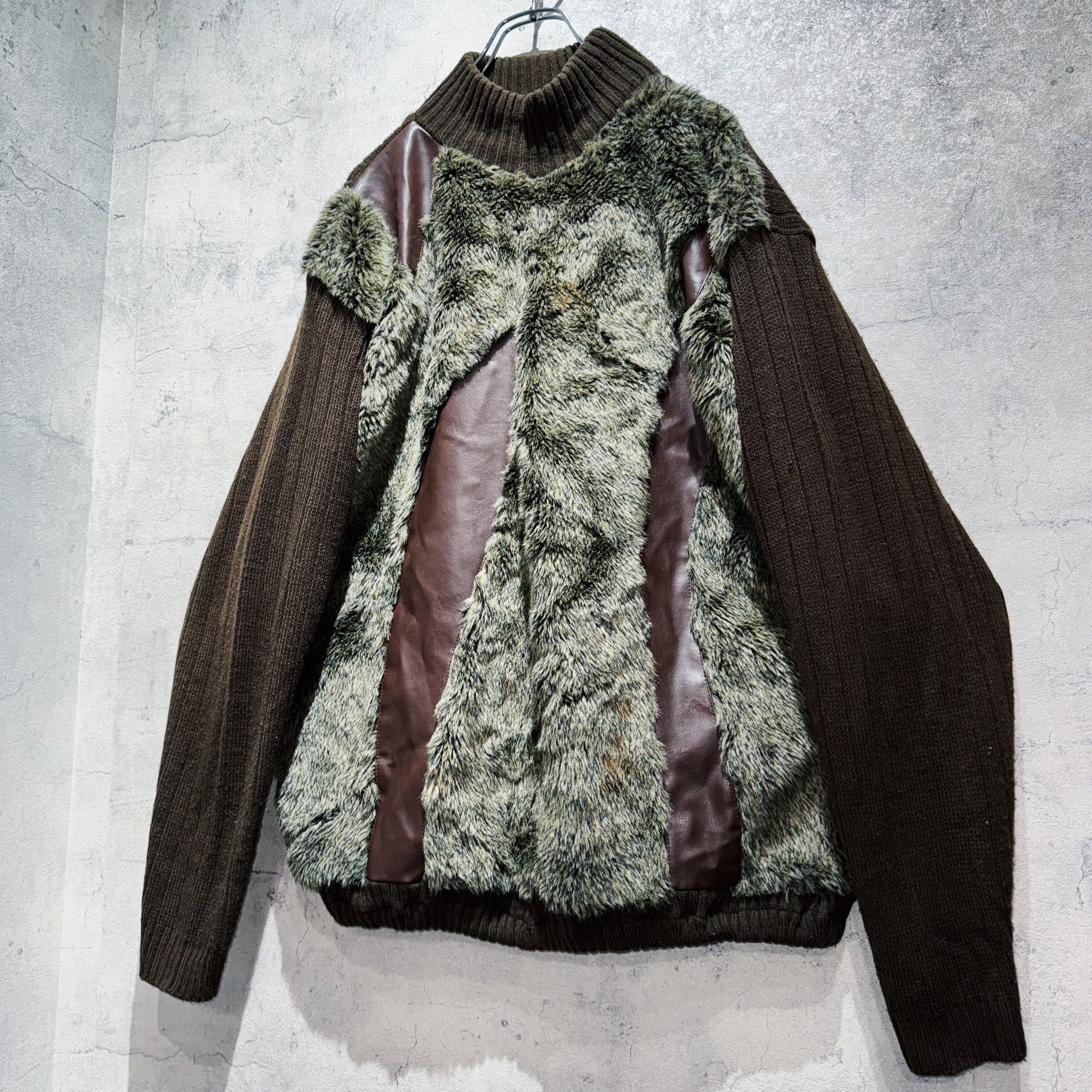ヴィンテージフェイクファー×レザースイッチングデザインモックネックニット