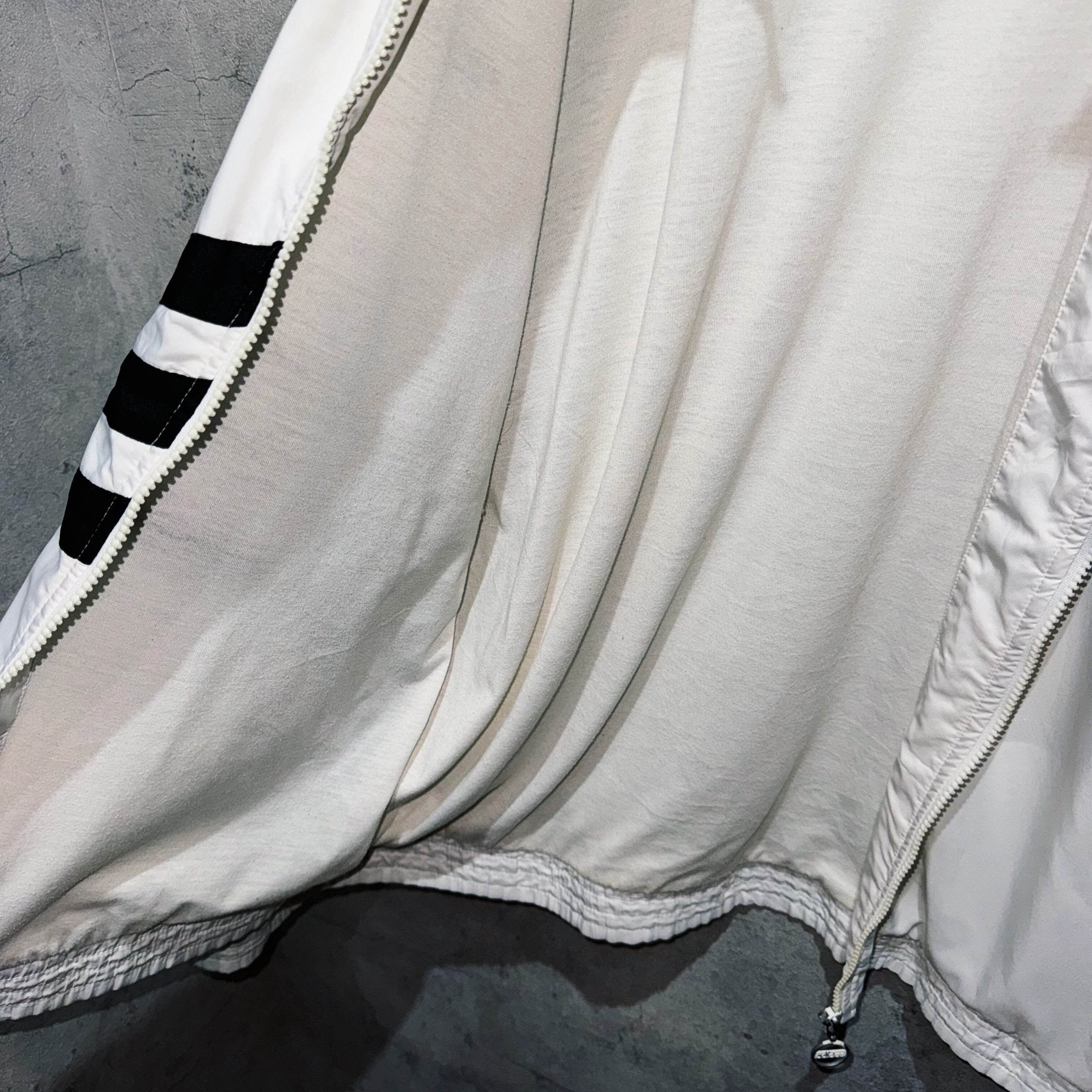 洗練され、古着でも中々お目にかかれないホワイトのボディにフロントには”ADIDAS”の代名詞でもある3ストライプスを斜めにあしらいアシンメトリーなデザインに。両袖には90年代といえばの山型のパフォーマンスロゴを色合いの良いブルーで施したナイロントラックジャケット。