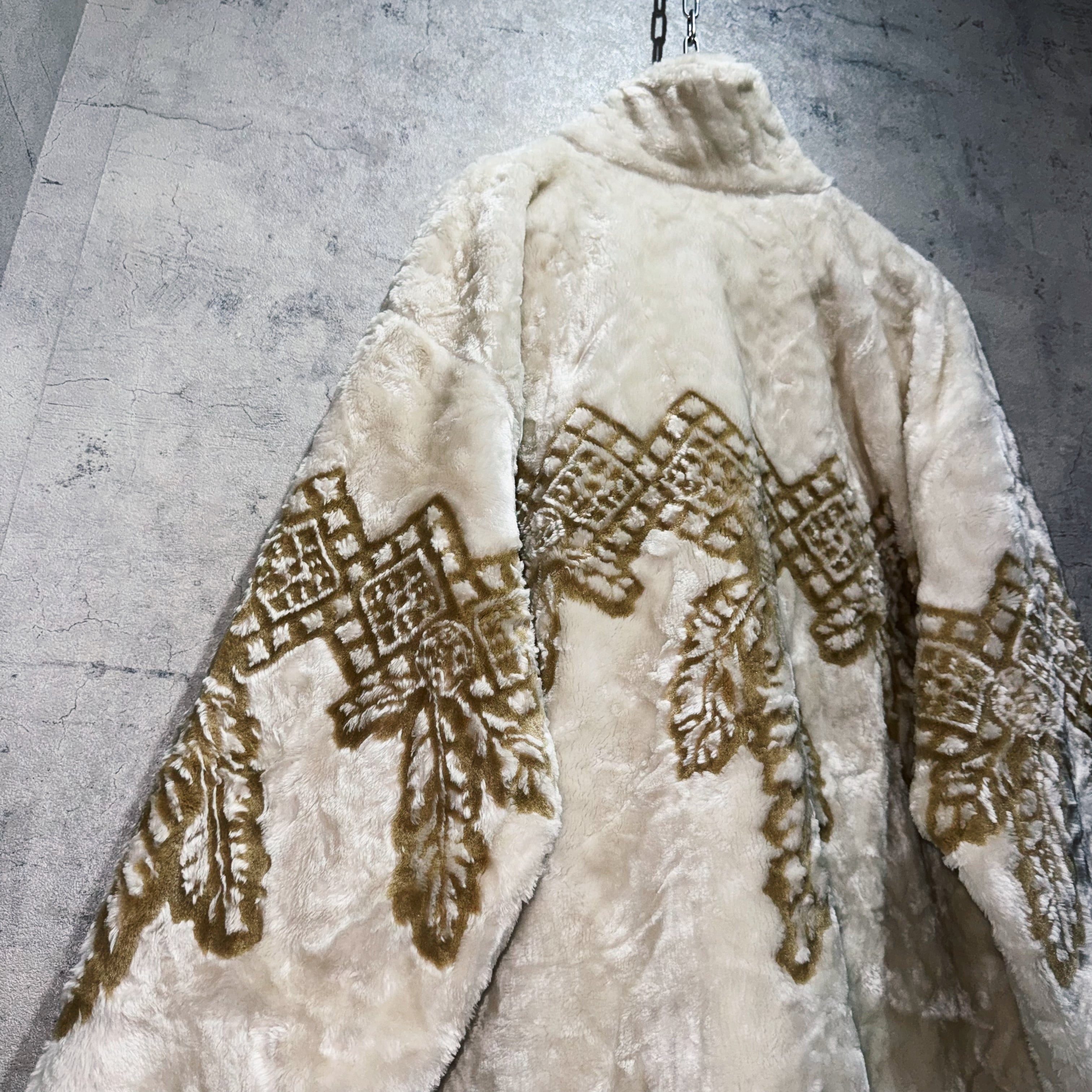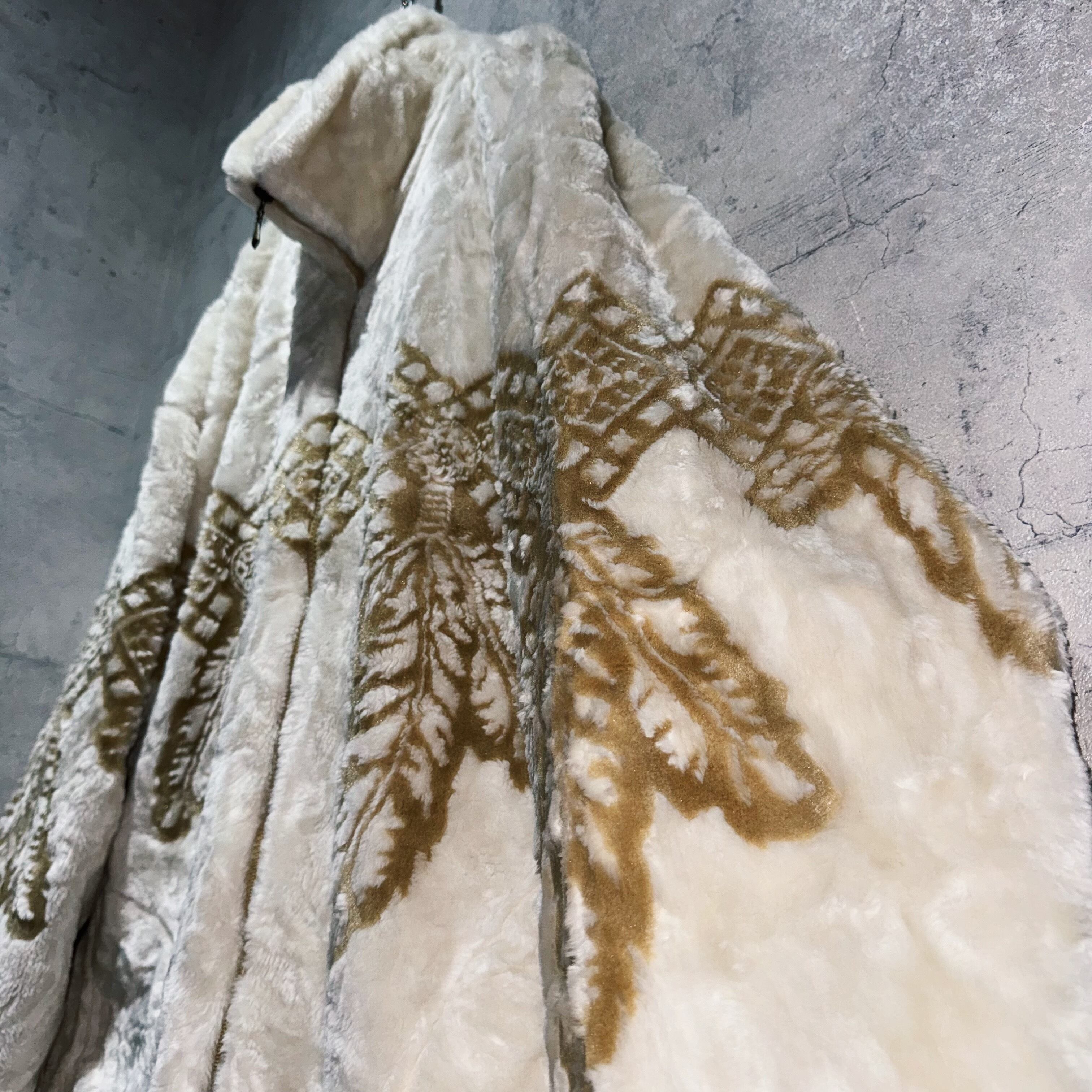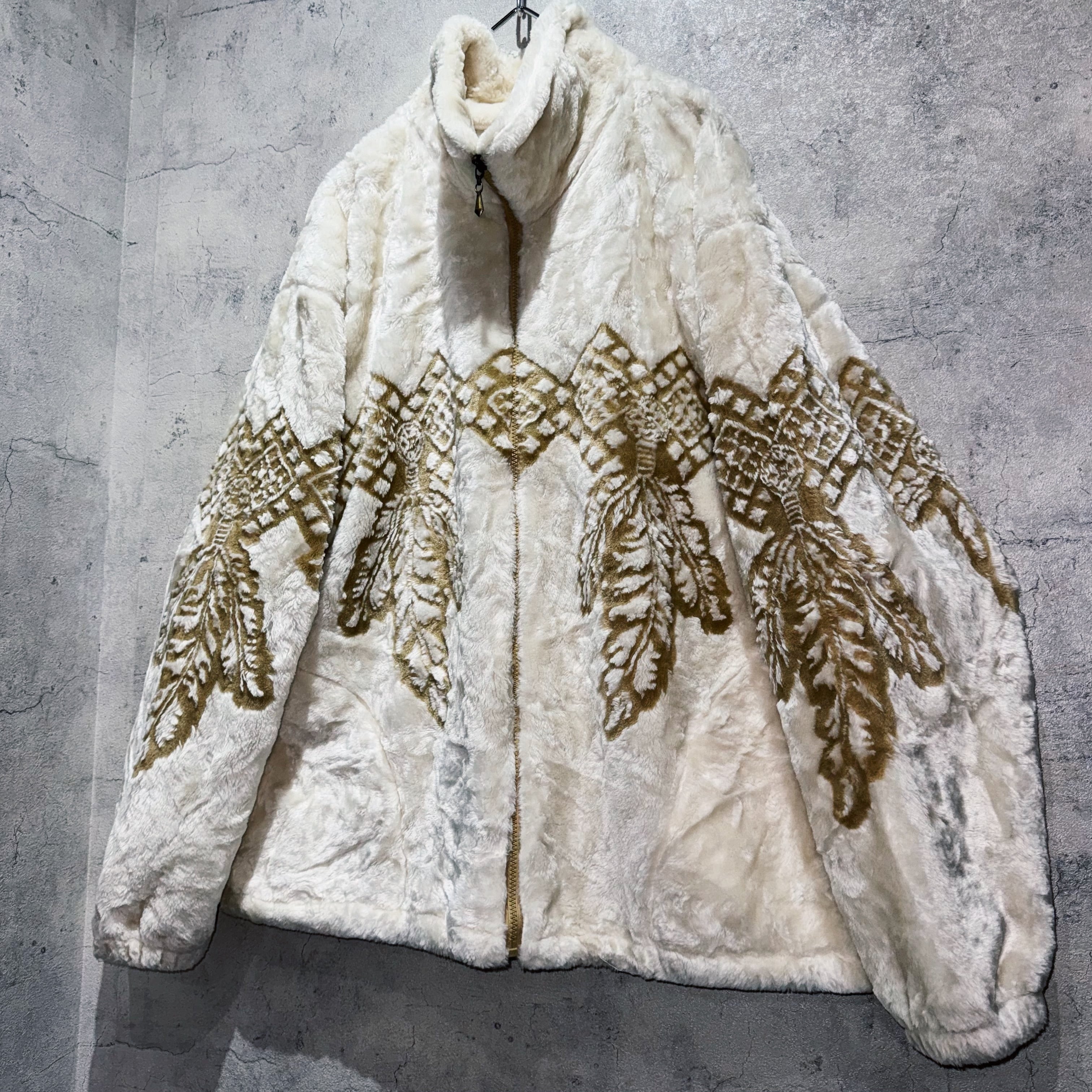 ふわっふわで一度触れればヤミツキになってしまう毛足のボディに、フロントから袖周り、背面にかけてエスニック柄を施したファーフリースジャケット。