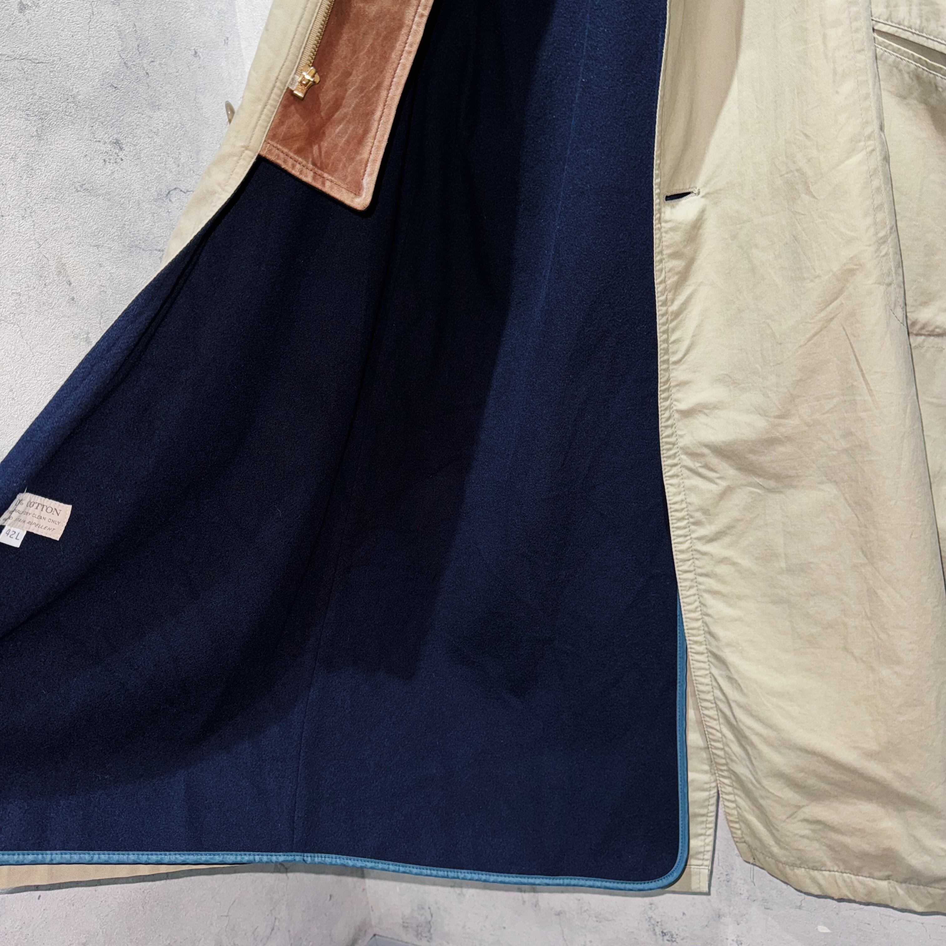そして今回は定番のトレンチとは異なるディテールで、ジップのエレメント周りがレザーにスイッチングしており、さらに上からボタンで留める二重構造。裏地にはネイビーのウールを採用することで高級感を生み出し、襟の開け閉めで表情が変わります。