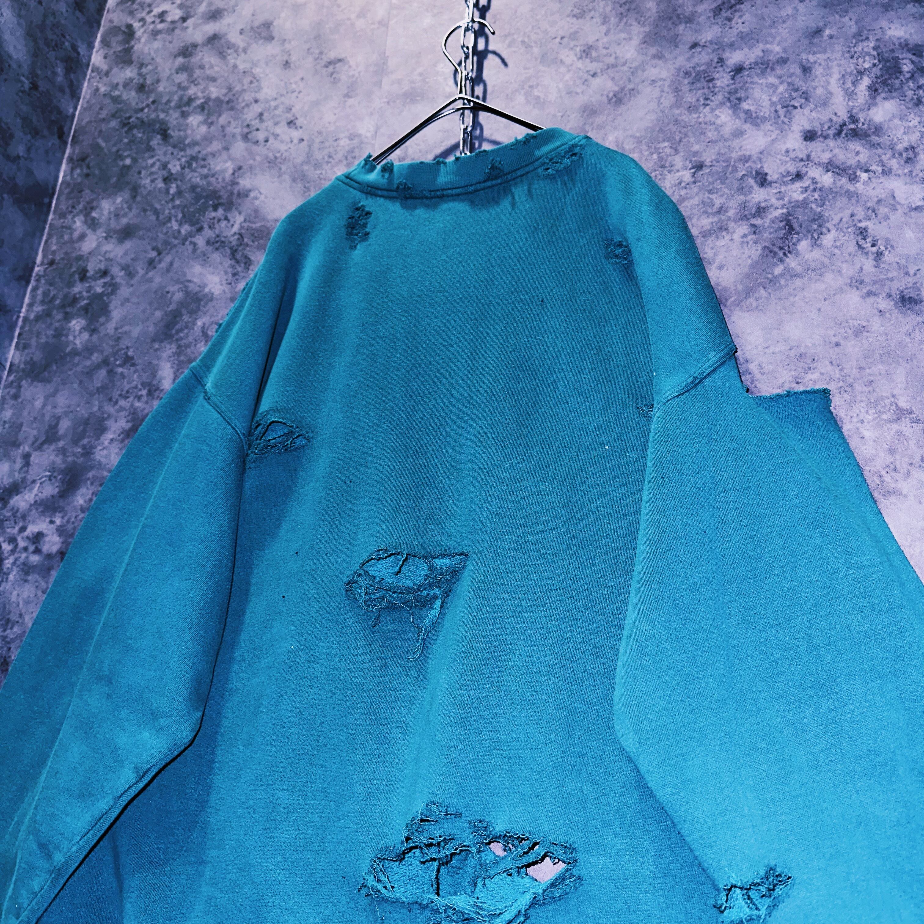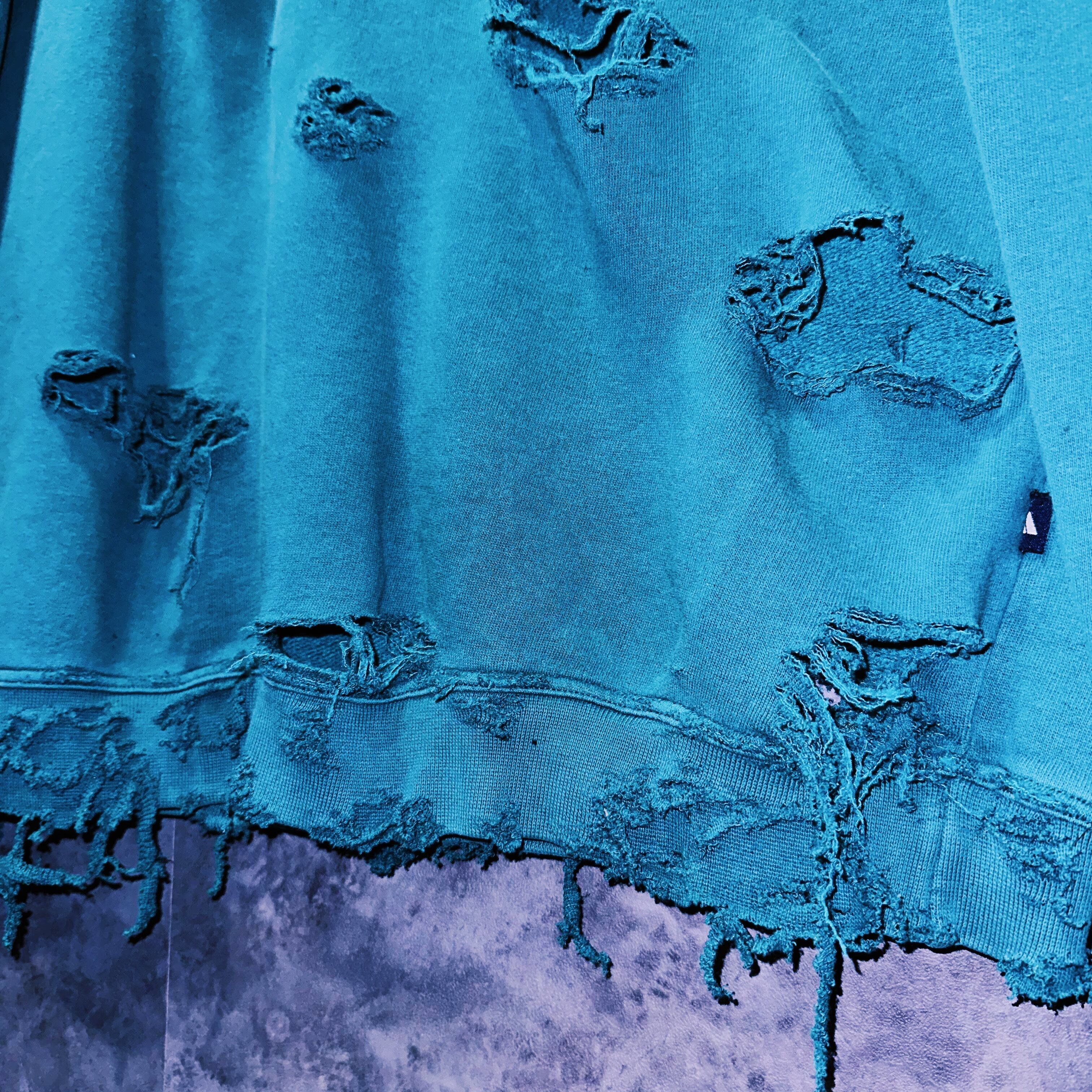 ボロデザインだけでなくスウェットそのもののデザインやサイジングも素晴らしく重厚感があり圧倒的な存在感を演出。生地が薄く通年愛用できるのも魅力的。