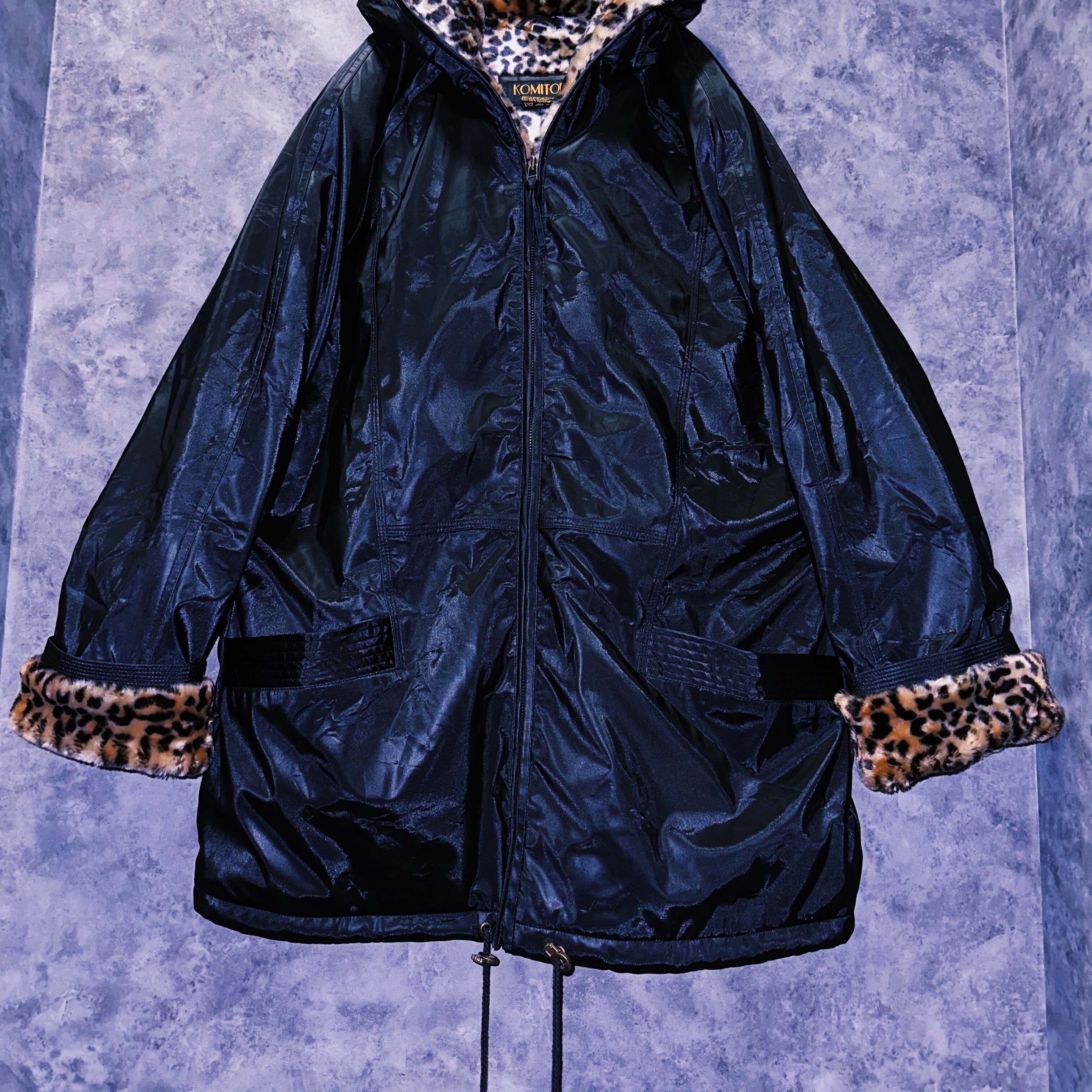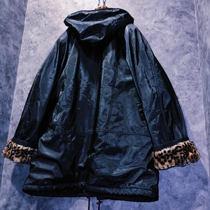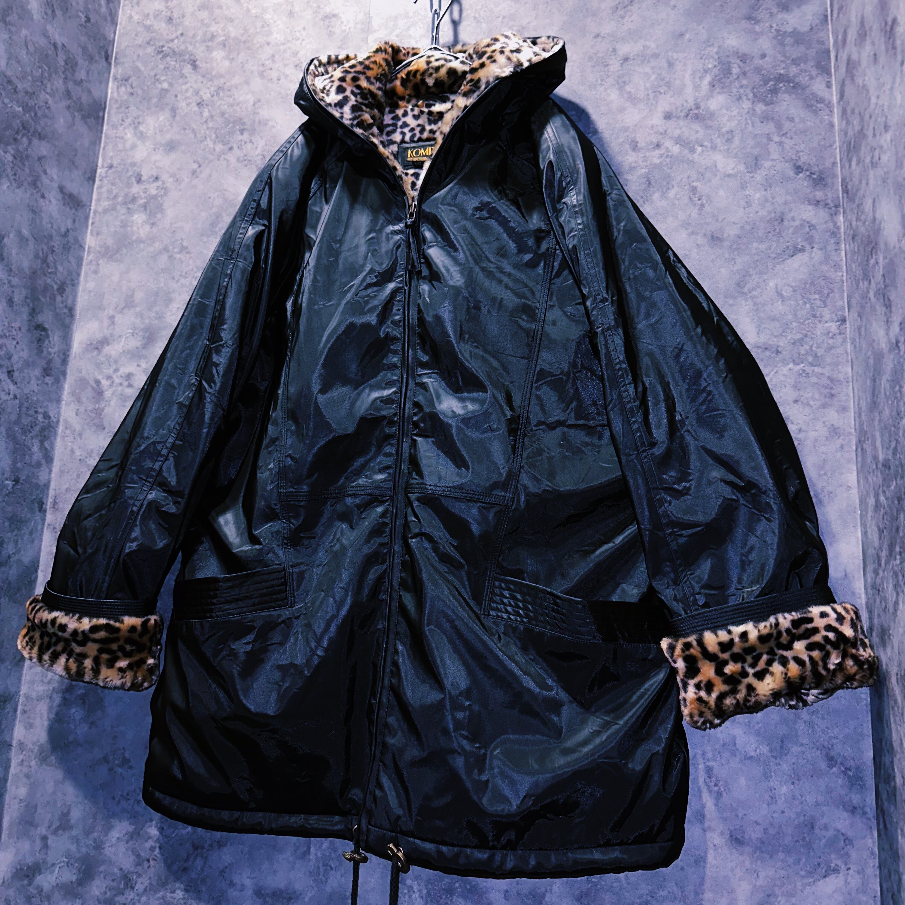ブラックカラーのナイロンのジップフーディーに裏地でレオパードのフェイクファーが施された冬の季節満載のアイテム。