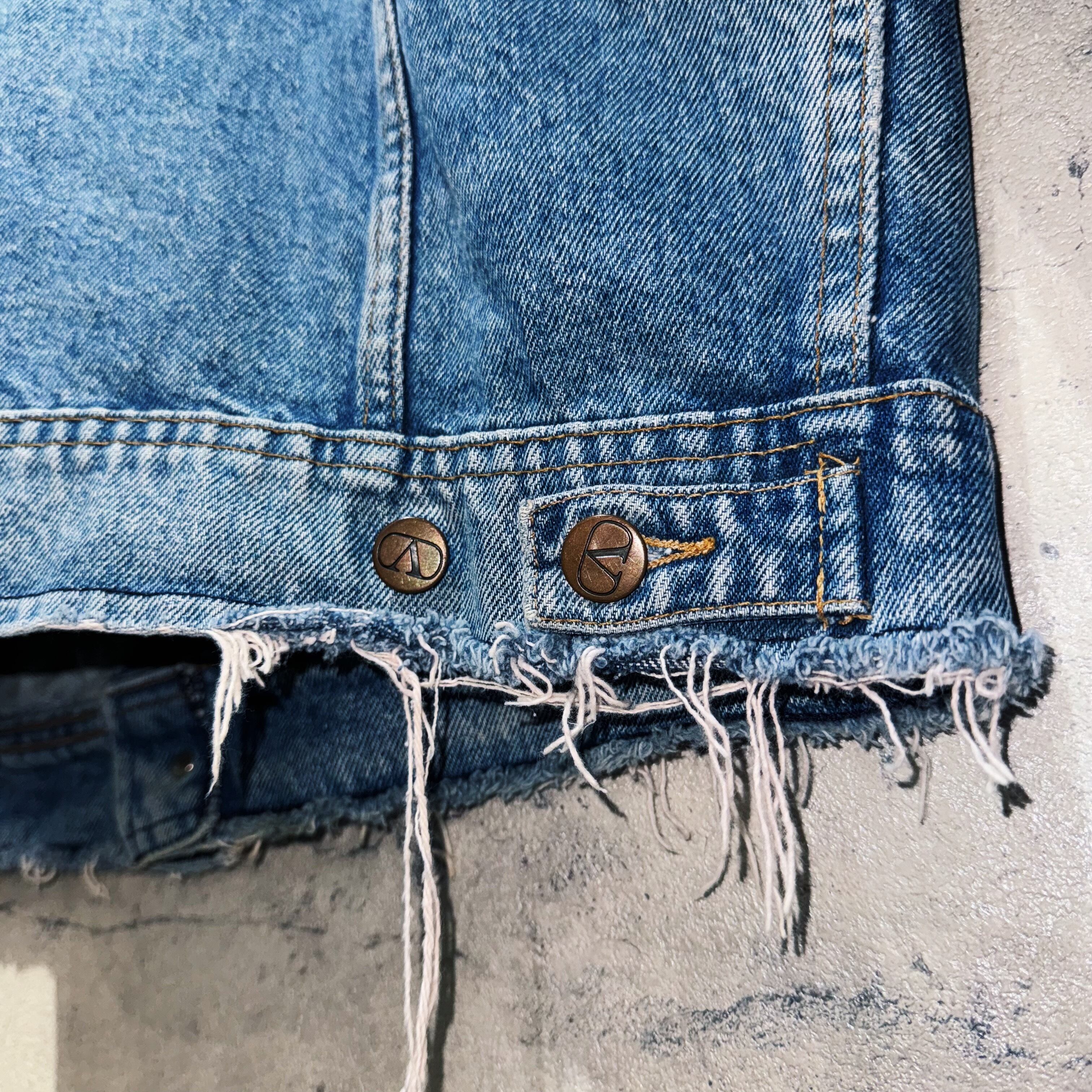 ボタン一つひとつがブランドの象徴的なロゴである「V」が刻まれたアンティーク調のボタンで高級感のある仕上がりに。裾にはカットオフのようなダメージが加えられており、グランジさとエレガンスが融合した一枚に。