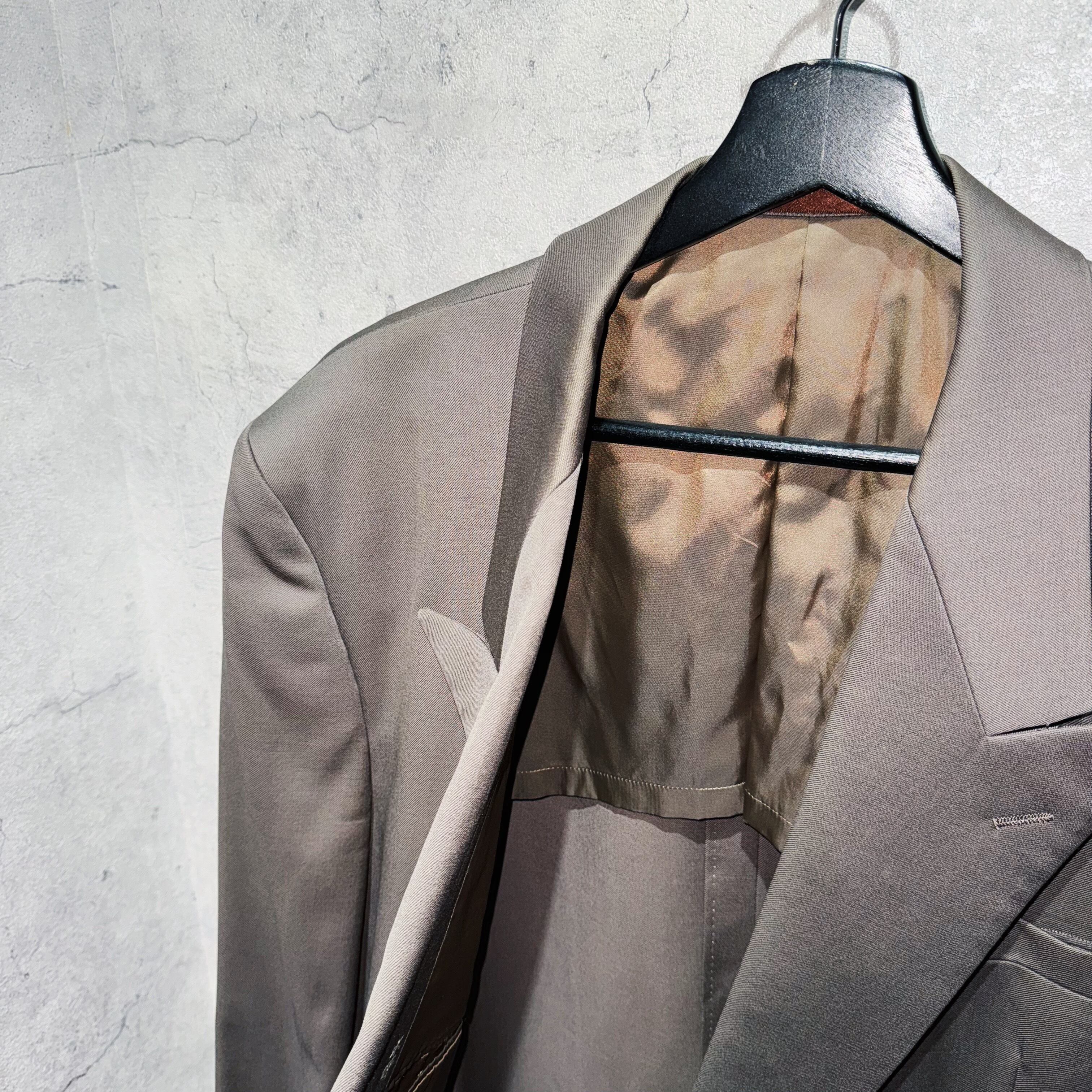 写真からでも伝わってくる美しい光沢に身を包んだシャンパンゴールドカラーのセットアップ。ダブルブレストとのジャケット、程よくきいたテーパードパンツに加え、存在感がありながらも落ち着いた色味は単体でも活躍してくれるかと。