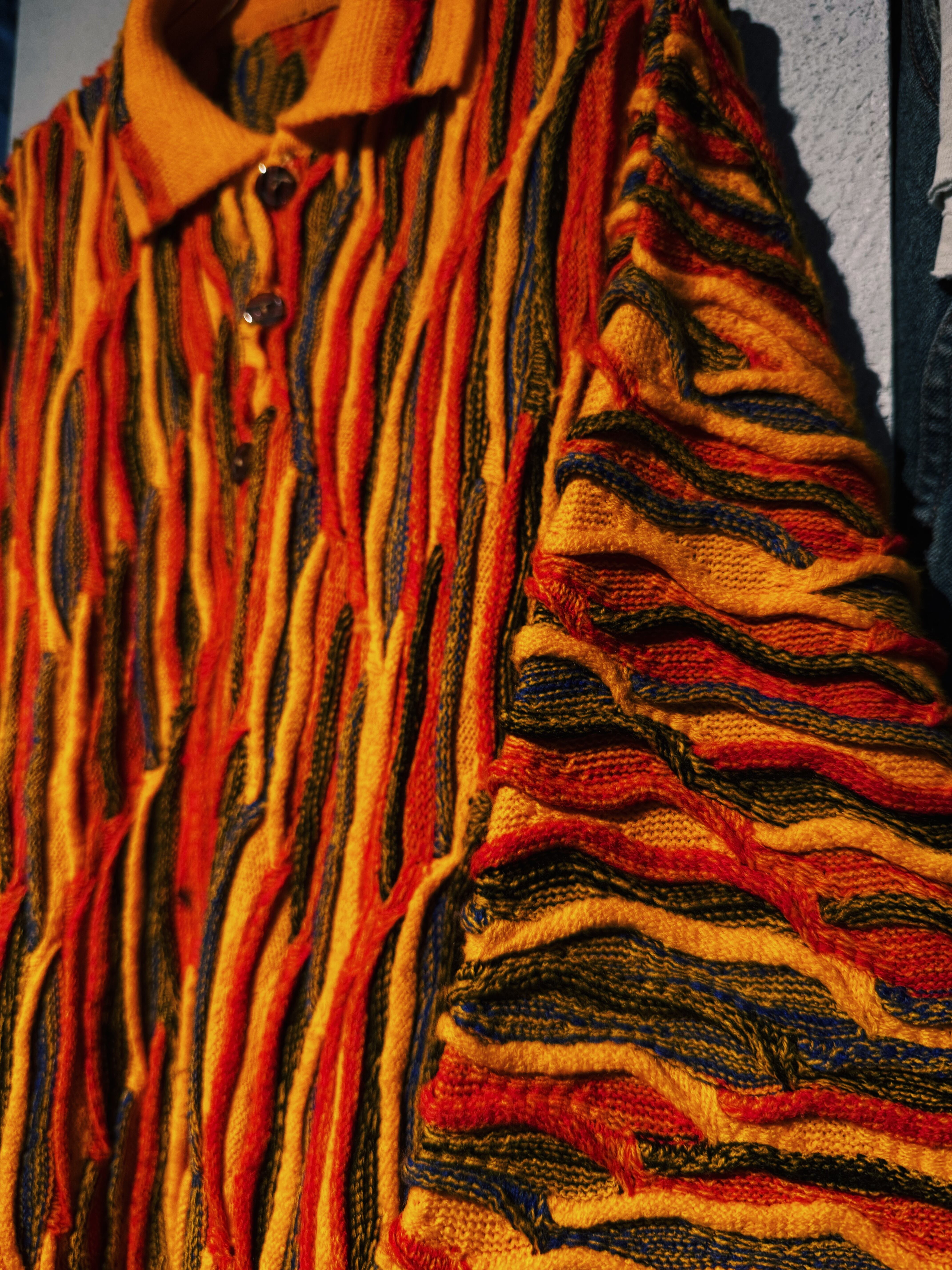 高級感溢れるカラーリングで複雑な織り柄が魅力的な3Dニット。渋すぎず派手すぎない色合いは、様々なスタイリングに馴染みやすく着方次第で綺麗目やストリートにもなる万能さがあるユーロヴィンテージ。