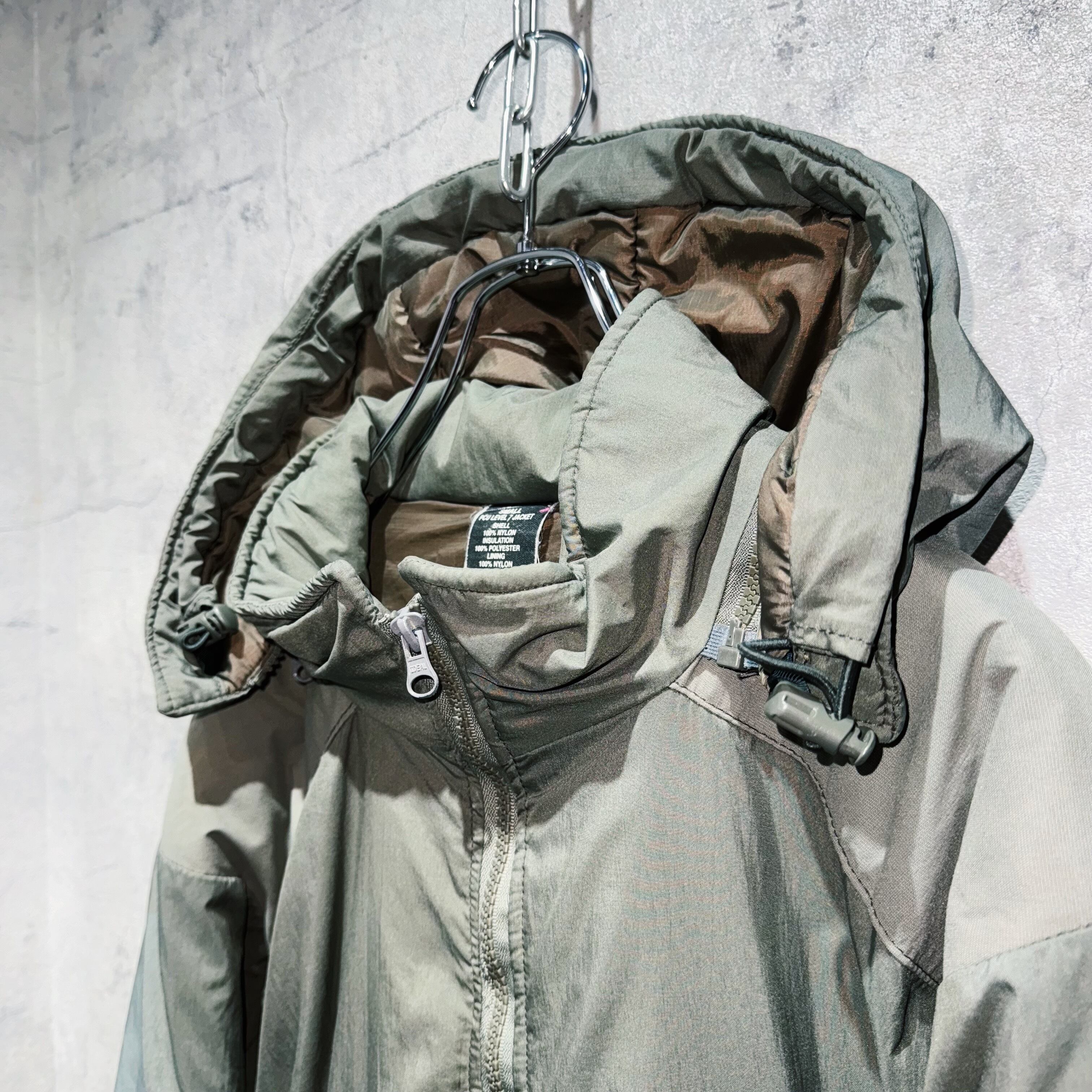 米軍が極寒地用に開発したトップスのうちの寒さを7段階のレベルに細分化しその中でも最強レベルのアイテムがレベル7であり、”ECWCS”同様の極寒冷地対応の最上被服システムを兼ね備えています。”ECWCS”はフードが収納型ですが”PCU”は取り外しが可能で、欠損しがちですが今回は完品でご用意。