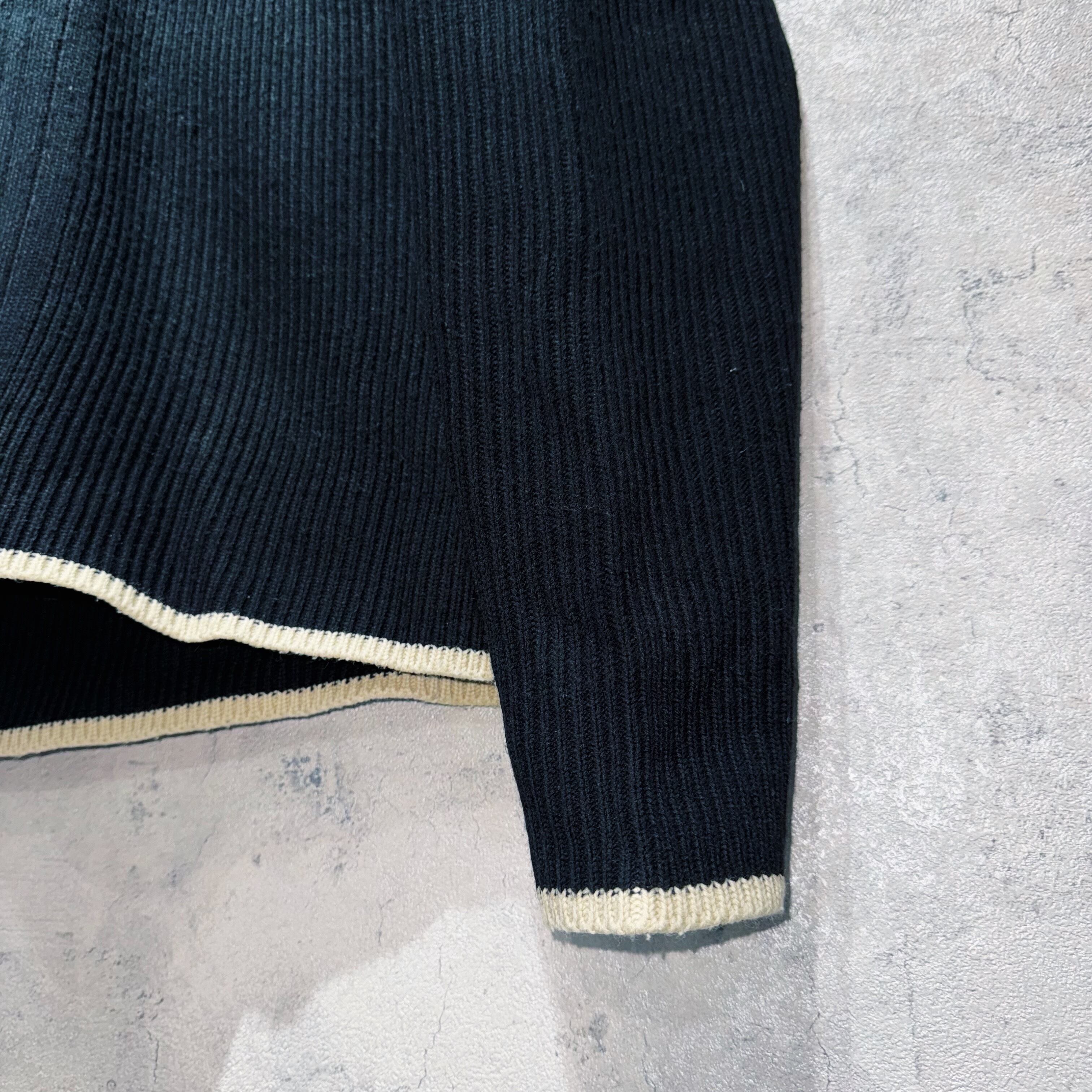 胸元にシグネチャーでもある”D”のロゴと共にブランド名が刺繍されたアイコニックなプルオーバーニット。ボディはブラックを基調とし、首元や裾がベージュに切り替わったクラシカルなデザイン。
