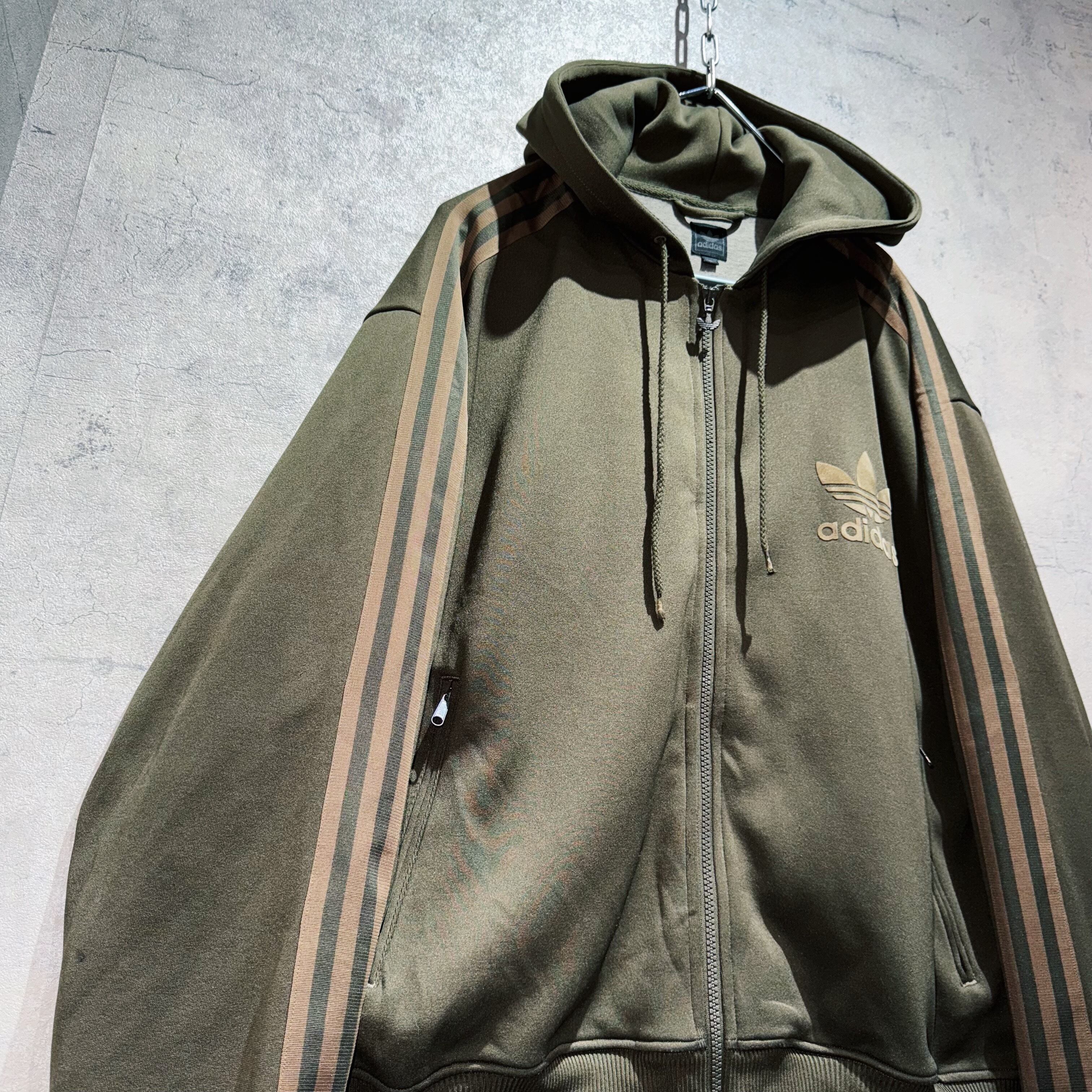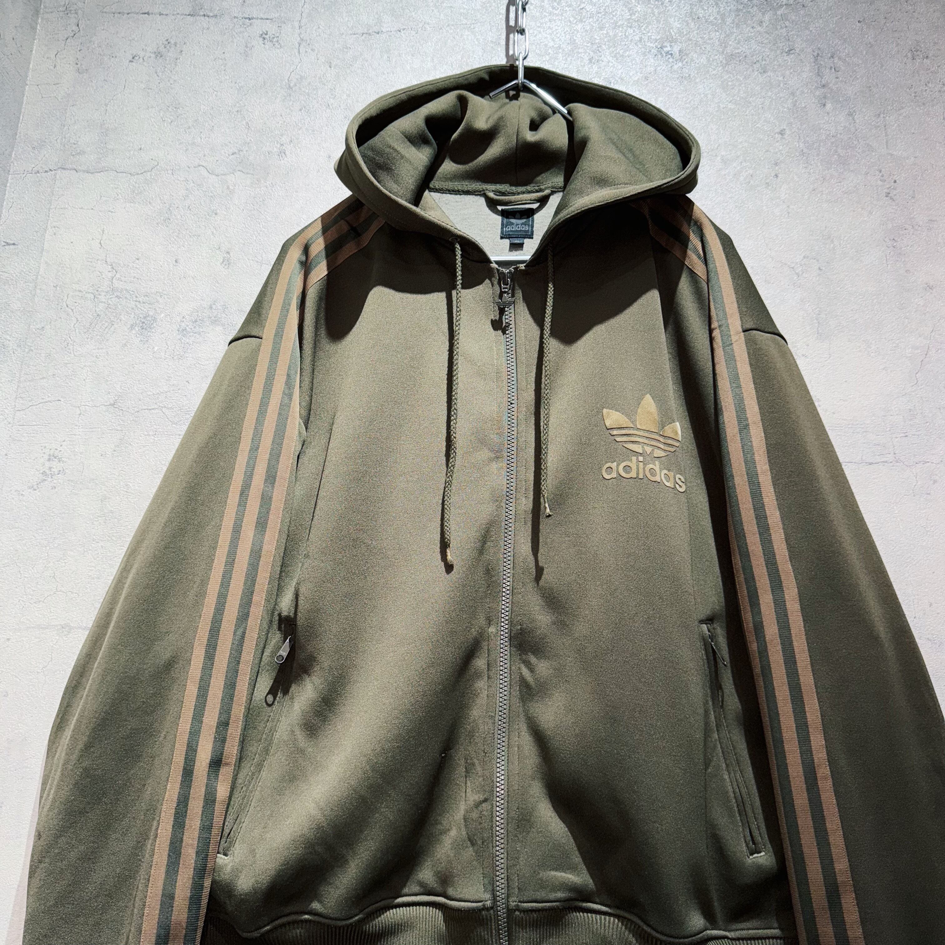 "アディダスオリジナルス"オリーブグリーンカラートレフォイルデザインフーディートラックジャケット