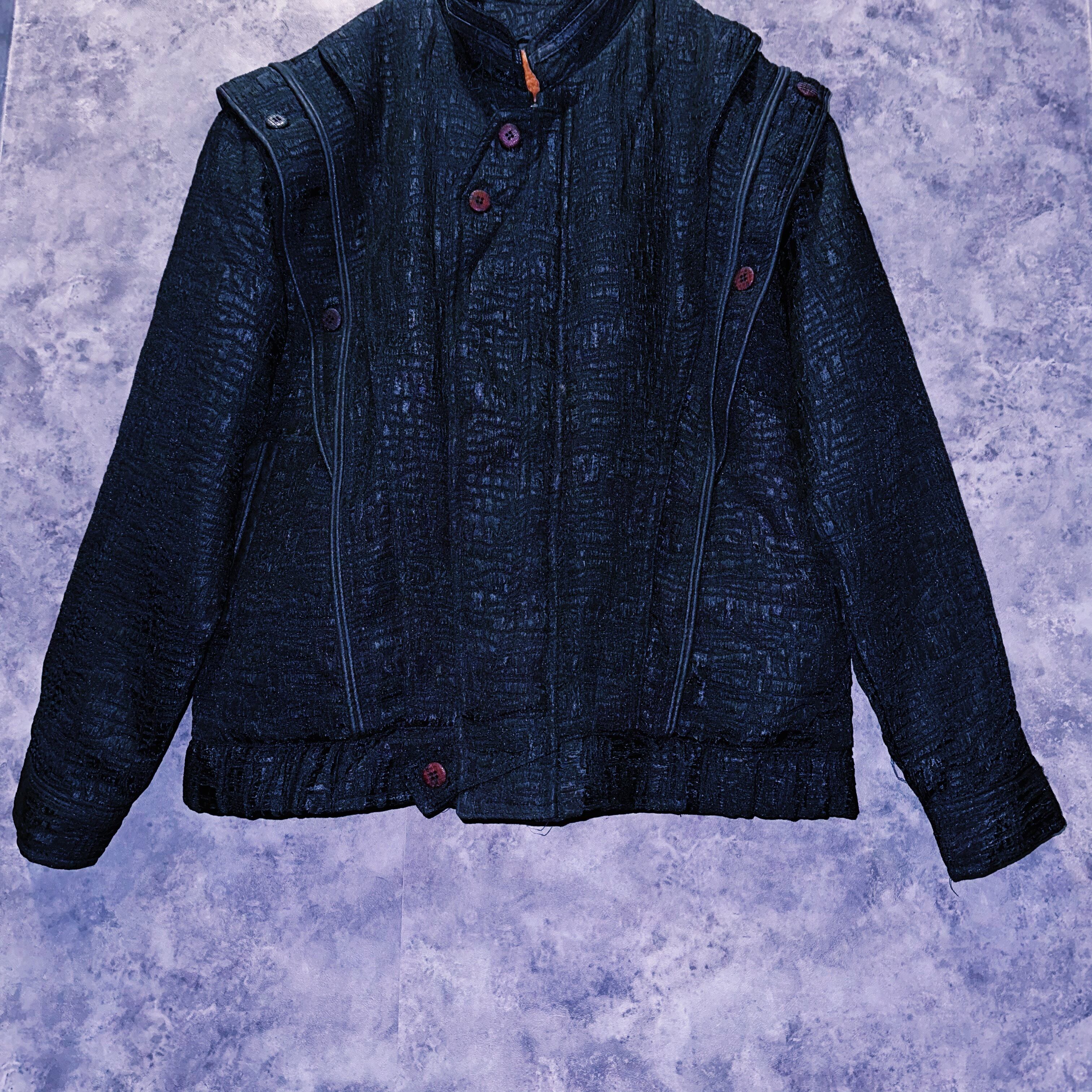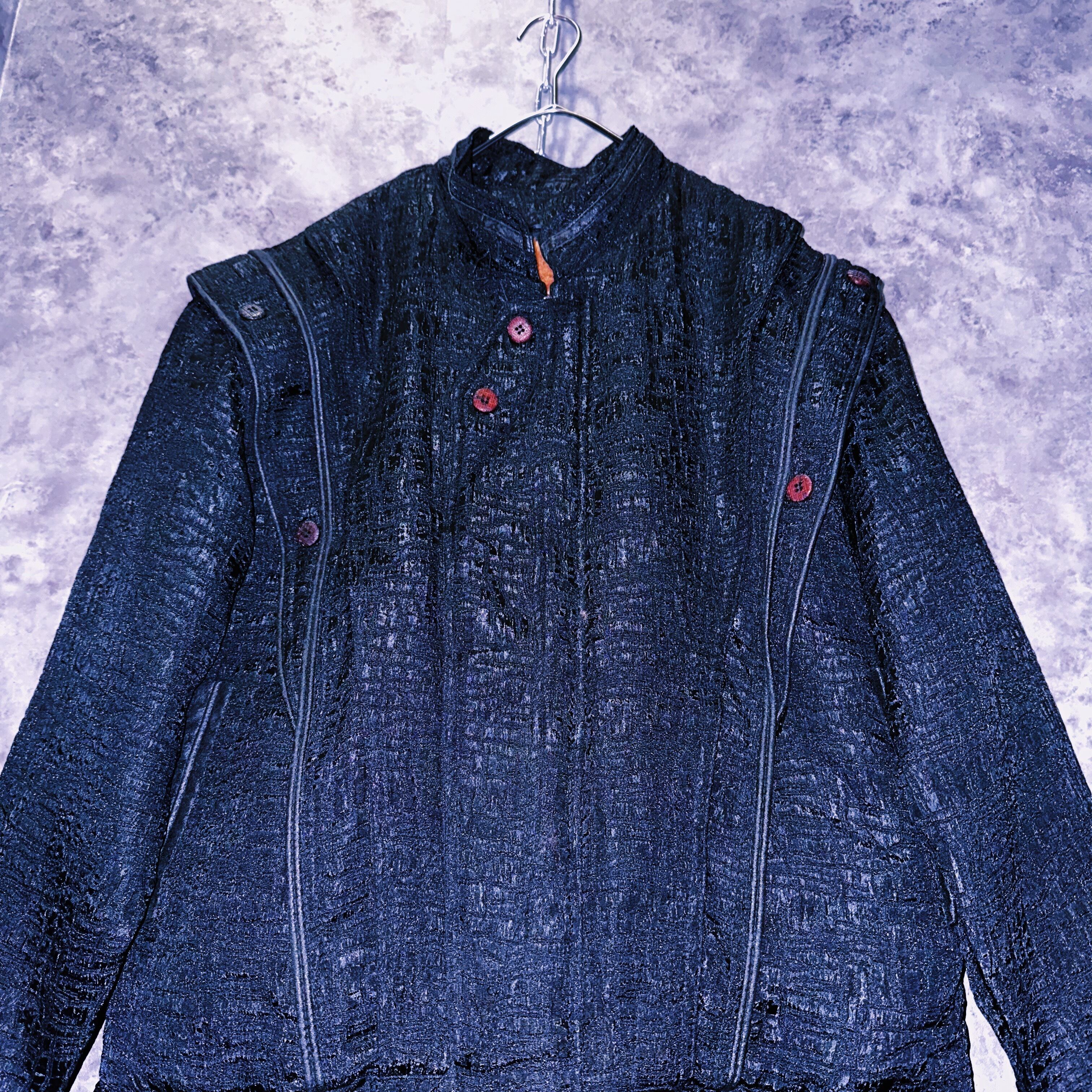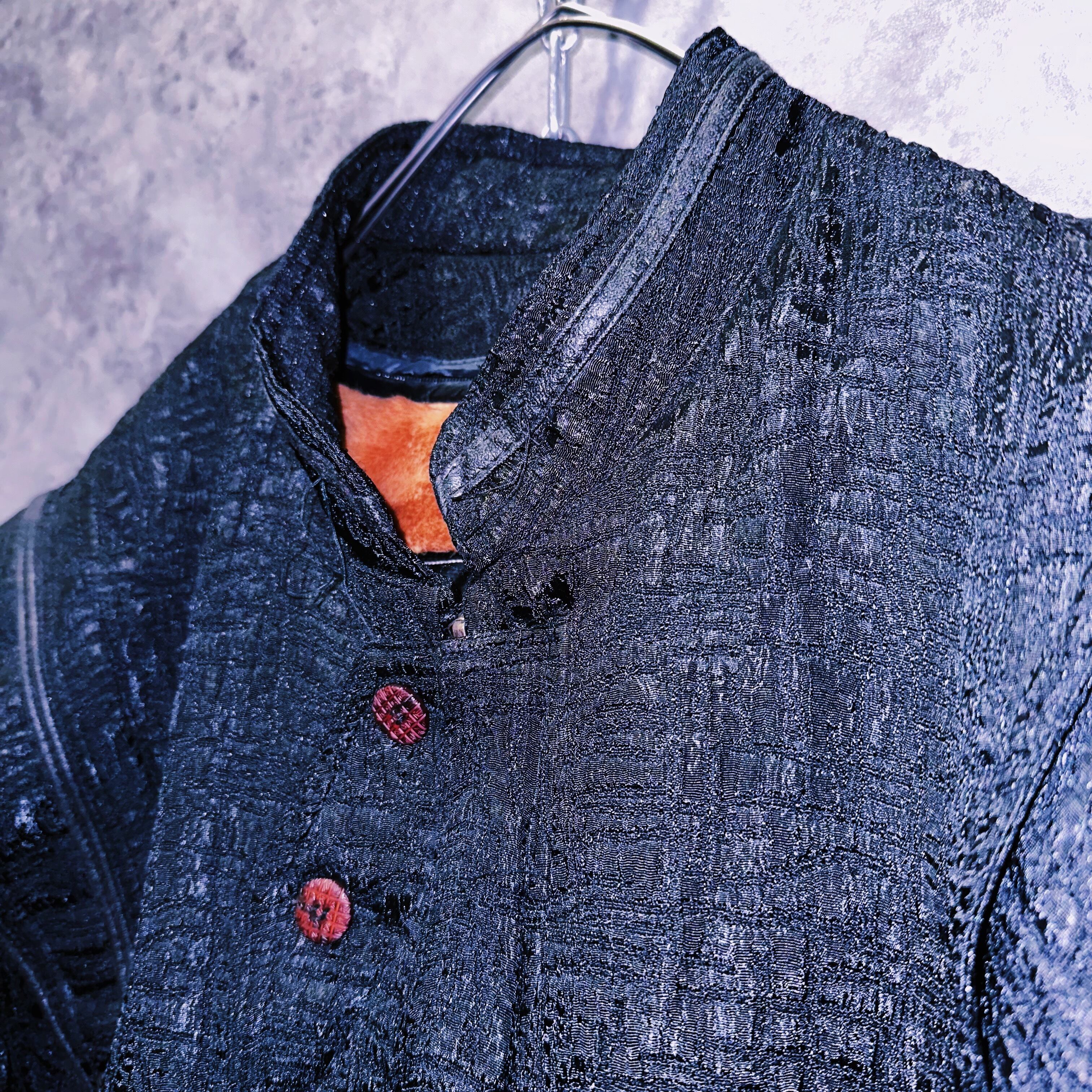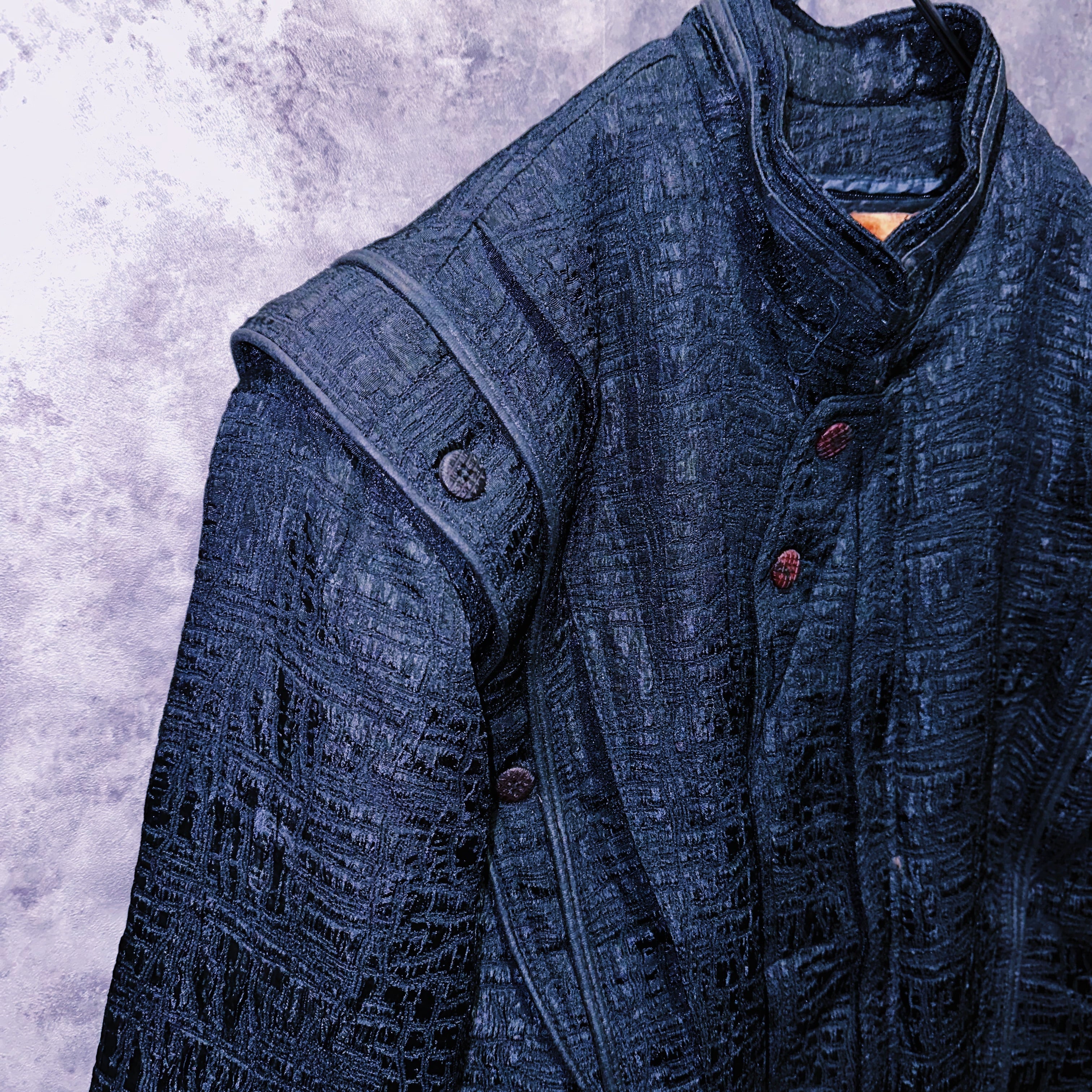 写真からでもヒシヒシと伝わってくるような特有で独特な光沢を身に纏い、凹凸のシボ感、少し荒々しさを感じるブロックパターン滑らかで柔らかい素材感が存在感満載の1着。