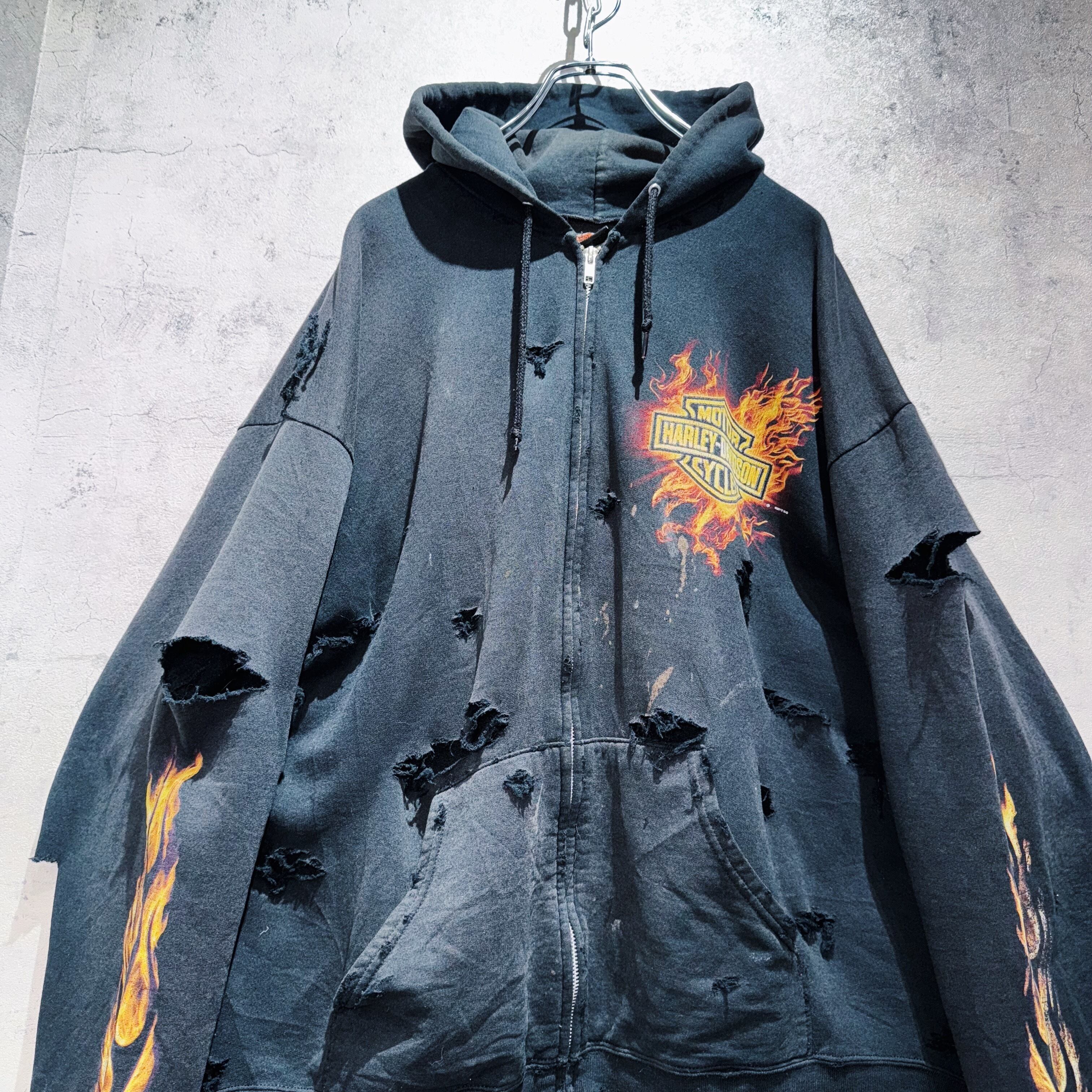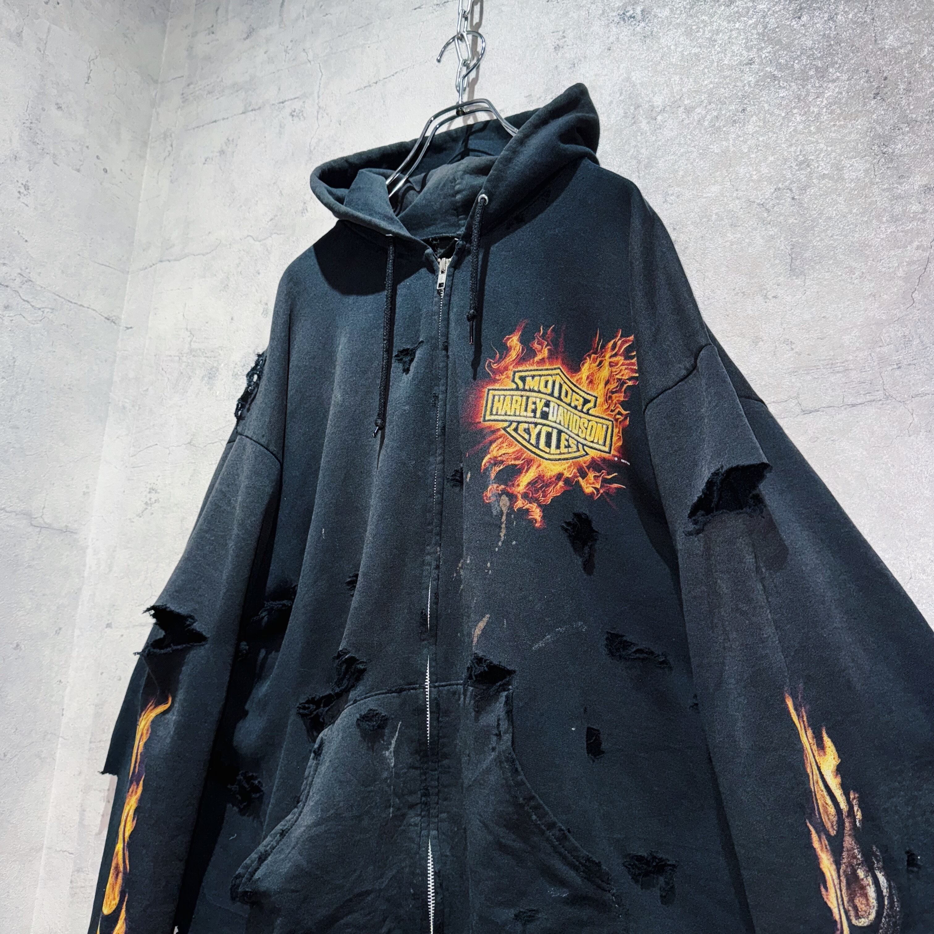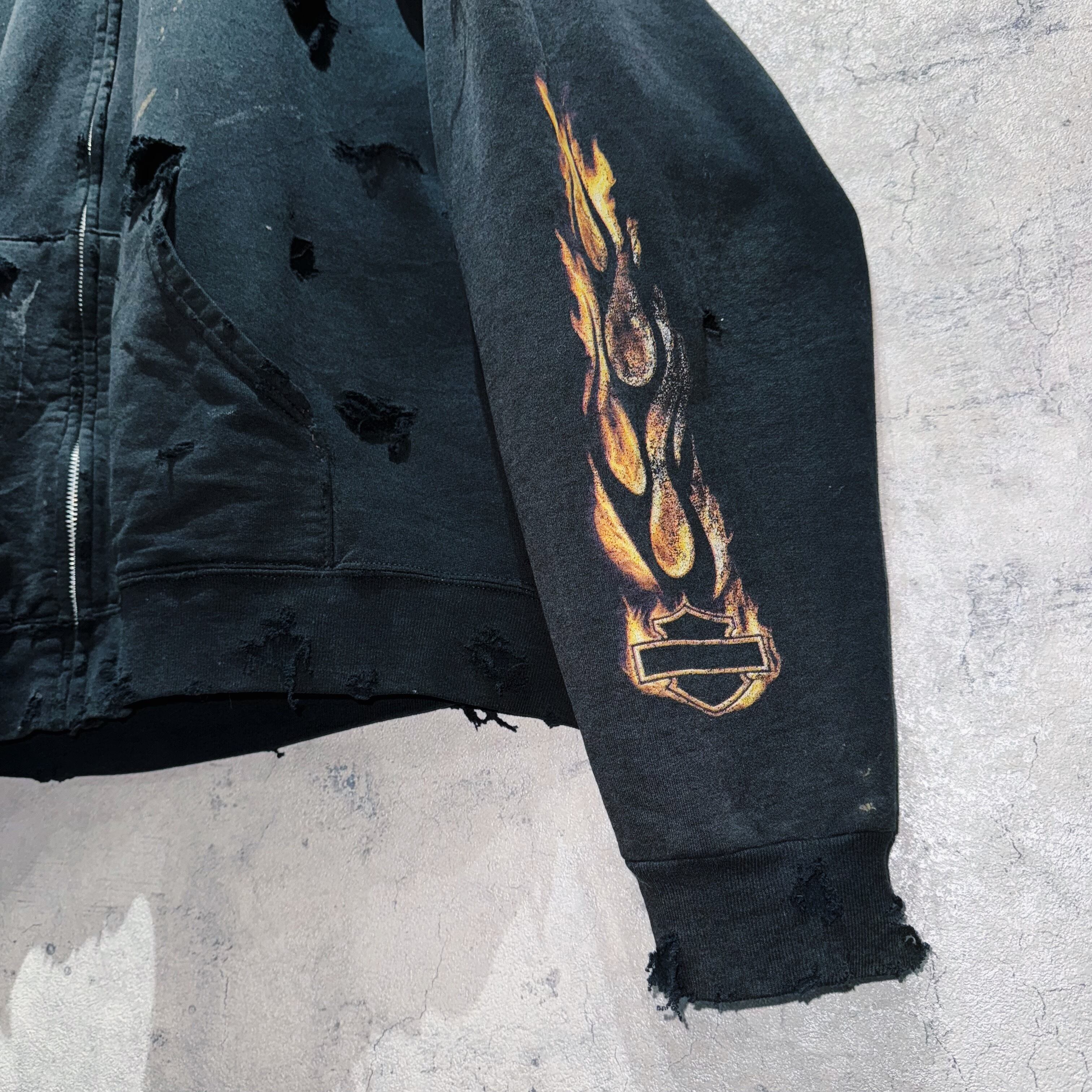 ”ハーレーダビッドソン”ファイヤーパターンデザインボロカスタムジップアップフーディー