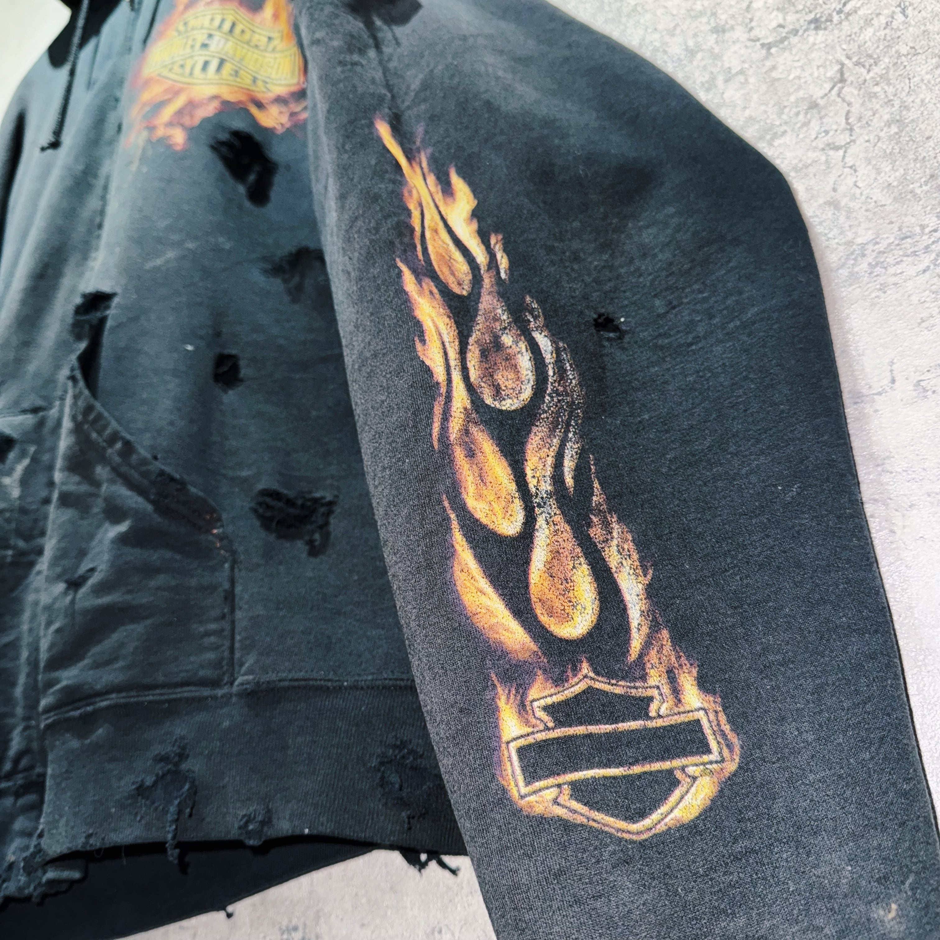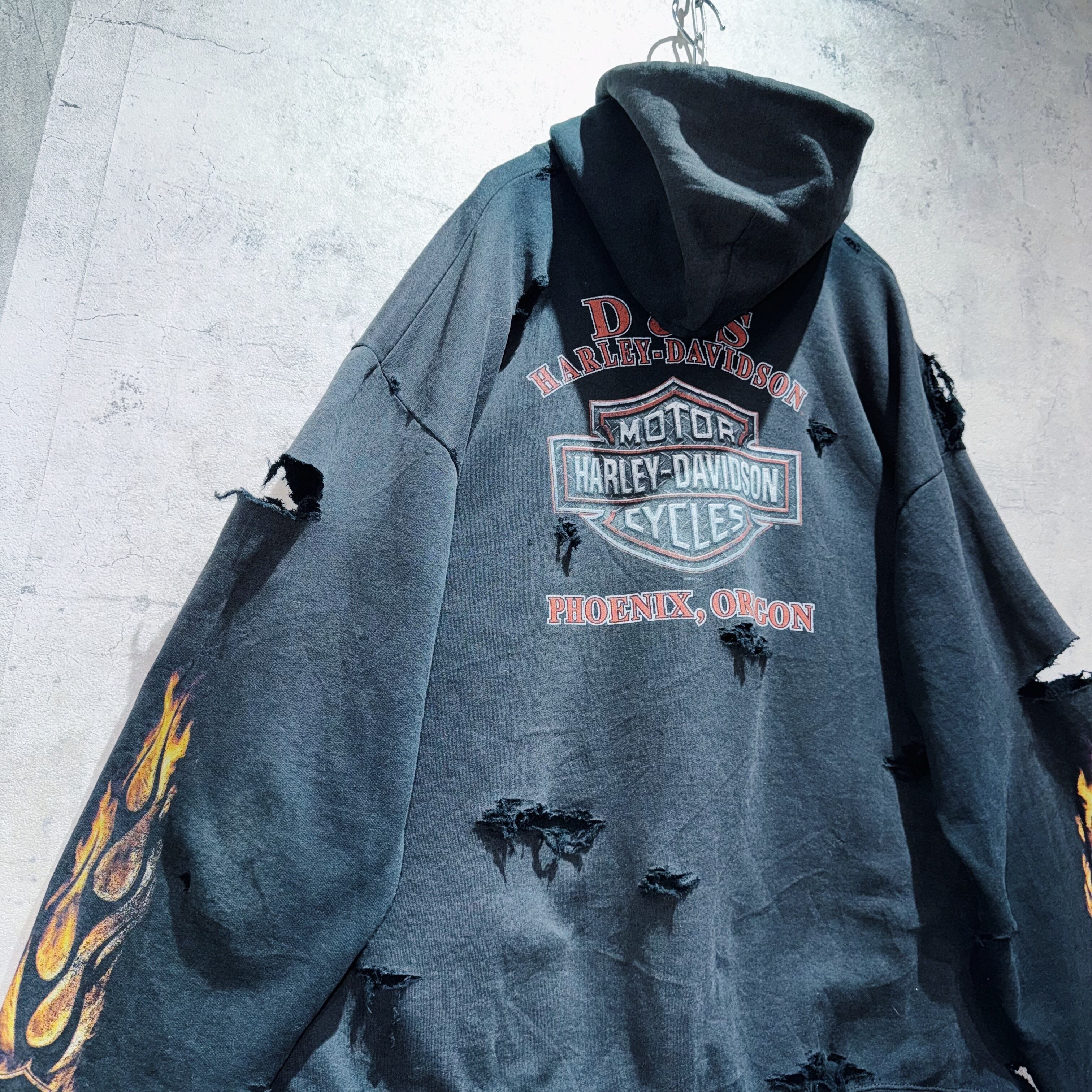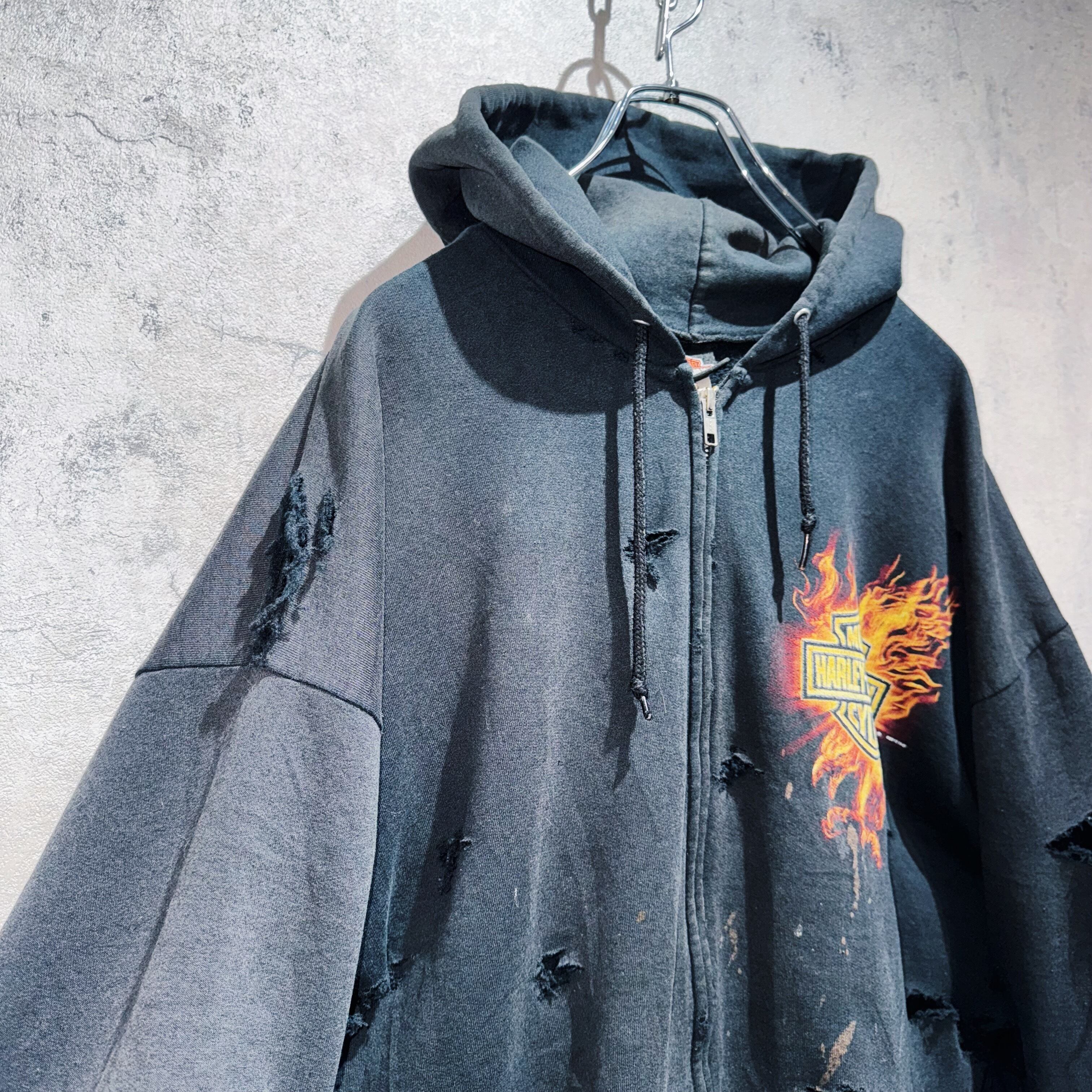”ハーレーダビッドソン”ファイヤーパターンデザインボロカスタムジップアップフーディー