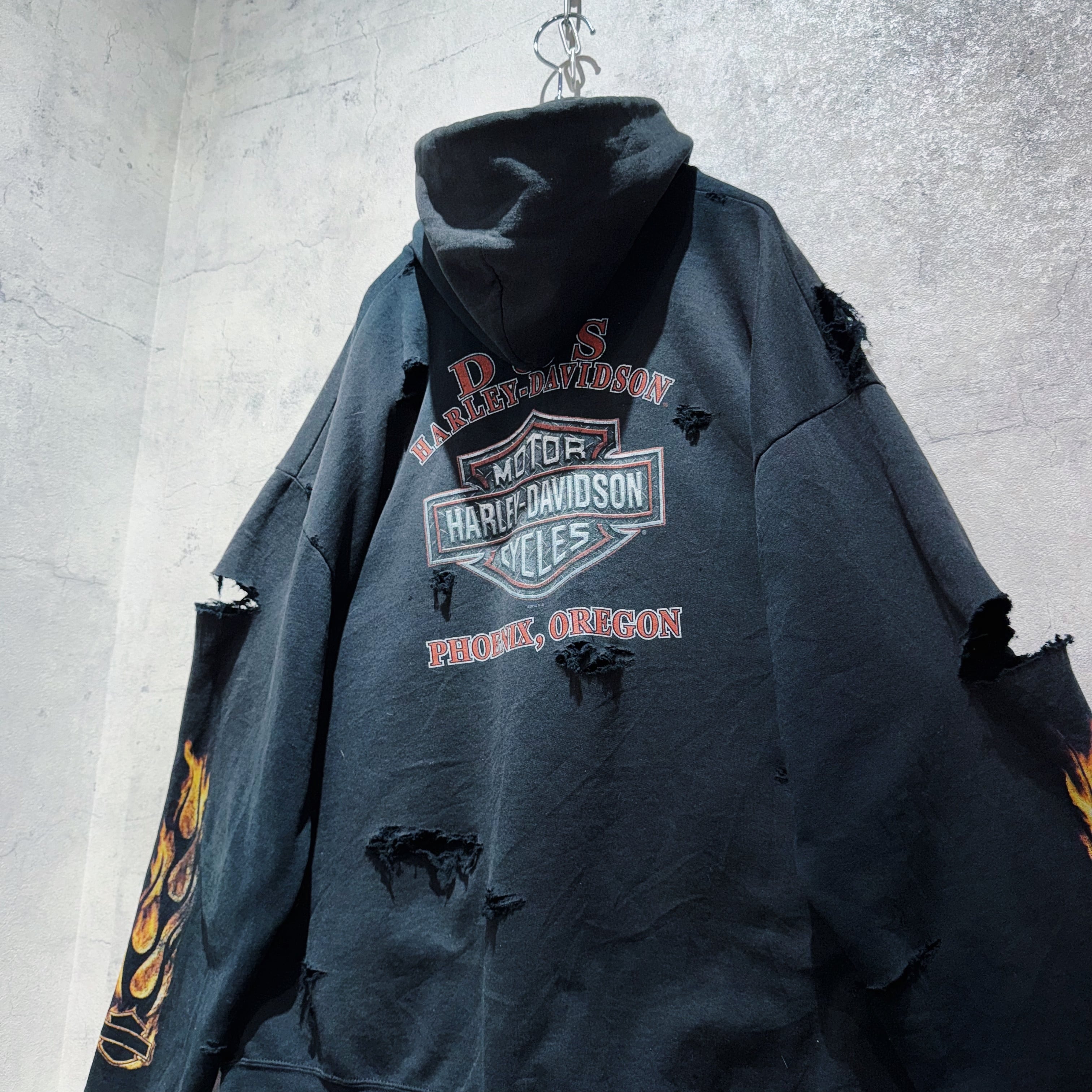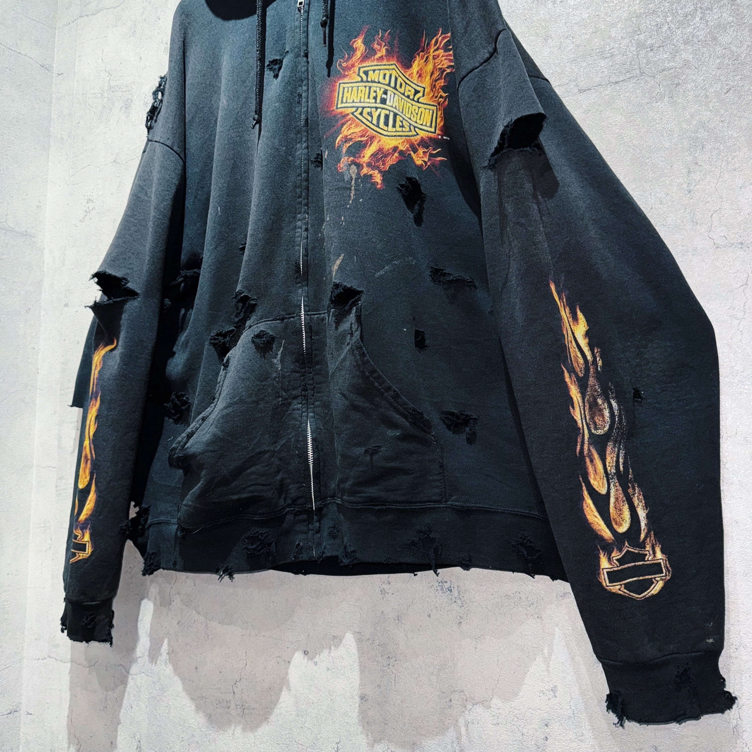 世界恐慌を乗りきった世界的バイクメーカーのHarley-Davidsonのジップパーカーを贅沢にボロカスタム。重厚感のあるブラックのボディに、ハーレーのシグネチャーでもあるファイヤーパターンを袖元にもあしらい、ボディのデザインも一級品。