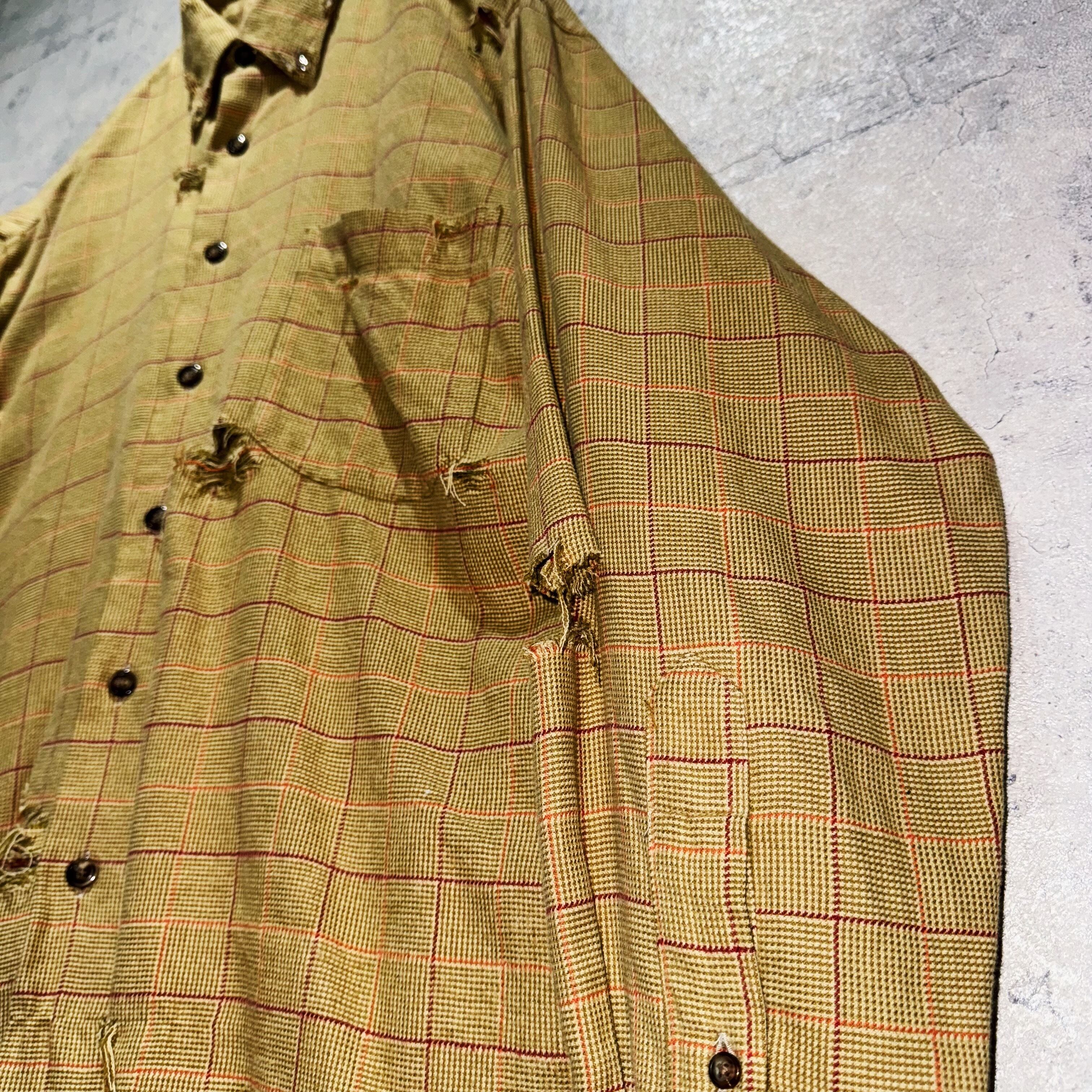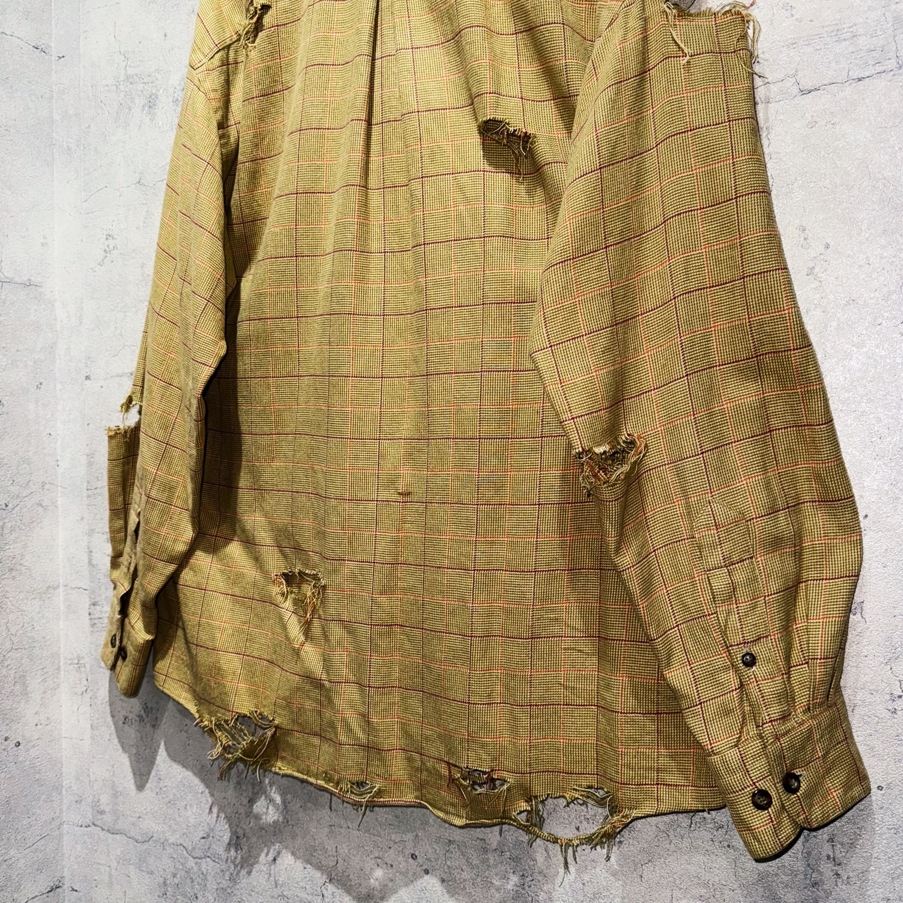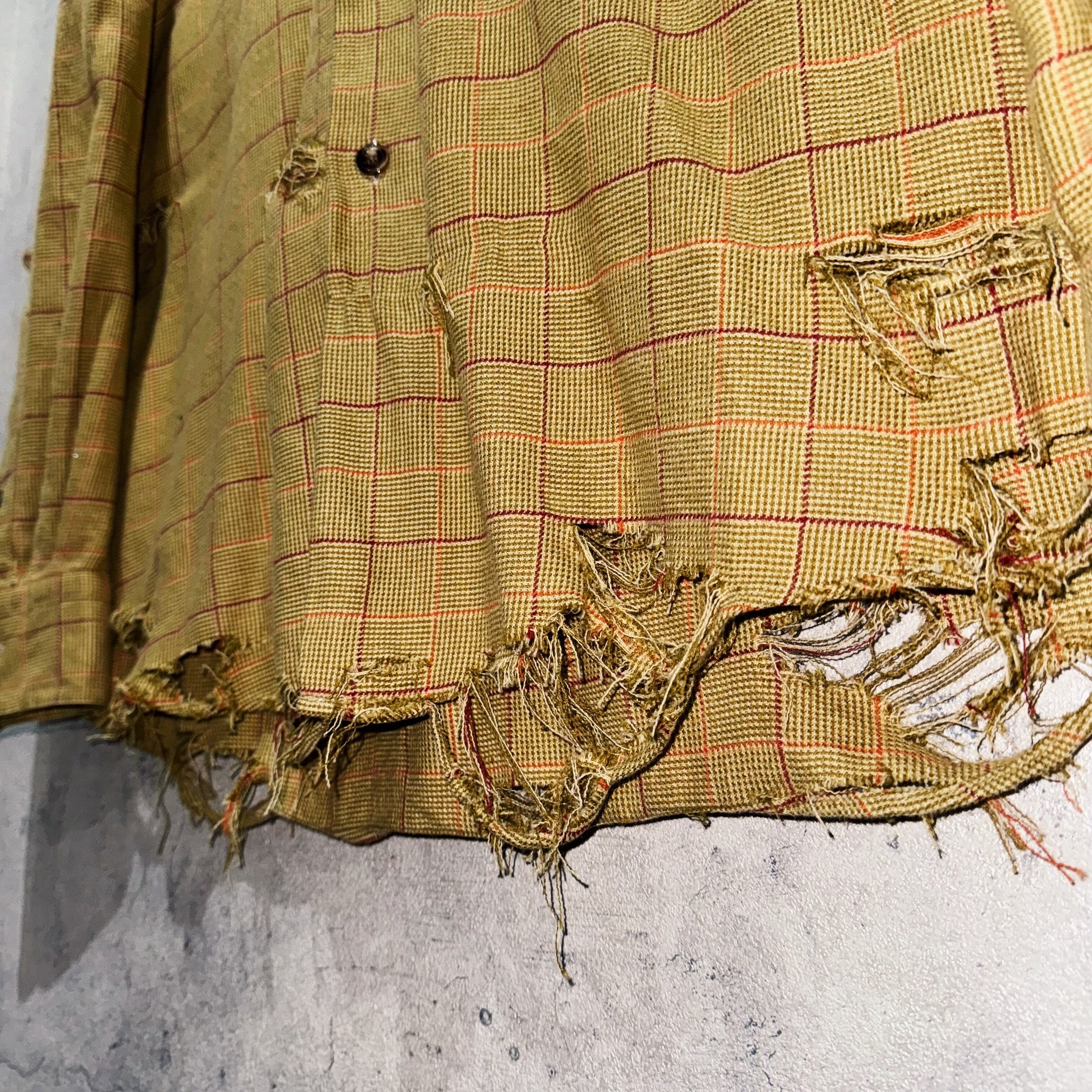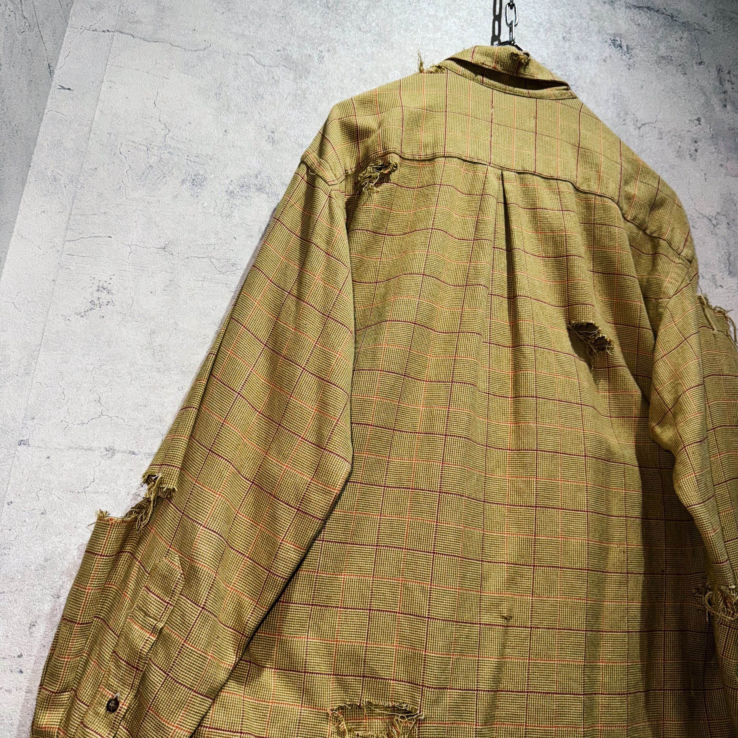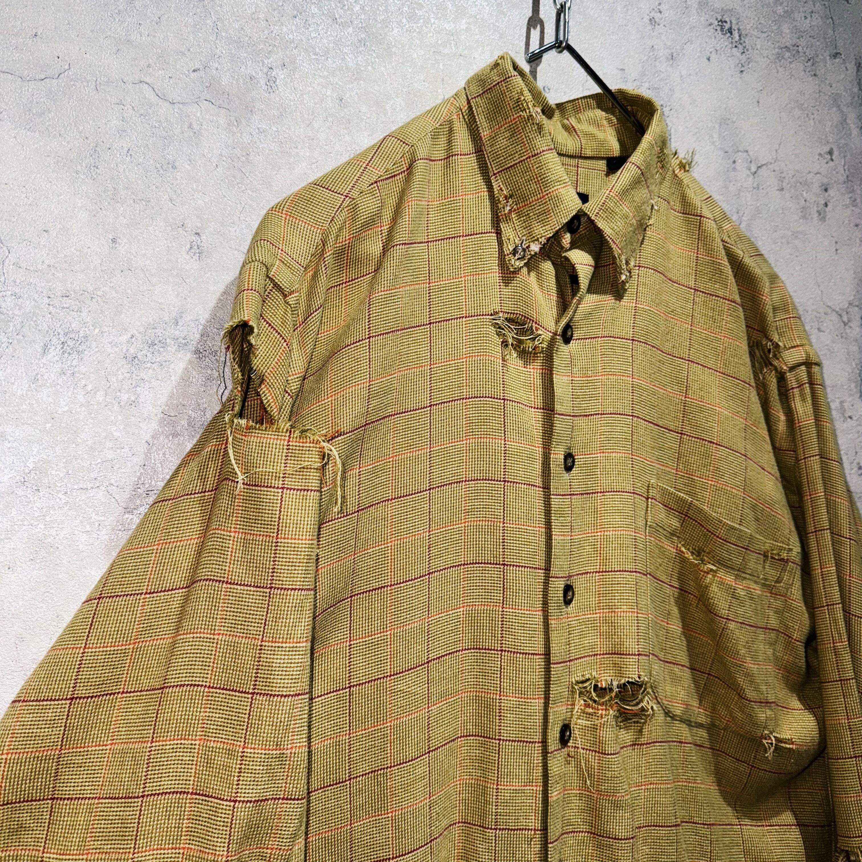バーバリーらしい暖色系でまとめたチェック柄を載せたクラシカルなデザインシャツを贅沢にボロカスタム。クラシカルな印象にダメージ特有のグランジさが融合し、唯一無二の存在へと変貌を遂げた一枚。