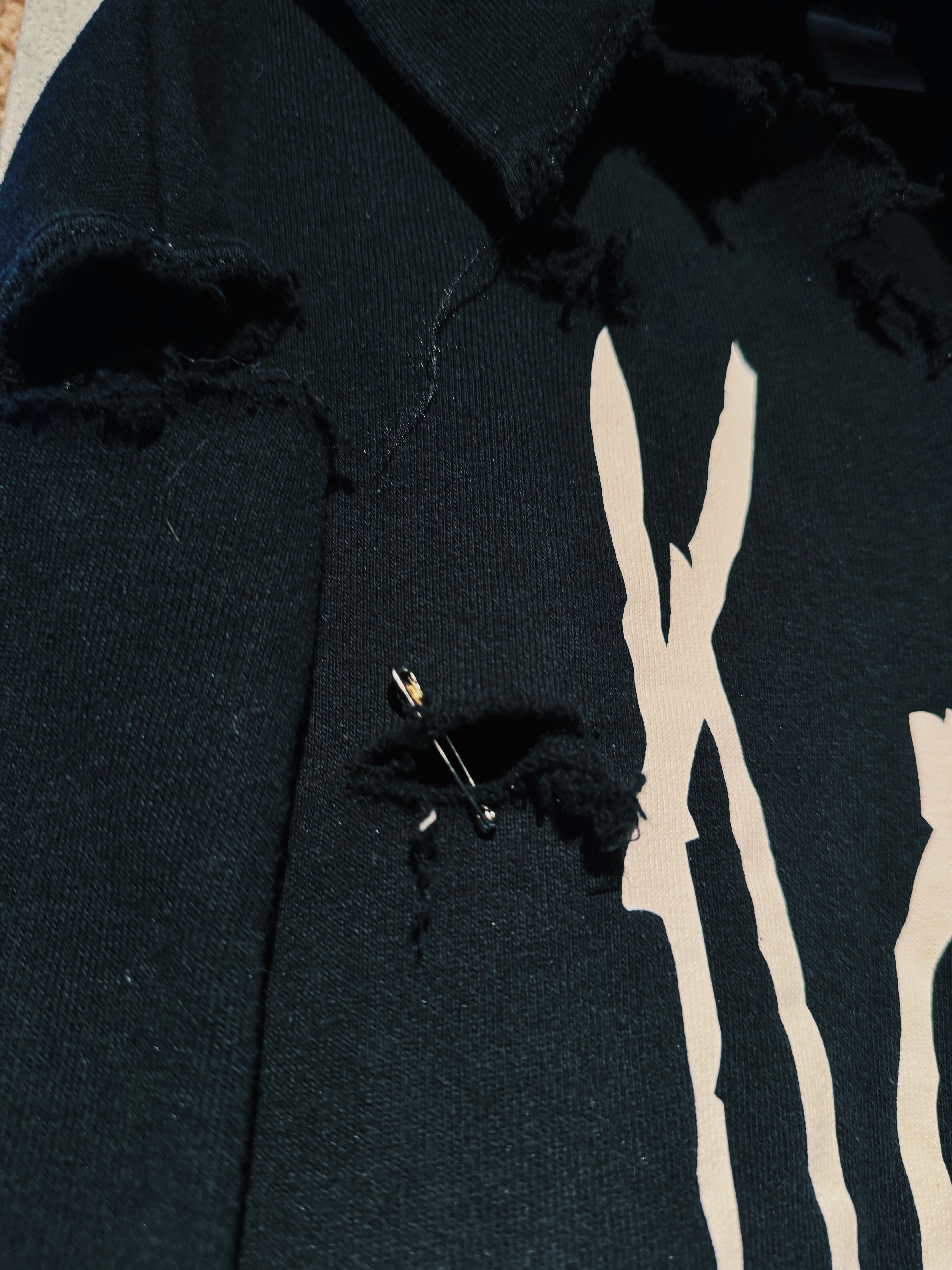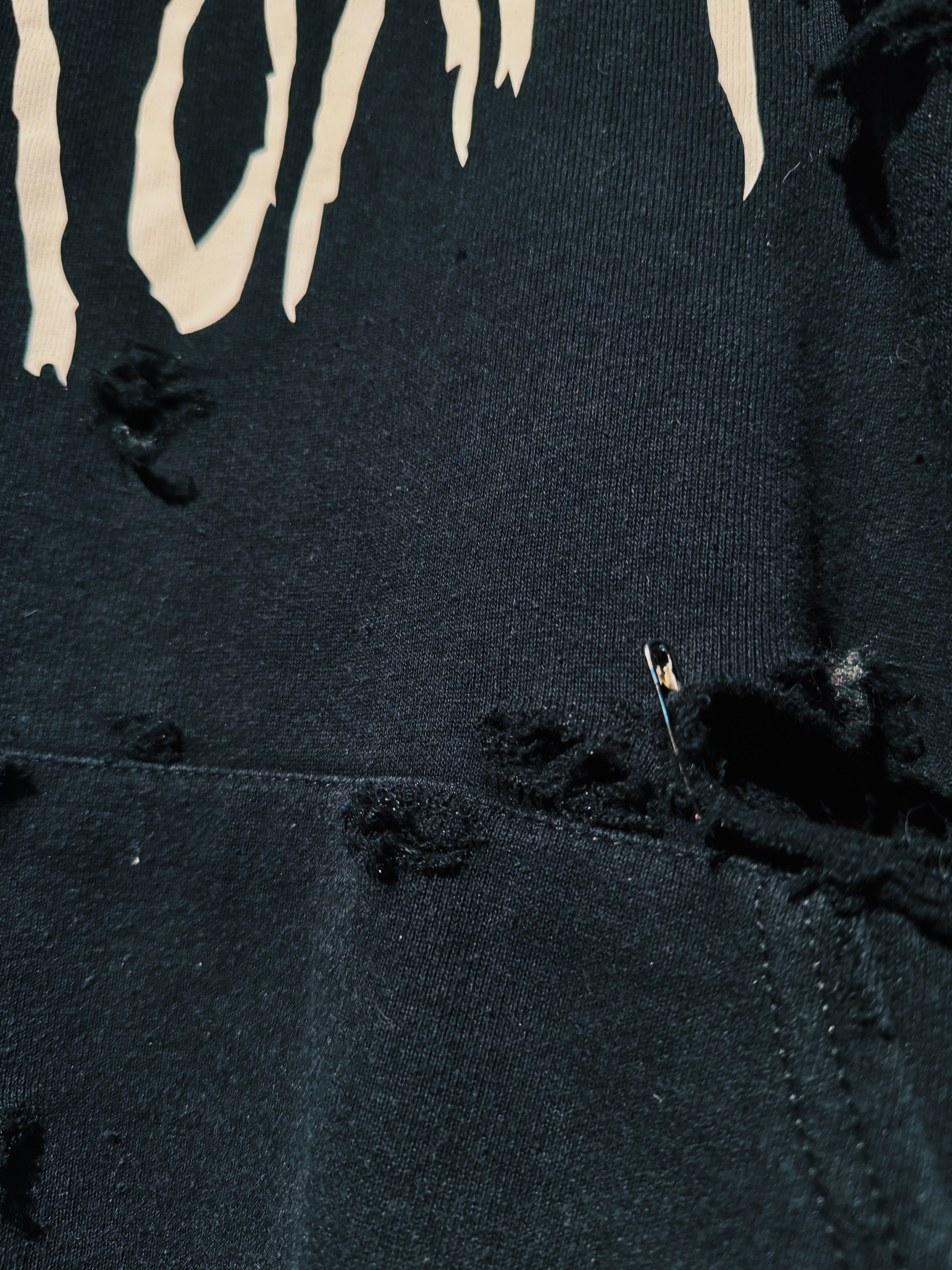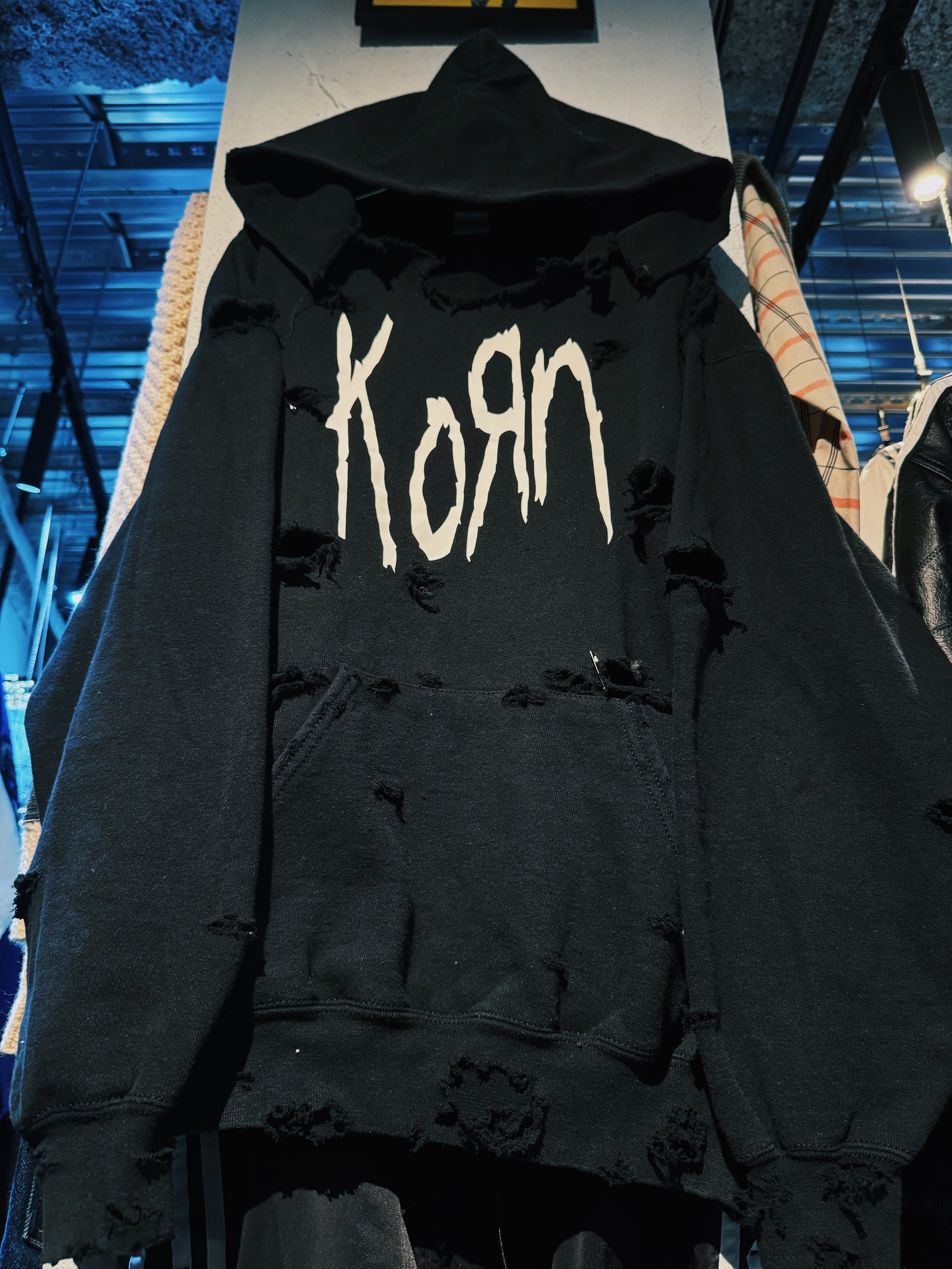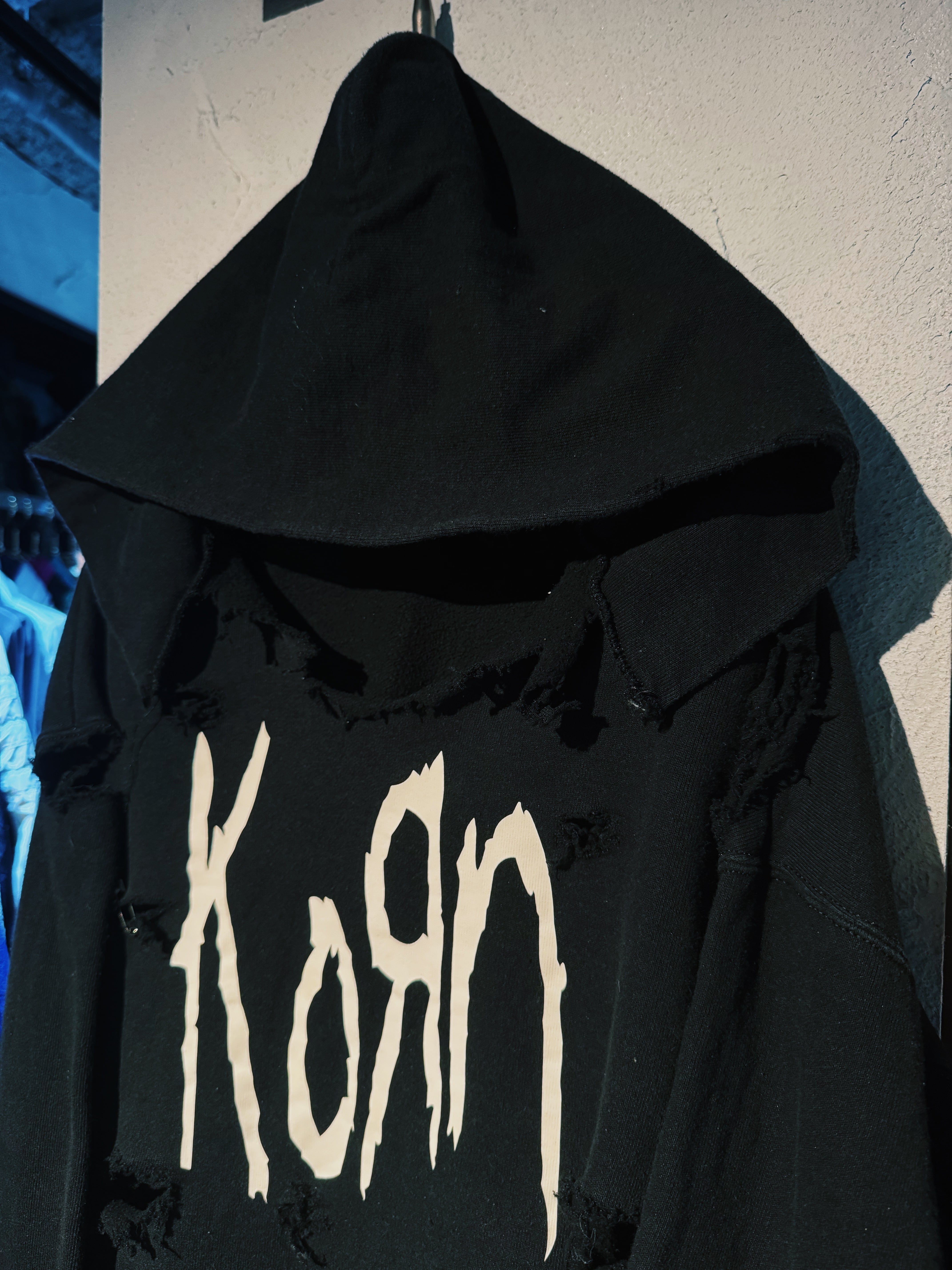 “Korn”のバンドジップパーカーを大胆にボロカスタムし、唯一無二の存在へと変貌を遂げたリメイクアイテム。