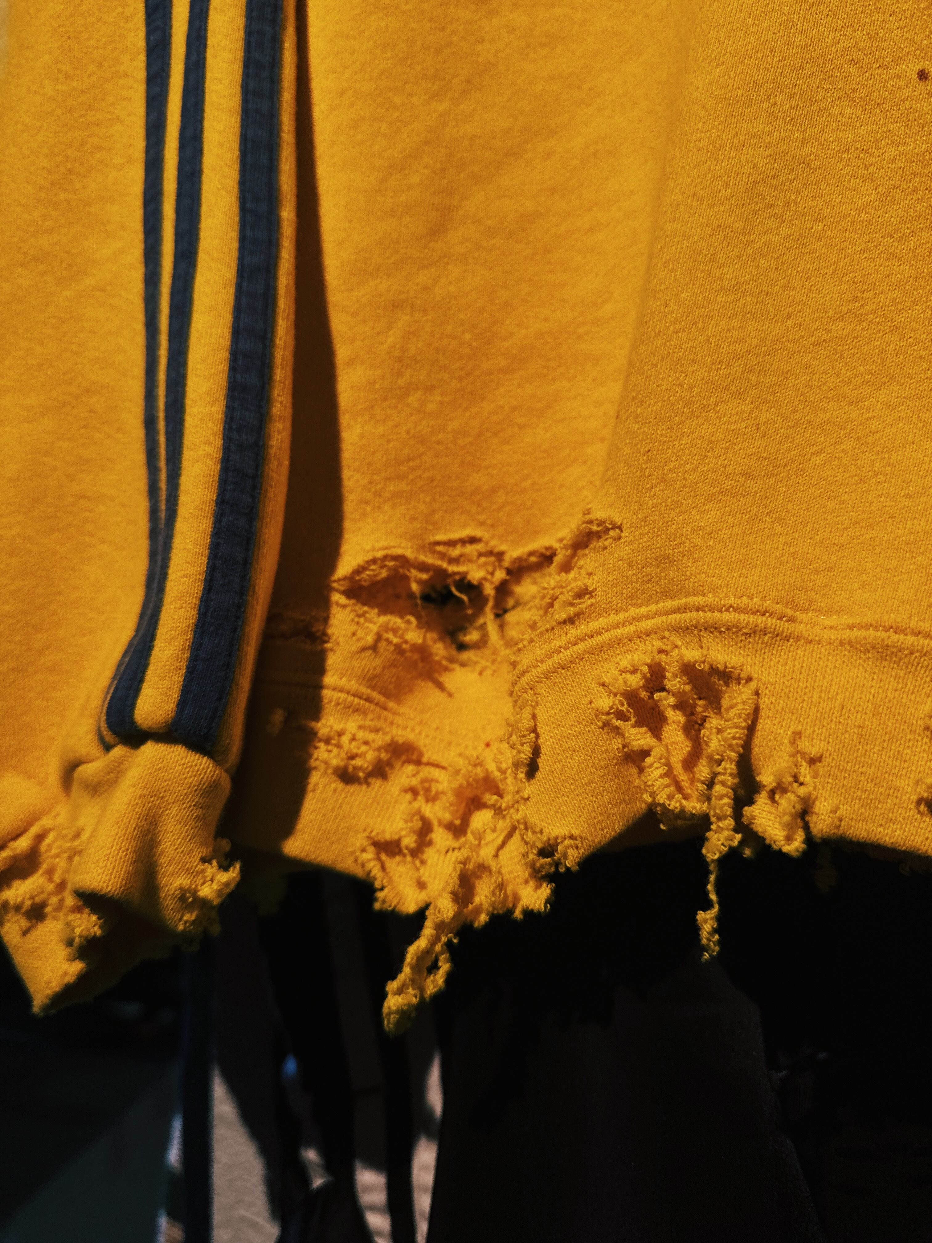 アディダスのスウェットを惜しげも無くボロカスタムした1着。カジュアルな着こなしをするのも良し、トラックパンツと併せてスポーツカジュアルなスタイリングにするのも良い。