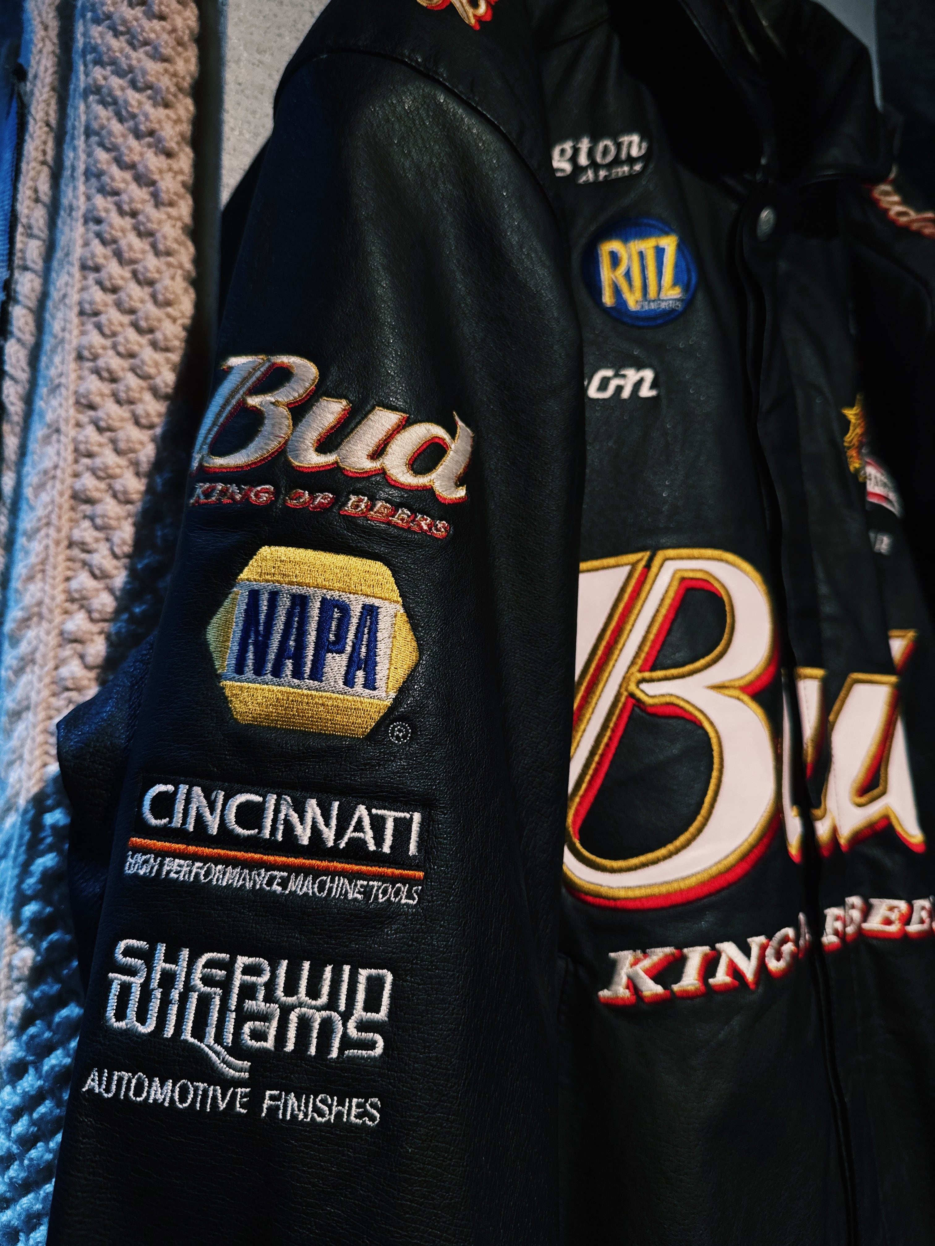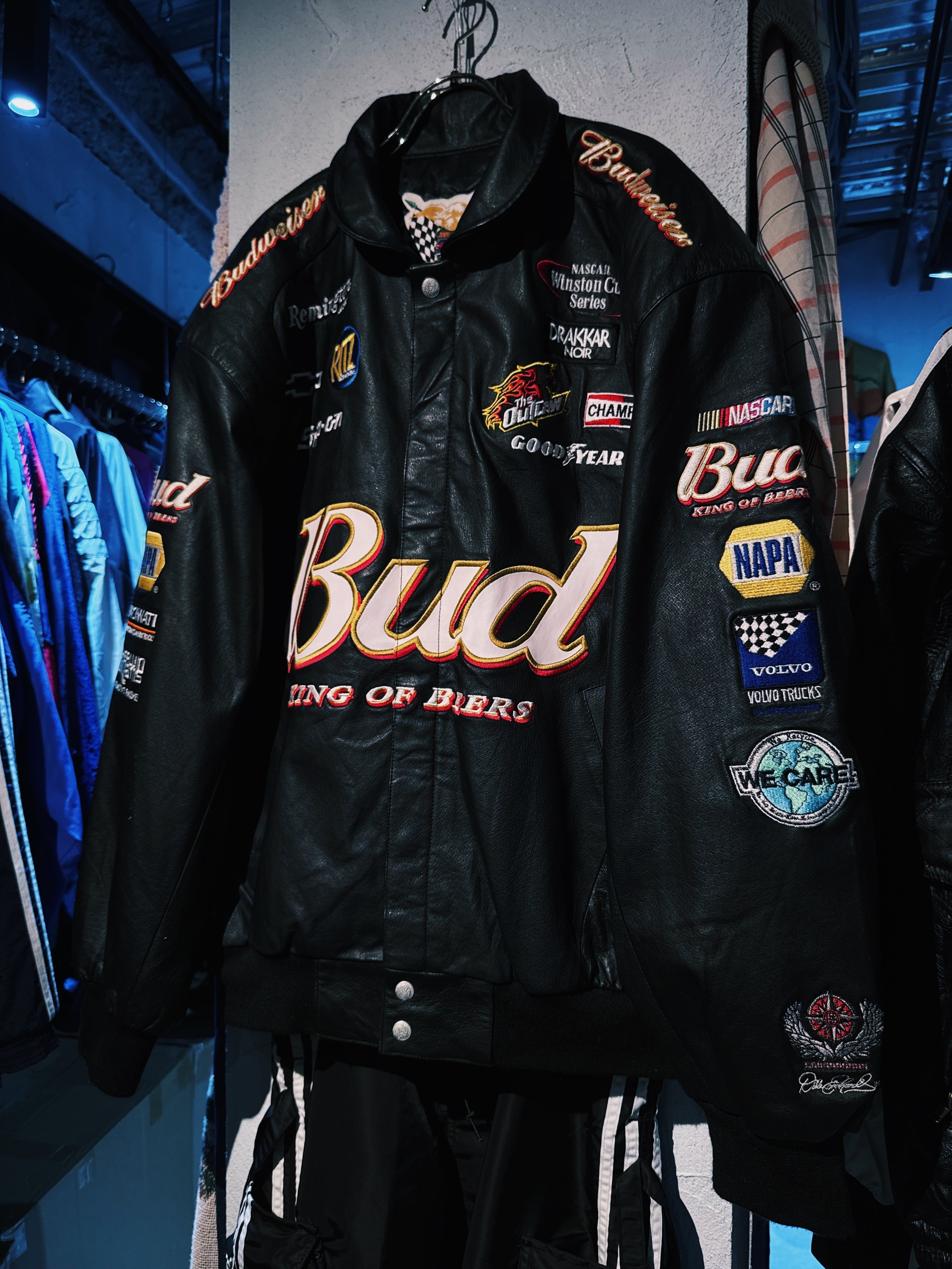 漆黒のボディにwrangler、championやNAPAなど様々なブランドやメーカーなどのワッペン&刺繍が加えられ、フロントとバックに大きくバドワイザーのロゴが刺繍された存在感を示すアイテム。